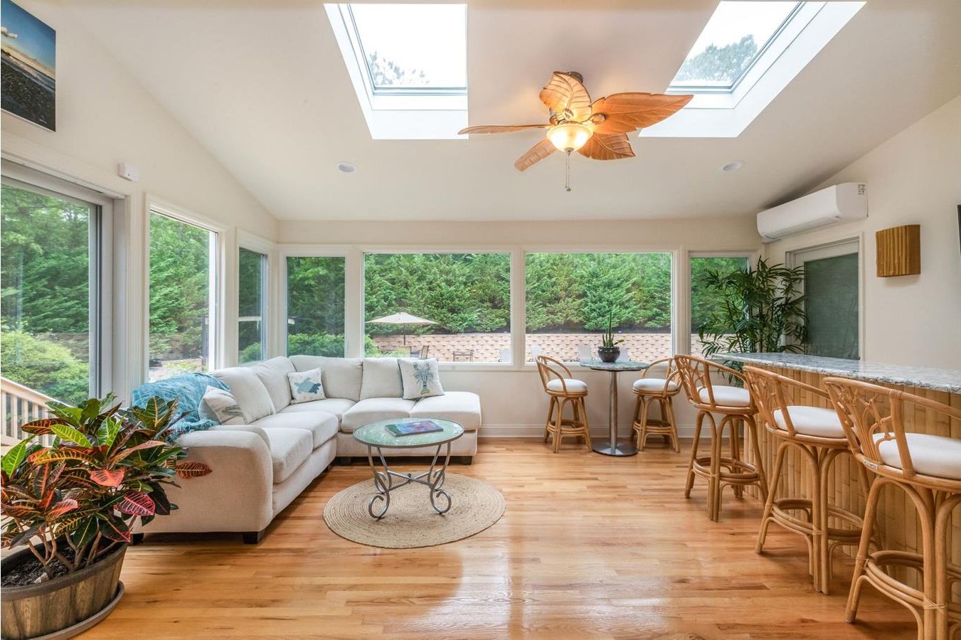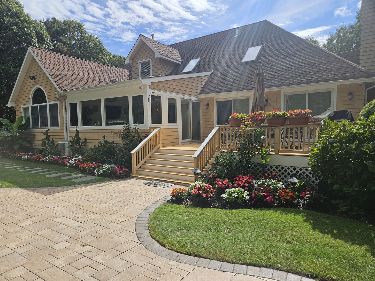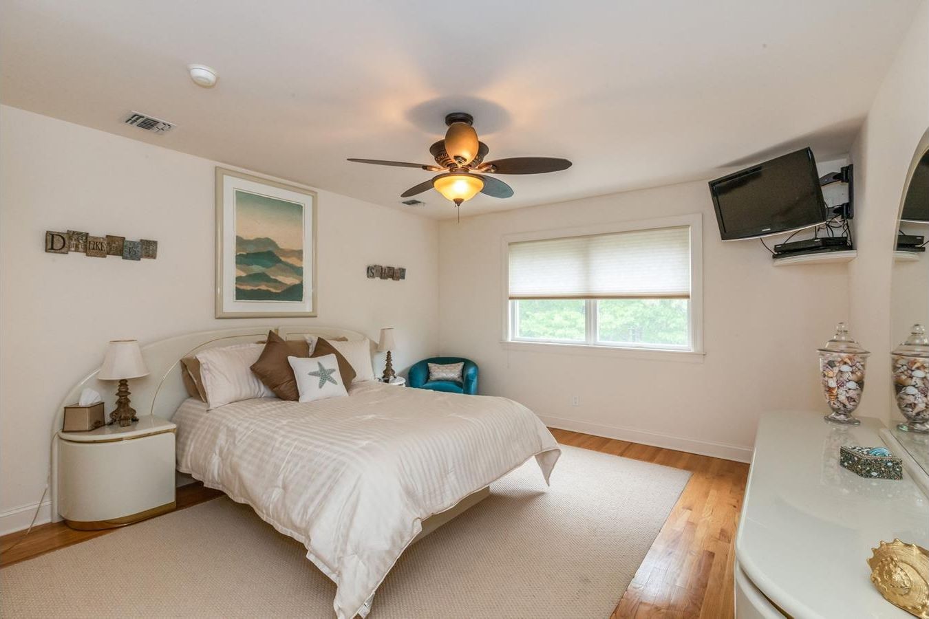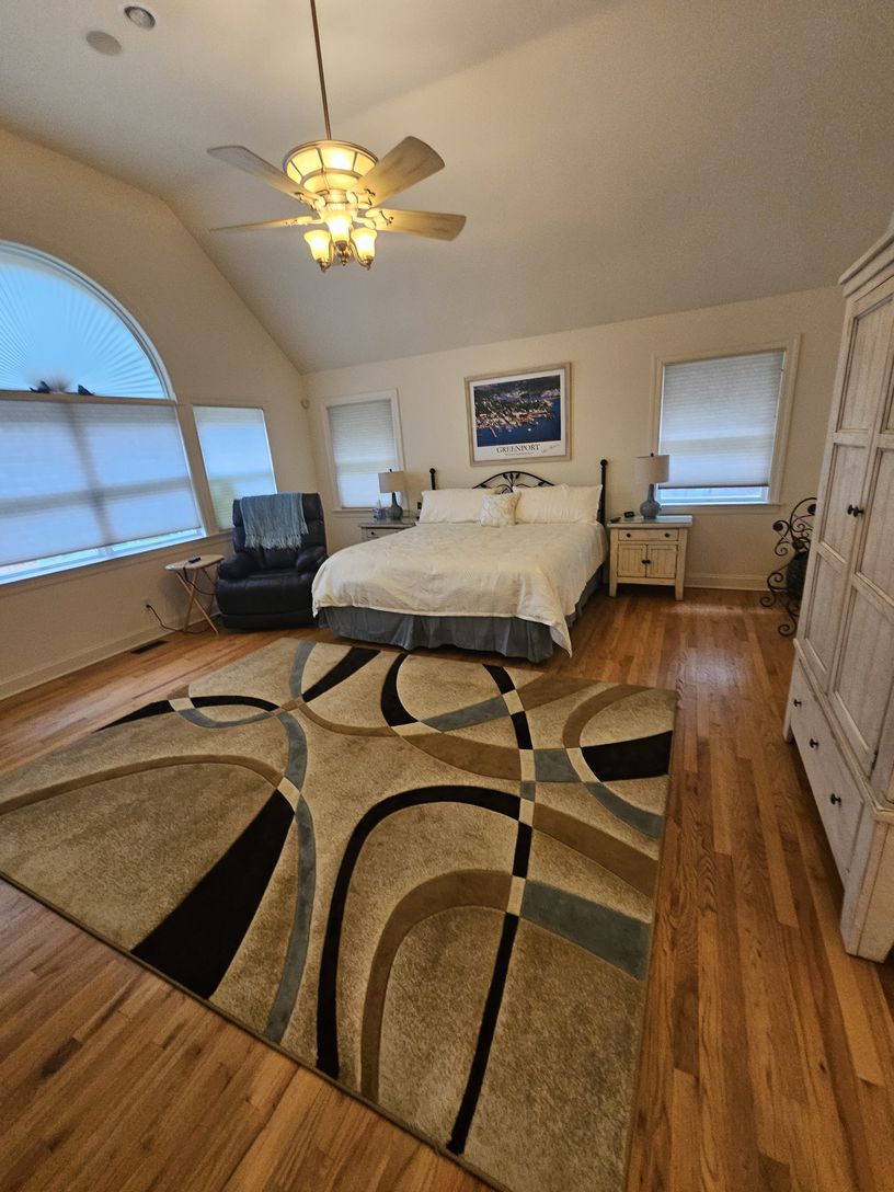 Enjoy the 2026 summer season in style from this 5-bedroom(4.5 bath) two story East Quogue home. It is on a very private 1 -acre Cul de sac property surrounded by a stately evergreen border ,and the Pine Barren's preserve. This home comfortably accommodates 10 guests with ample on-site parking . 5 spacious bedrooms with 2 Masters,3 located on first level with private full bath. Great room with open floor plan, vaulted ceilings and skylights cre