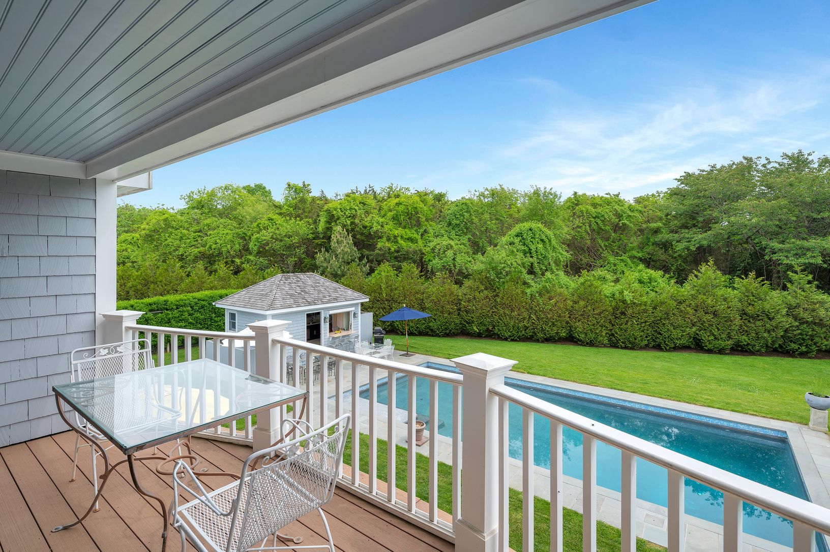 A pristine home with an open floor plan and high ceilings filled with natural light is available in the Amagansett Lanes. Generously configured living and dining spaces along with three guest rooms and a studio apartment on the first level. The spacious primary suite on the second level has two walk-in closets and a private balcony. Designed for easy indoor/outdoor living and entertaining in Hampton style. This graceful home is quietly set bac