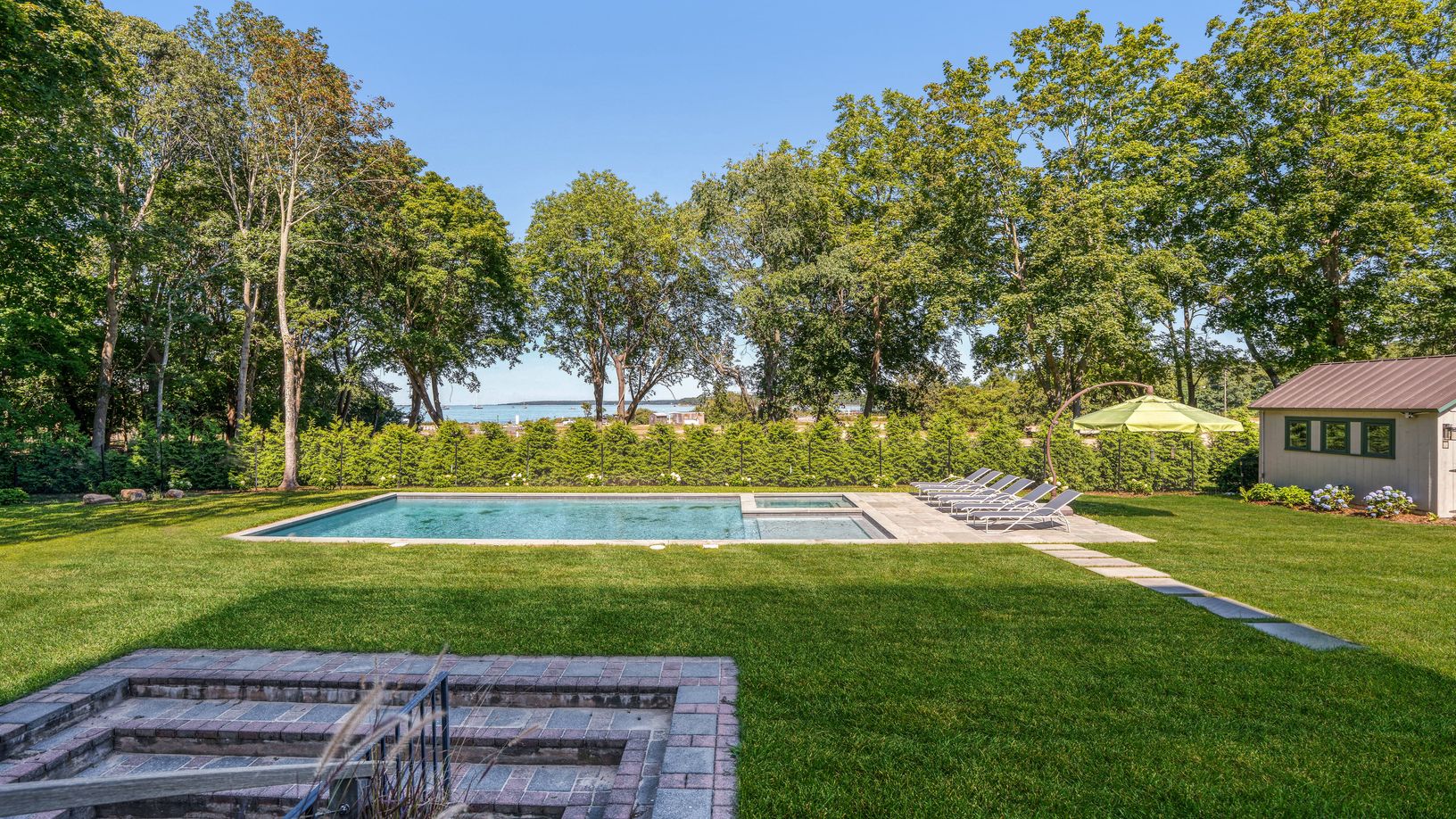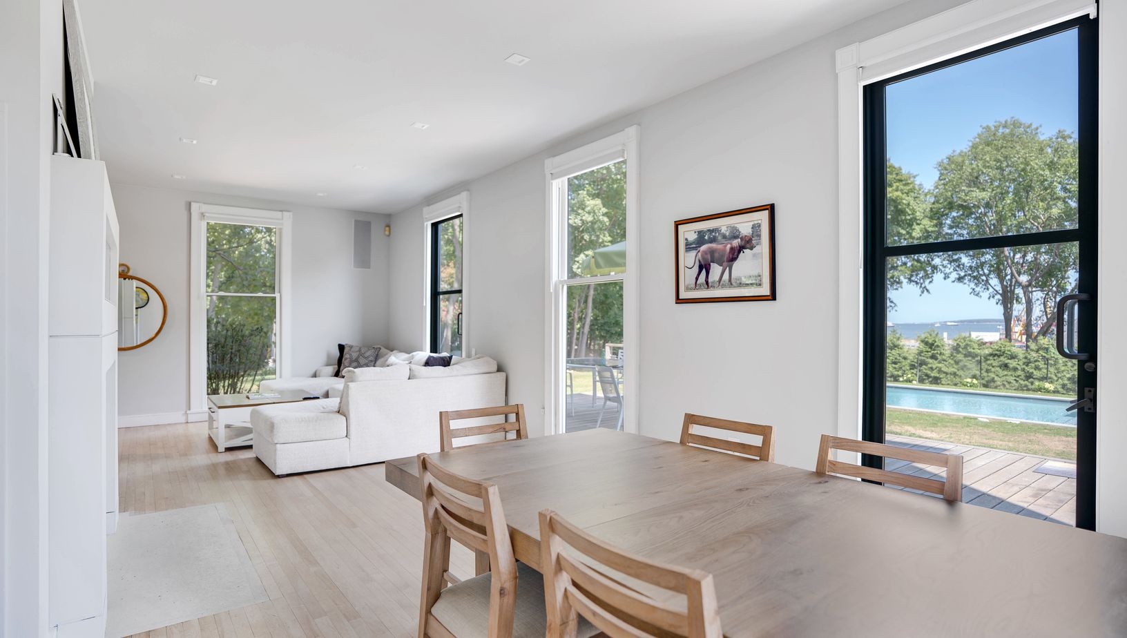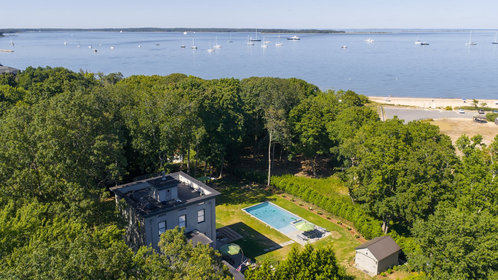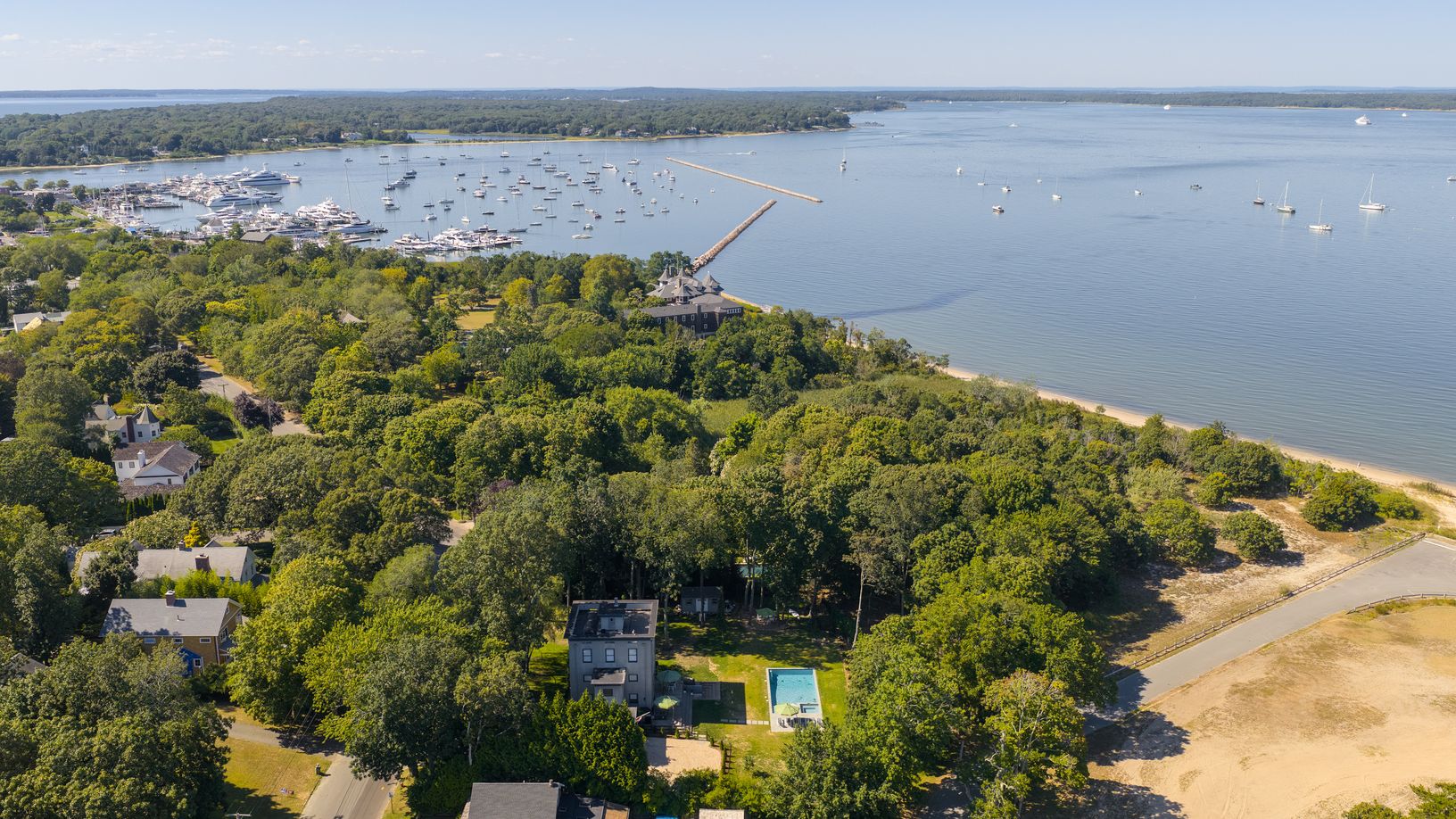 Overlooking Havens Beach with a 450 foot path to Sag Harbor Bay and pristine, sandy beaches, this 3 bedroom Sag Harbor Village beach house has bright, voluminous interiors with French doors to the expansive al fresco dining deck and waterside, heated, gunite pool. With stunning views of the beach, bay, and boats beyond, floor to ceiling windows and a roof deck frame the lush 0.81 acre