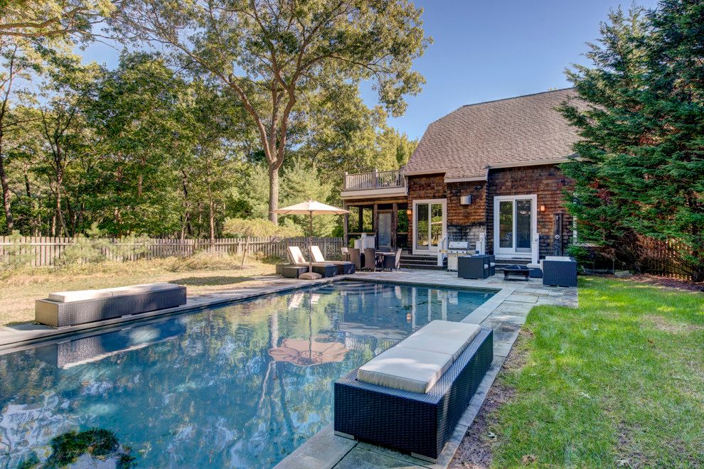 Located in the very near-Northwest, this 4 bedroom, 5 bath home is only minutes from the village and beaches of East Hampton. The light filled living room leads out to a spacious screened in porch overlooking a heated gunite pool and nicely landscaped lawn. There is also a great room with kitchen/dining area that melds into a media gathering area. A bedroom/den with bath complete the first floor. Upstairs, there are 3 en suite bedrooms with th