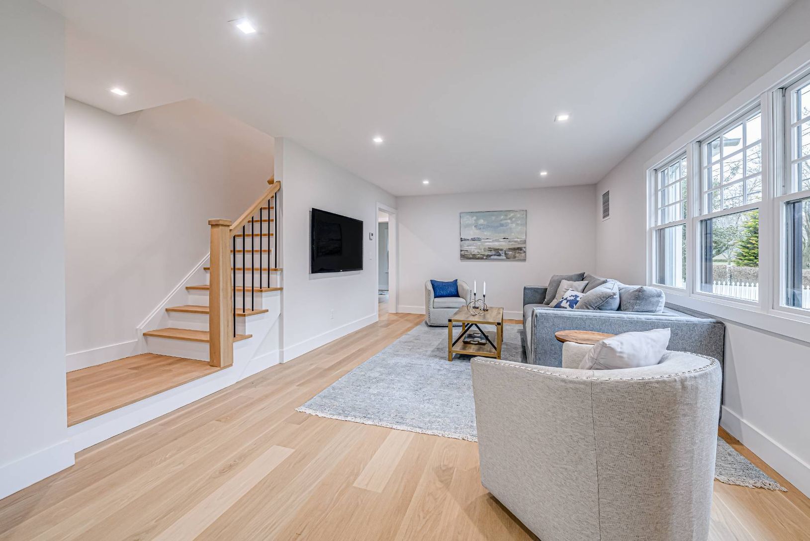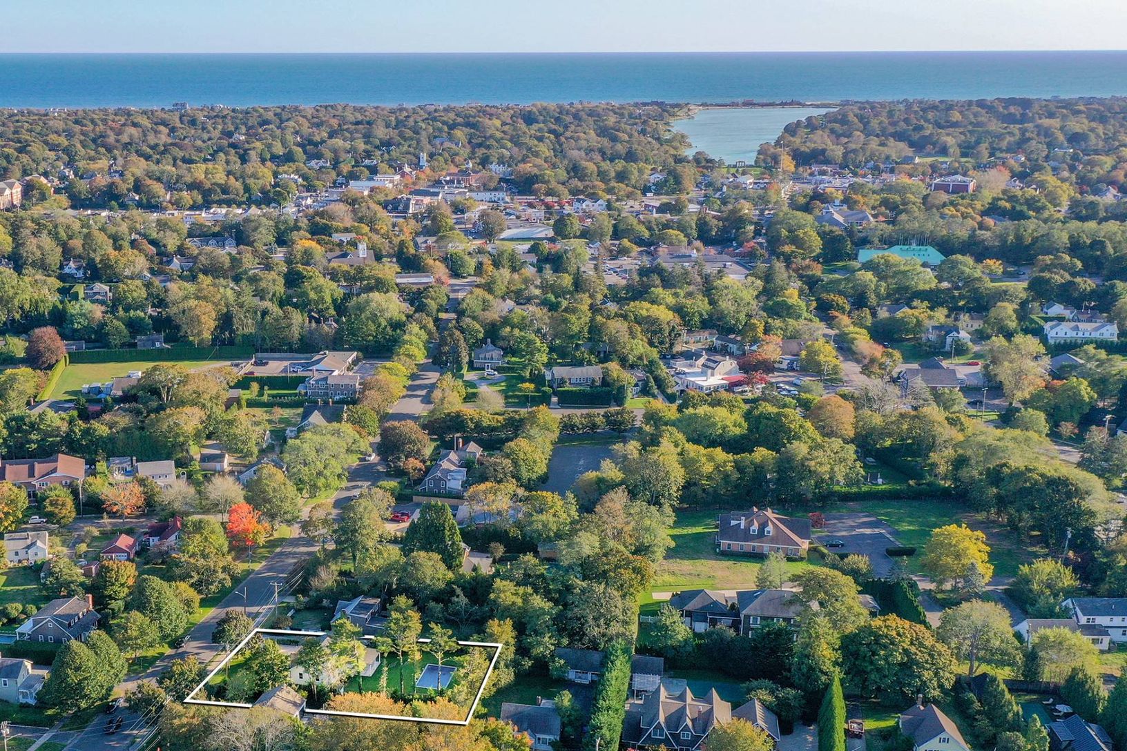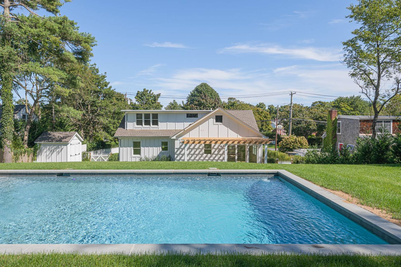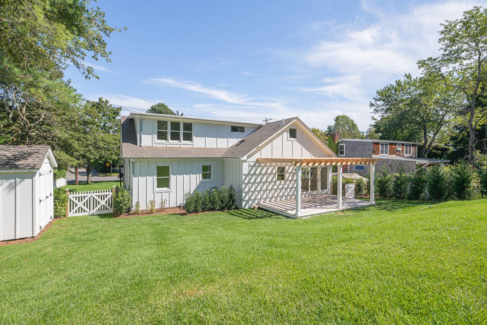 Just renovated from top to bottom, this stylish honey of a home is your move-in-ready retreat in the very center of Southampton Village. The generous front yard brings you to a covered porch and into a sunny foyer that leads either to the open-plan dining area and fully equipped kitchen flowing out to the pergola-shaded mahogany deck, or to the smartly designed living room with two ample bedrooms beyond. Upstairs, the primary suite overlooks t