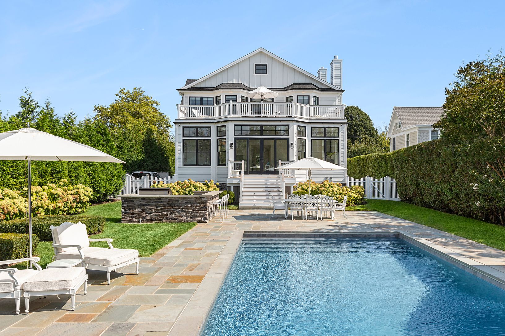 Meticulously crafted in 2021, this Westhampton Beach residence epitomizes luxury living in the heart of the Village. Nestled on +/- 0.5 acre on prestigious Beach Lane, this compound features a 5-bedroom, 6.5-bathroom main house, a 3-bedroom, 2-bathroom guest house, heated, gunite, saltwater pool, outdoor kitchen, and cozy outdoor fireplace amidst exquisite flowering gardens. The grandeur begins with formal living and dining areas, open to a gr