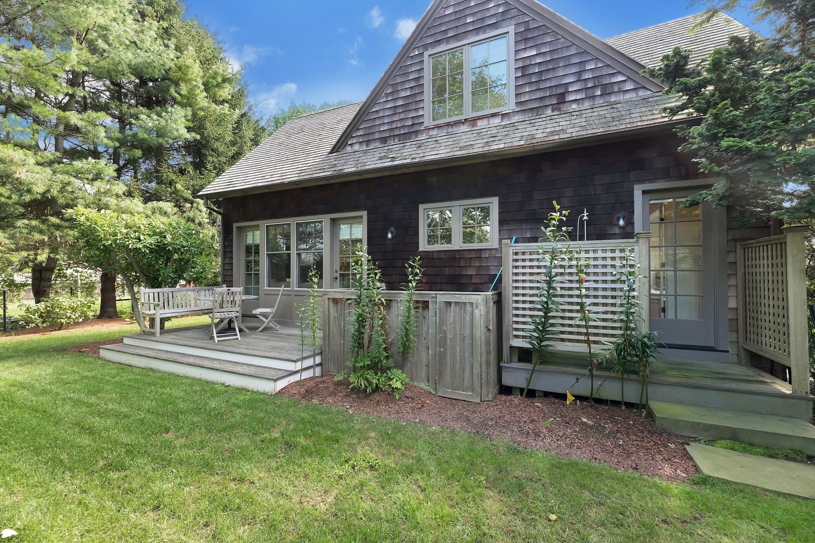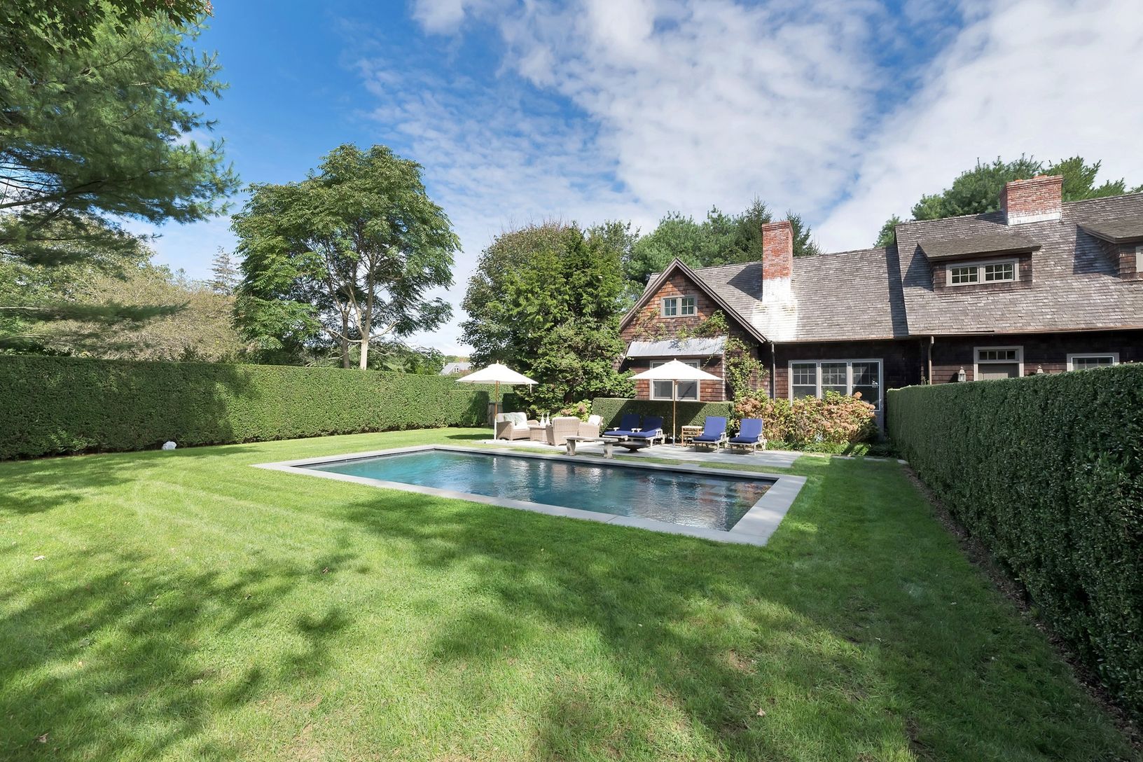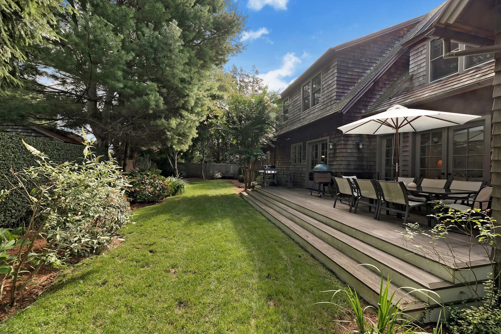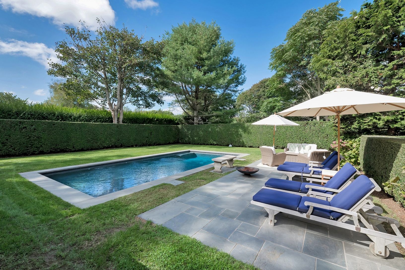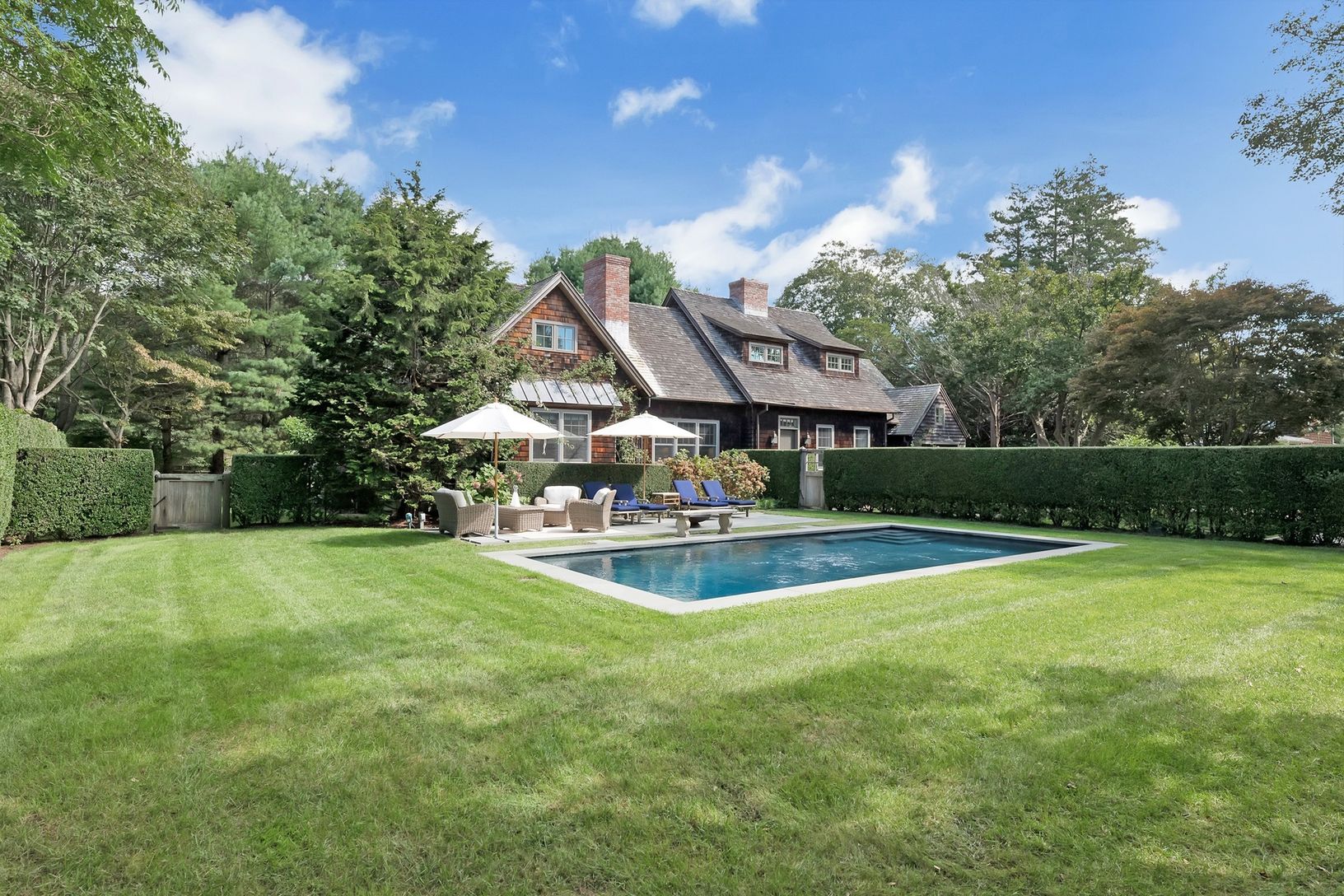 Close to everything yet tucked away at the end of a privet lined driveway at 13 Cooper Lane, East Hampton, NY. Four bedrooms and three and a half baths. Ground floor primary with twin walk-in closets, double vanities, air jet soaking tub, access to outdoor shower and pool area. Primary bedroom with cathedral ceilings and doors to west facing mahogany deck. Large chef's kitchen equipped with Sub-Zero, Wolf and Bosch appliances, wine fridge and