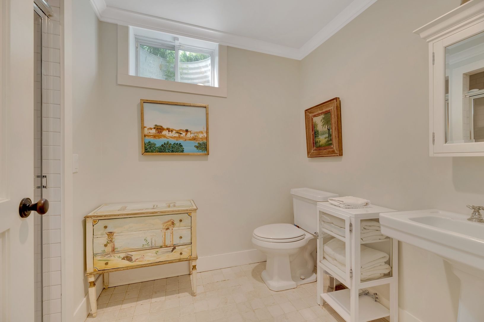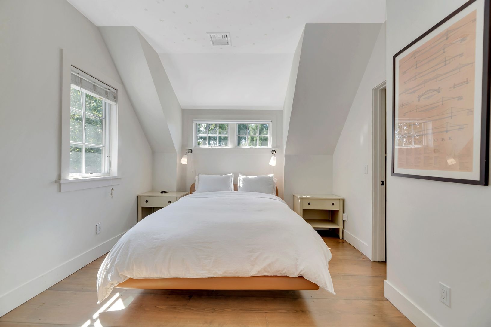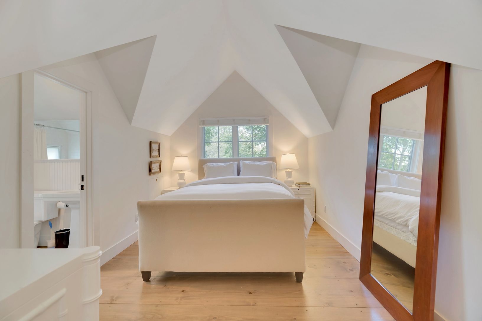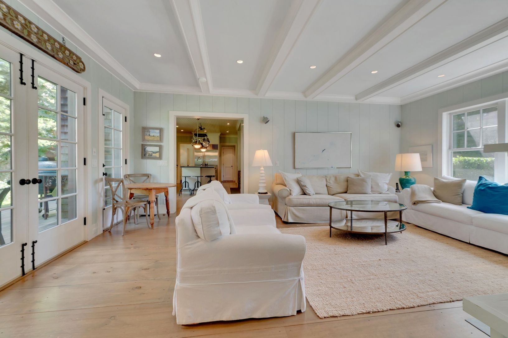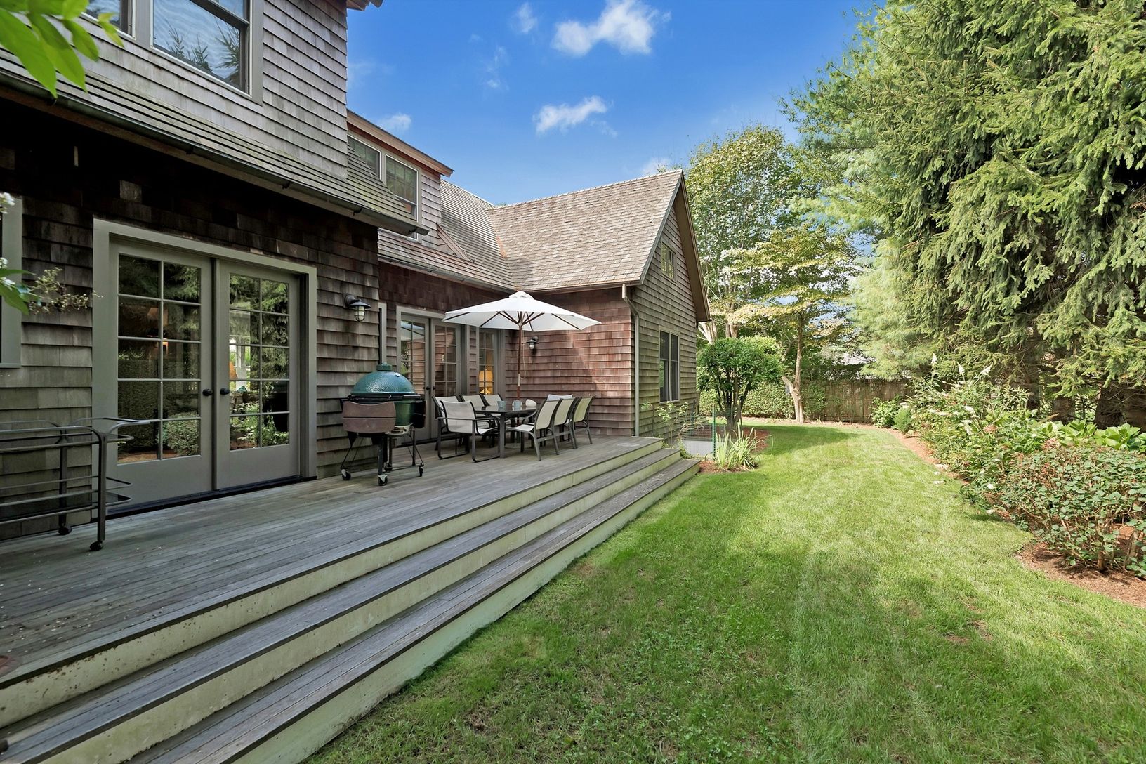Close to everything yet tucked away at the end of a privet lined driveway at 13 Cooper Lane, East Hampton, NY. Four bedrooms and three and a half baths. Ground floor primary with twin walk-in closets, double vanities, air jet soaking tub, access to outdoor shower and pool area. Primary bedroom with cathedral ceilings and doors to west facing mahogany deck. Large chef's kitchen equipped with Sub-Zero, Wolf and Bosch appliances, wine fridge and