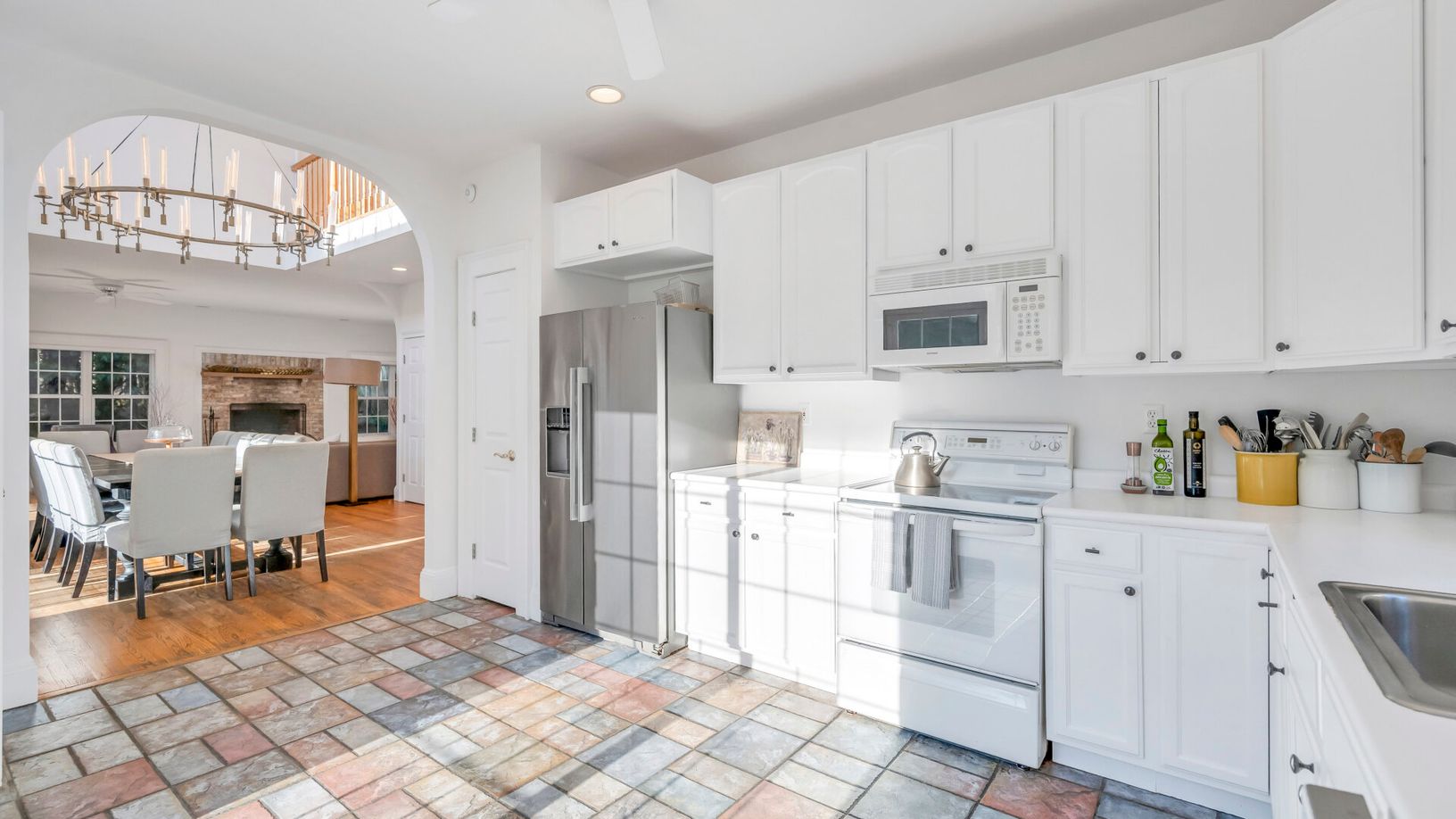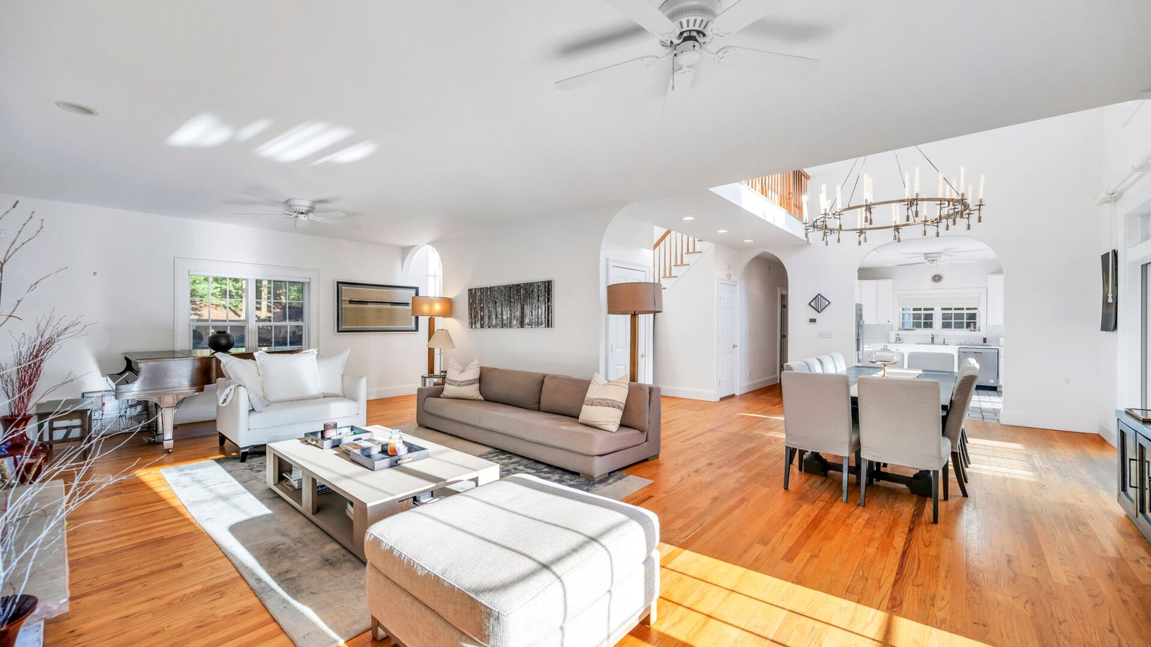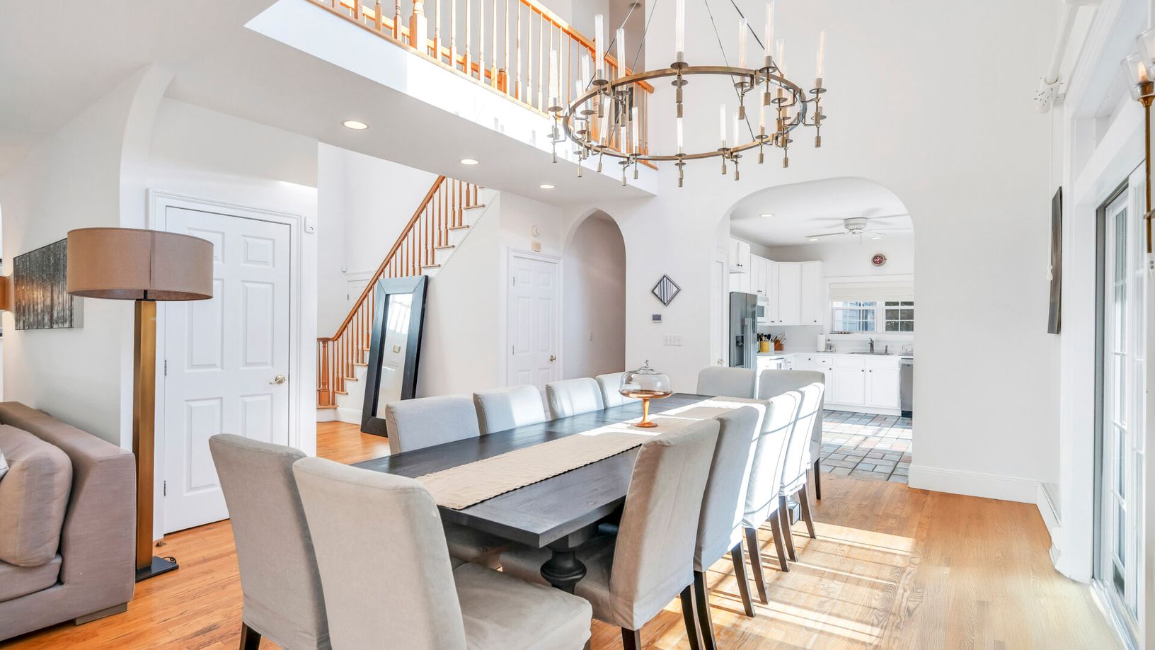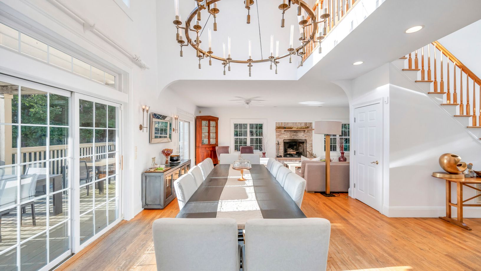 The spacious first floor features a double-height foyer, a large open living room with a fireplace, a dining area, and