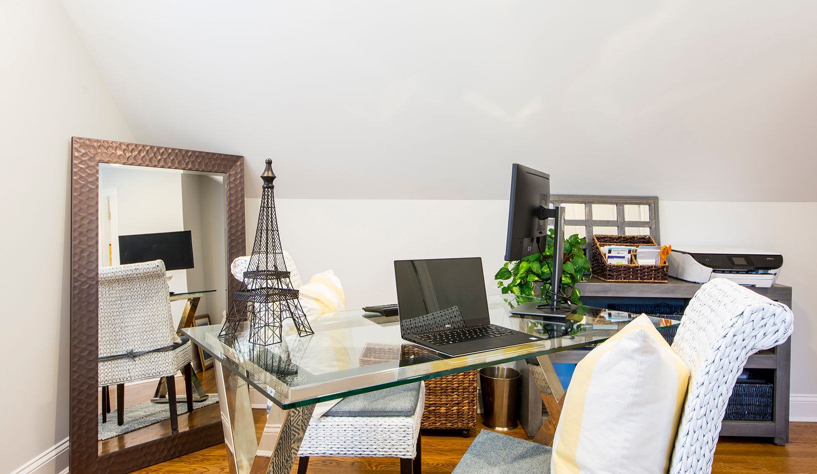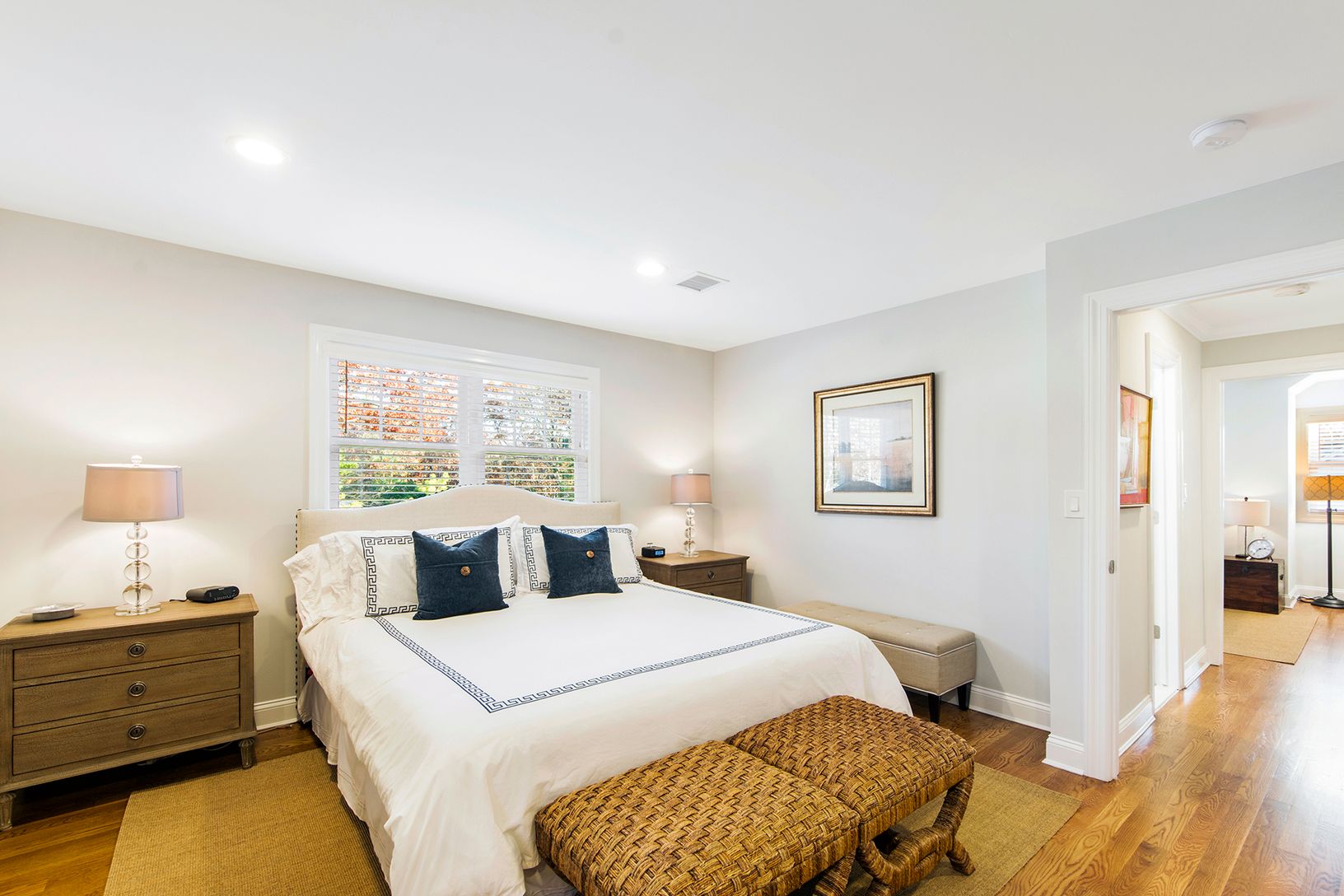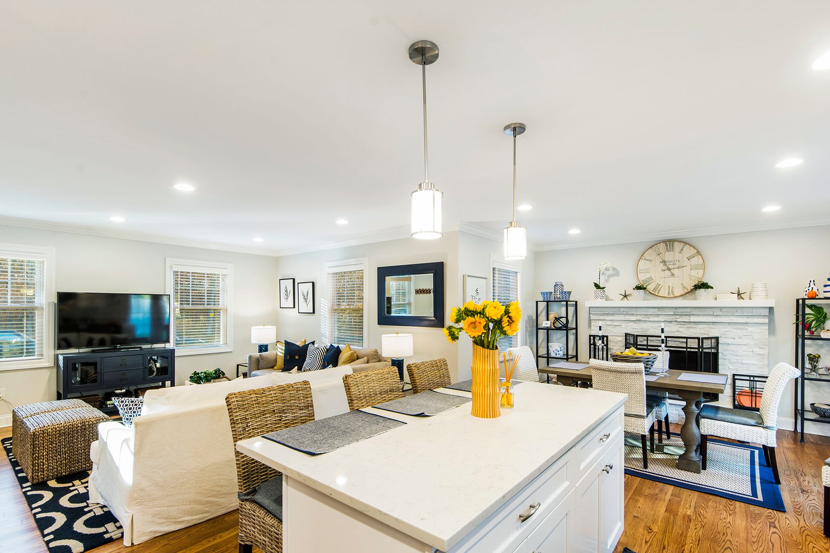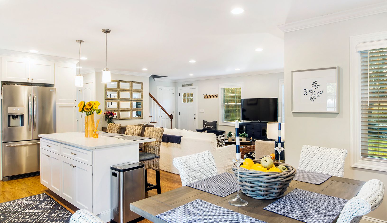 Beautifully Renovated and Professionally Decorated East Quogue Home. New Hardwood floors throughout this Open Concept Living, Dining, Kitchen area with exquisite Quartz Island perfect for entertaining. Updated Kitchen with New Stainless-Steel Appliances and Hunter Douglas white wood blinds throughout. Main Floor also has Two ample sized bedrooms and a full updated bath, giving you plenty of closets and storage spaces abound. The second-floor