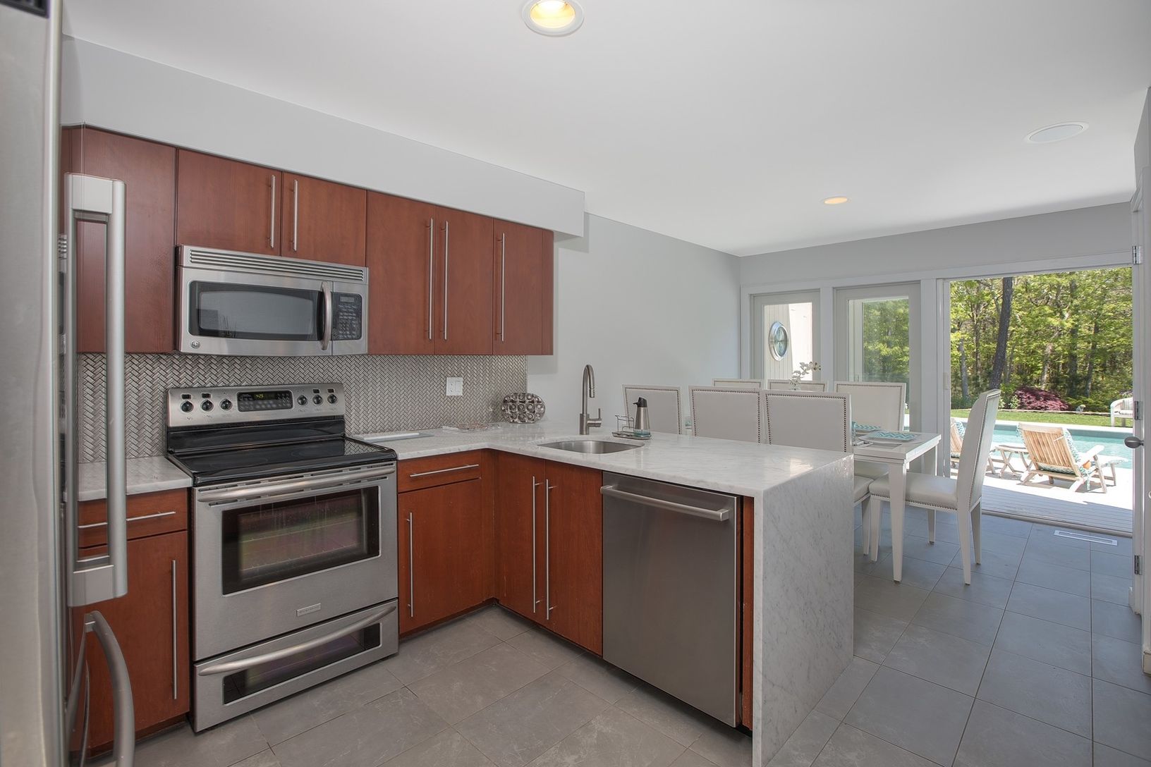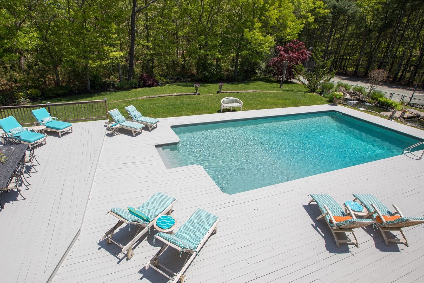Updated contemporary on 1.8 acres of professionally landscaped property. Enjoy sprawling park like setting complete with Har Tru tennis court, pool, koi pond and extensive decking. Eat in Kitchen has modern cabinetry, stainless appliances and stone counter tops. Living room features soaring ceilings, wall of windows and a fireplace. First floor master suite, powder room and game room. Additional 3 bedrooms and 2 baths upstairs. Baths are al