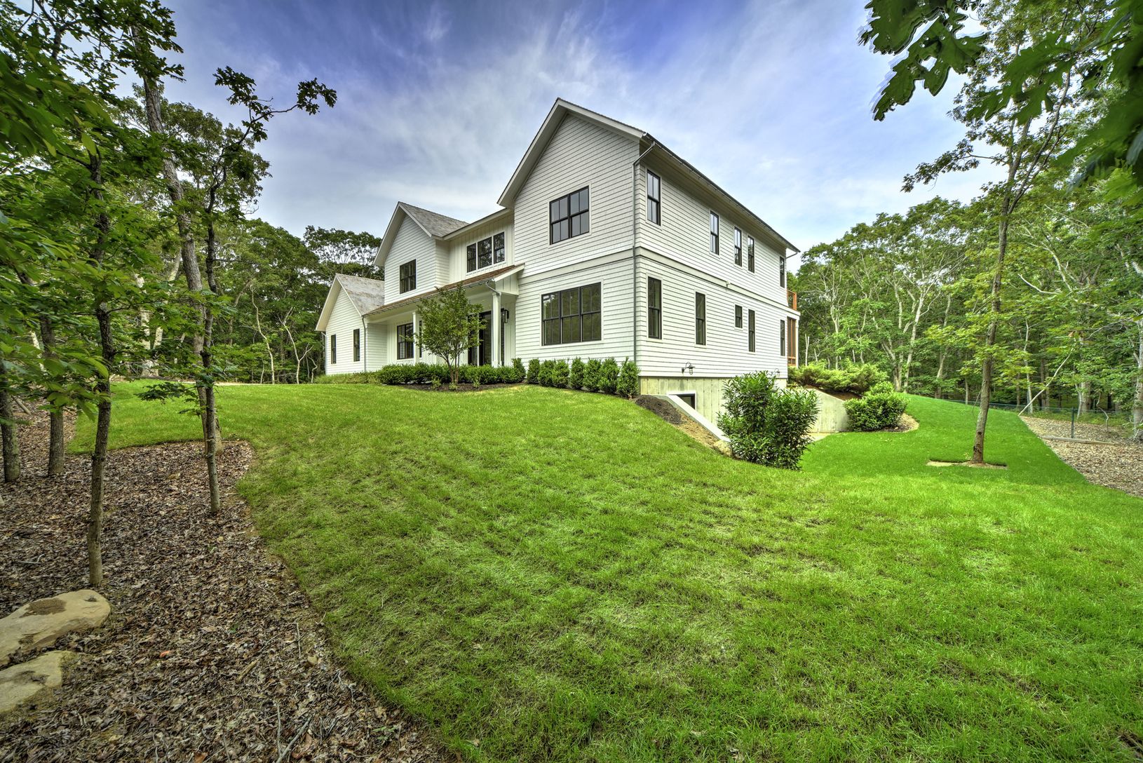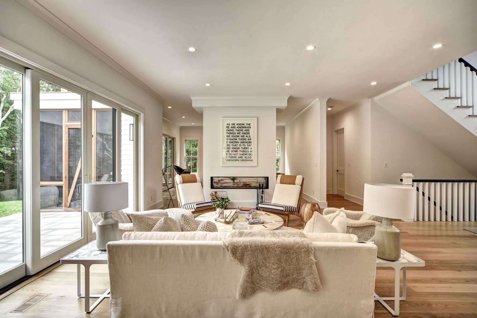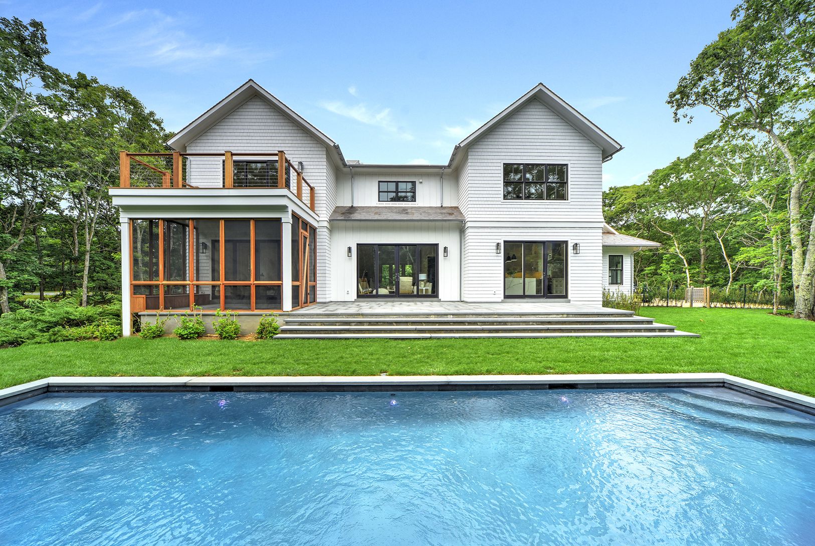 Sited on a private acre in Amagansett North this newly completed transitional style residence offers 4,300+/- sf of finished living space with an additional 2,000+/- sf fully finished lower level. There are six bedrooms with the possibility of a seventh in the lower level, six full and one half baths and a screened-in porch overlooking pool. The grand double-height foyer leads to a light filled great room with a pass-through fireplace shared b