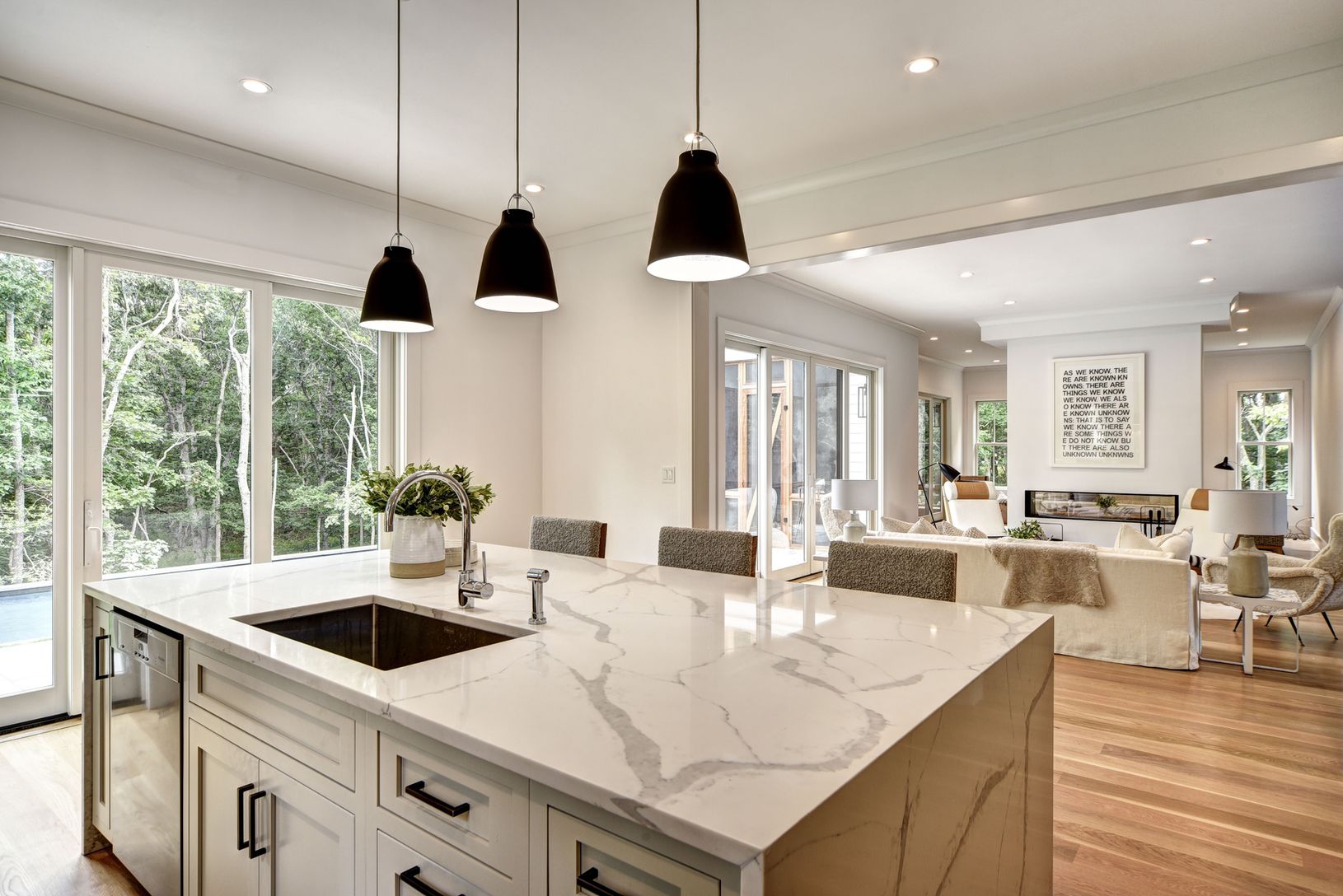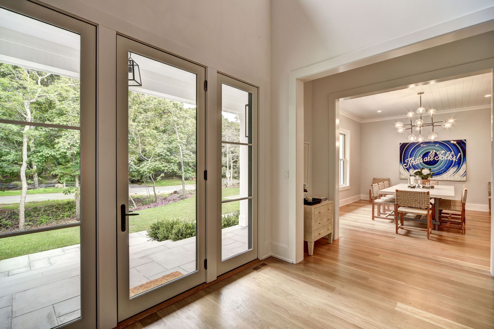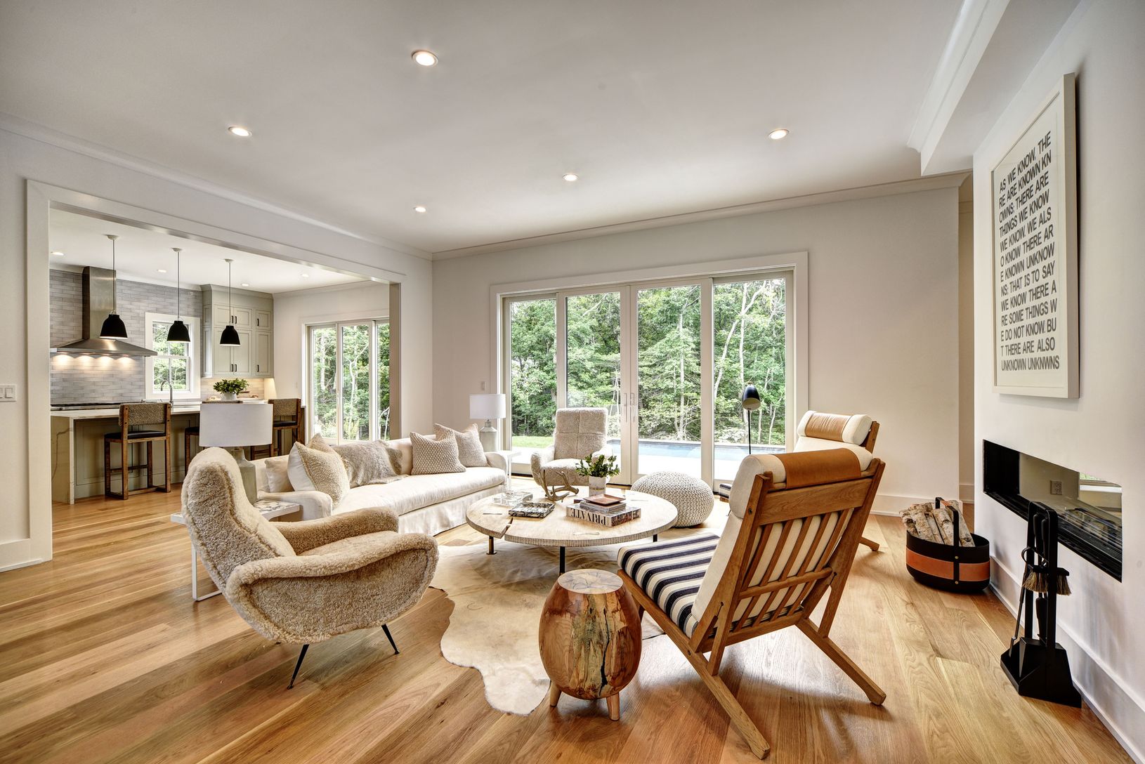 Sited on a private acre in Amagansett North this newly completed transitional style residence offers 4,300+/- sf of finished living space with an additional 2,000+/- sf fully finished lower level. There are six bedrooms with the possibility of a seventh in the lower level, six full and one half baths and a screened-in porch overlooking pool. The grand double-height foyer leads to a light filled great room with a pass-through fireplace shared b