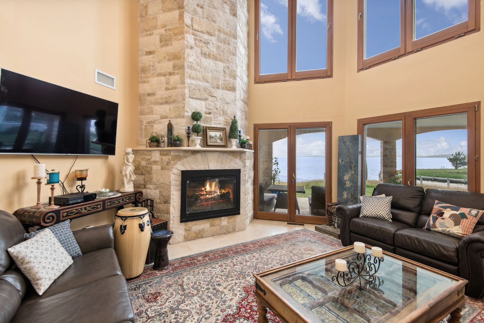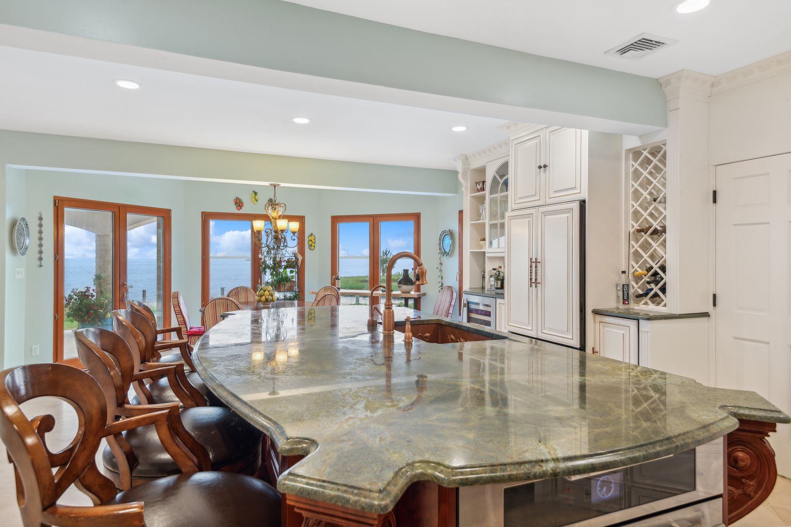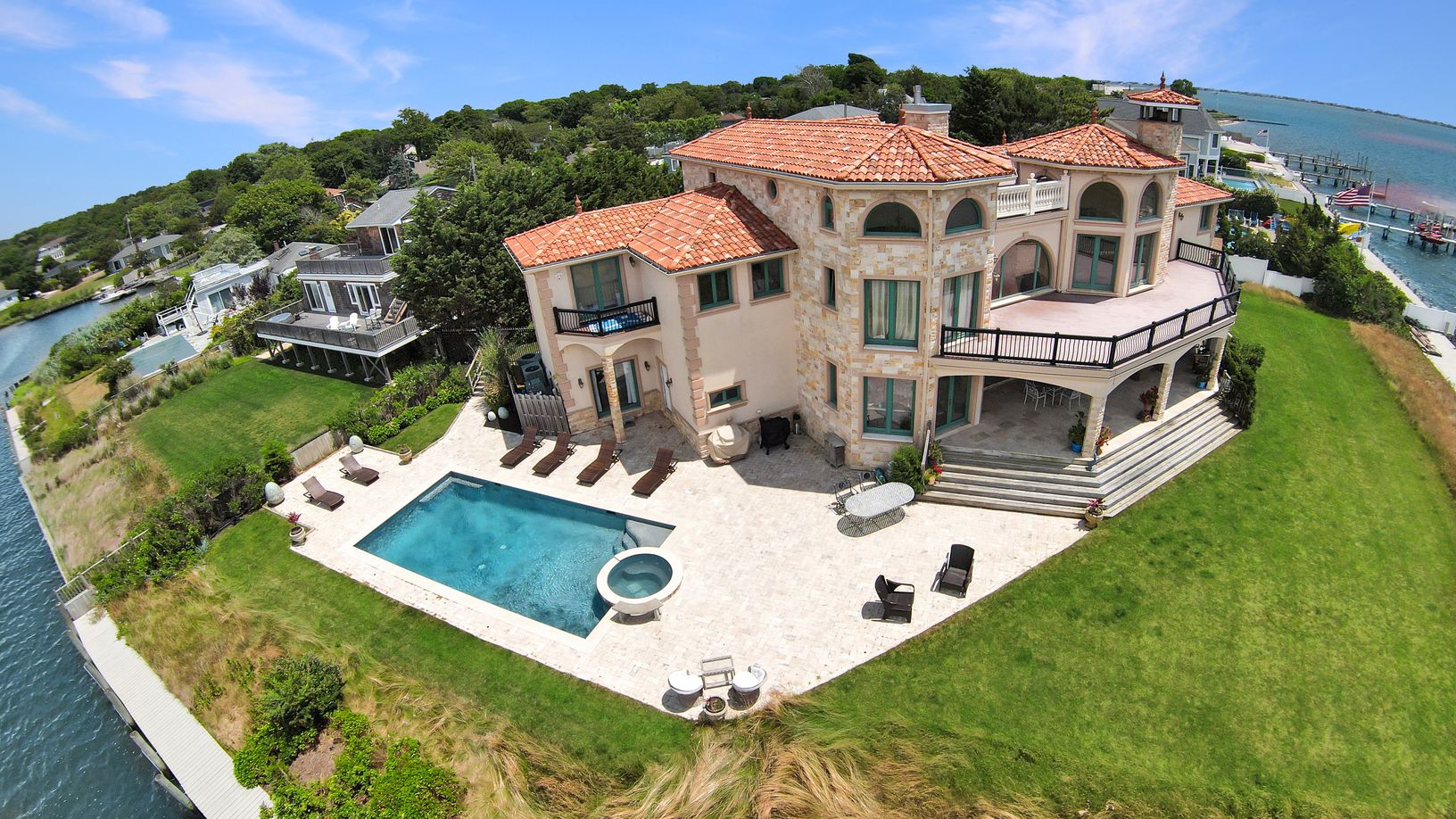 This stunning Mediterranean-style waterfront home is the perfect summer retreat, offering breathtaking views over Moriches Bay. Designed with elegance and comfort in mind, the open-concept layout seamlessly blends indoor and outdoor living. The main level features a spacious gourmet kitchen that flows into the dining area, and a bright, large great room with soaring ceilings and fireplace. Expansive glass doors lead to multiple decks, a patio,