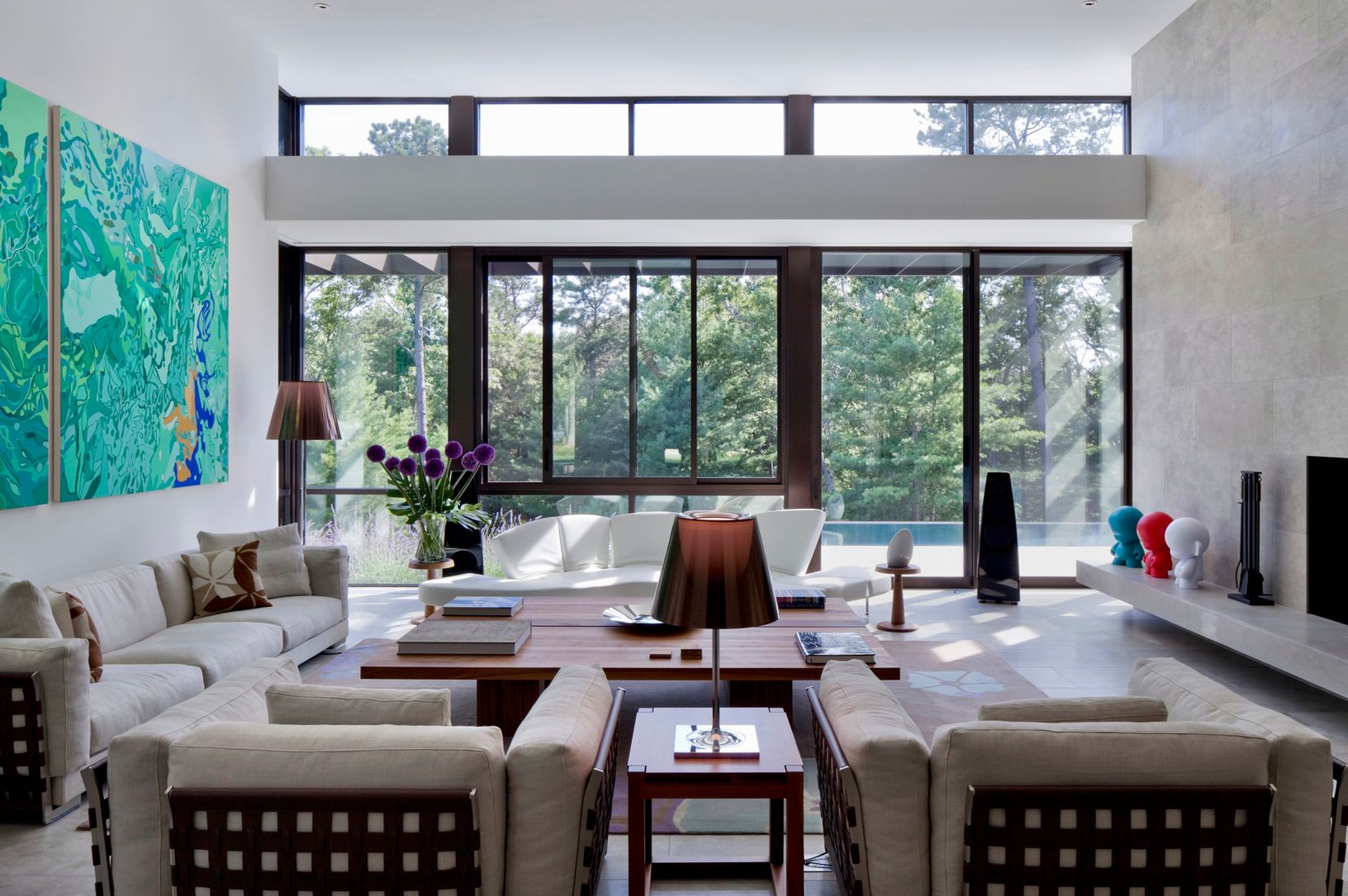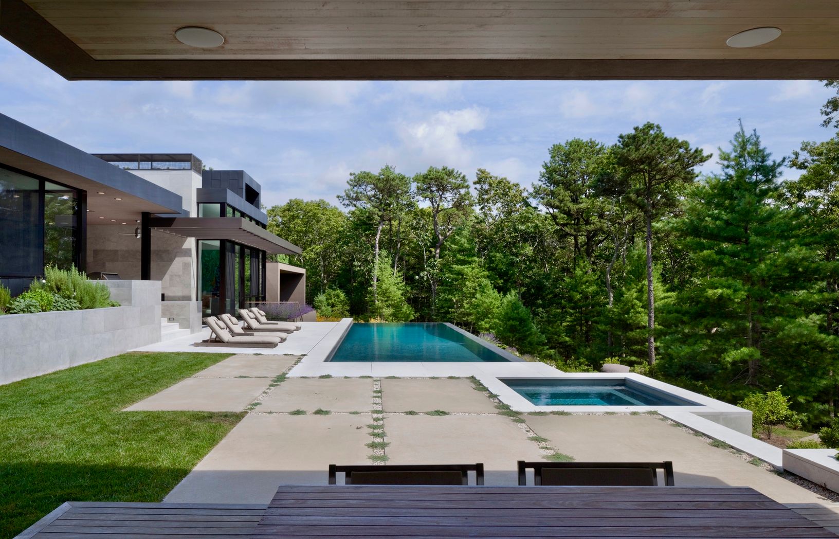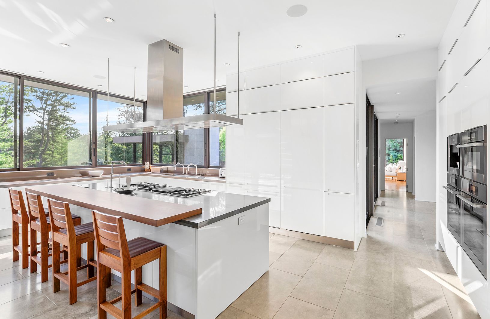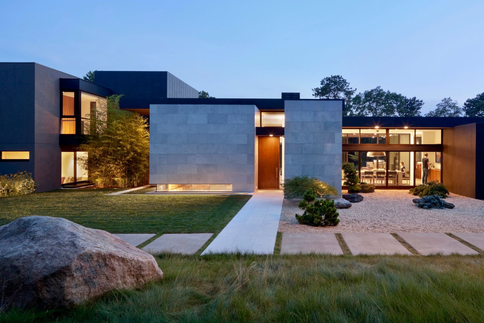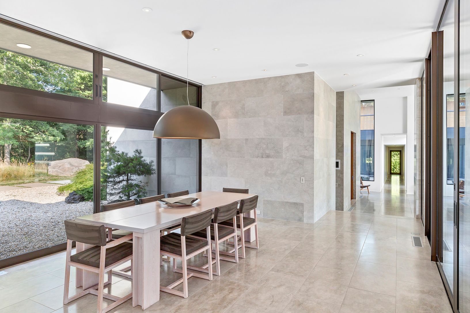 Situated in the East Hampton, on totally private 3.25 acres, this incredible residence was impeccably designed by Marmol-Radziner and located on a gently sloping site at the top of a hillside. From the street, the exterior profile is horizontal and unobtrusive. Upon entering the house, the layering of the interior volumes becomes apparent and the house opens up to expansive views of the surrounding zen-like grounds and tucked away tennis court