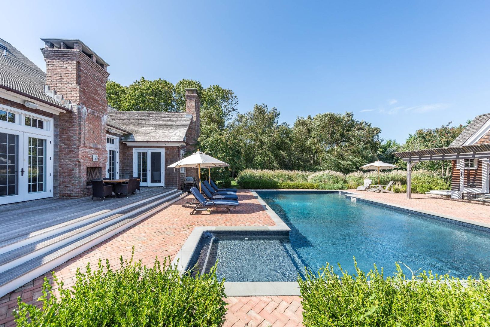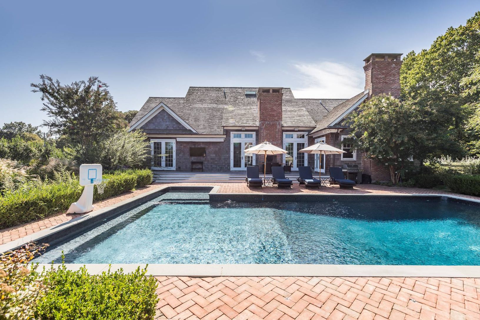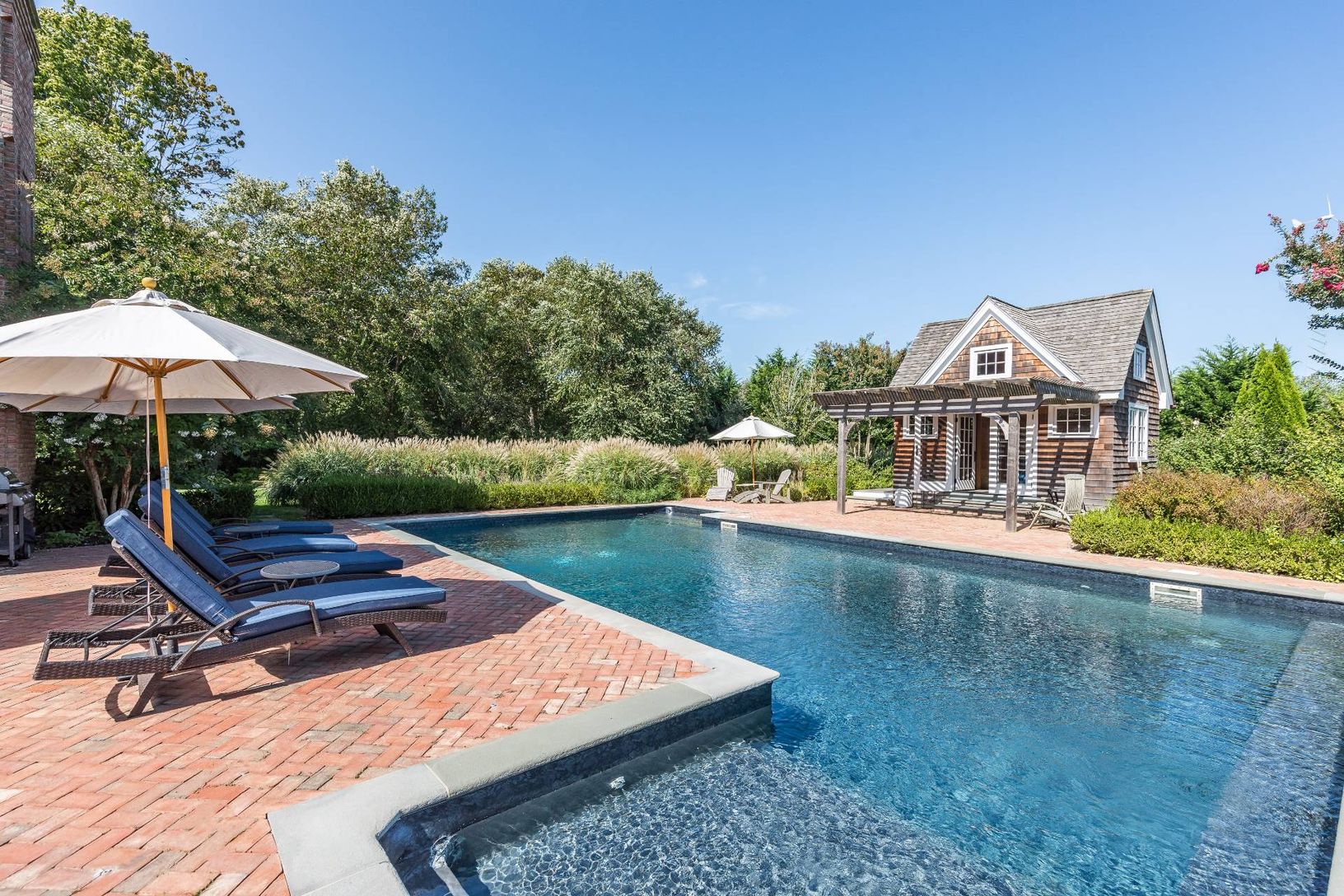 Beautiful traditional close to the Village center and ocean beaches. Large first floor primary bedroom, with 3 additional bedrooms, media room, heated pool and gorgeous landscaping. Outdoor spaces have been designed for maximum entertainment value. Comfortable and convenient. Available immediately.