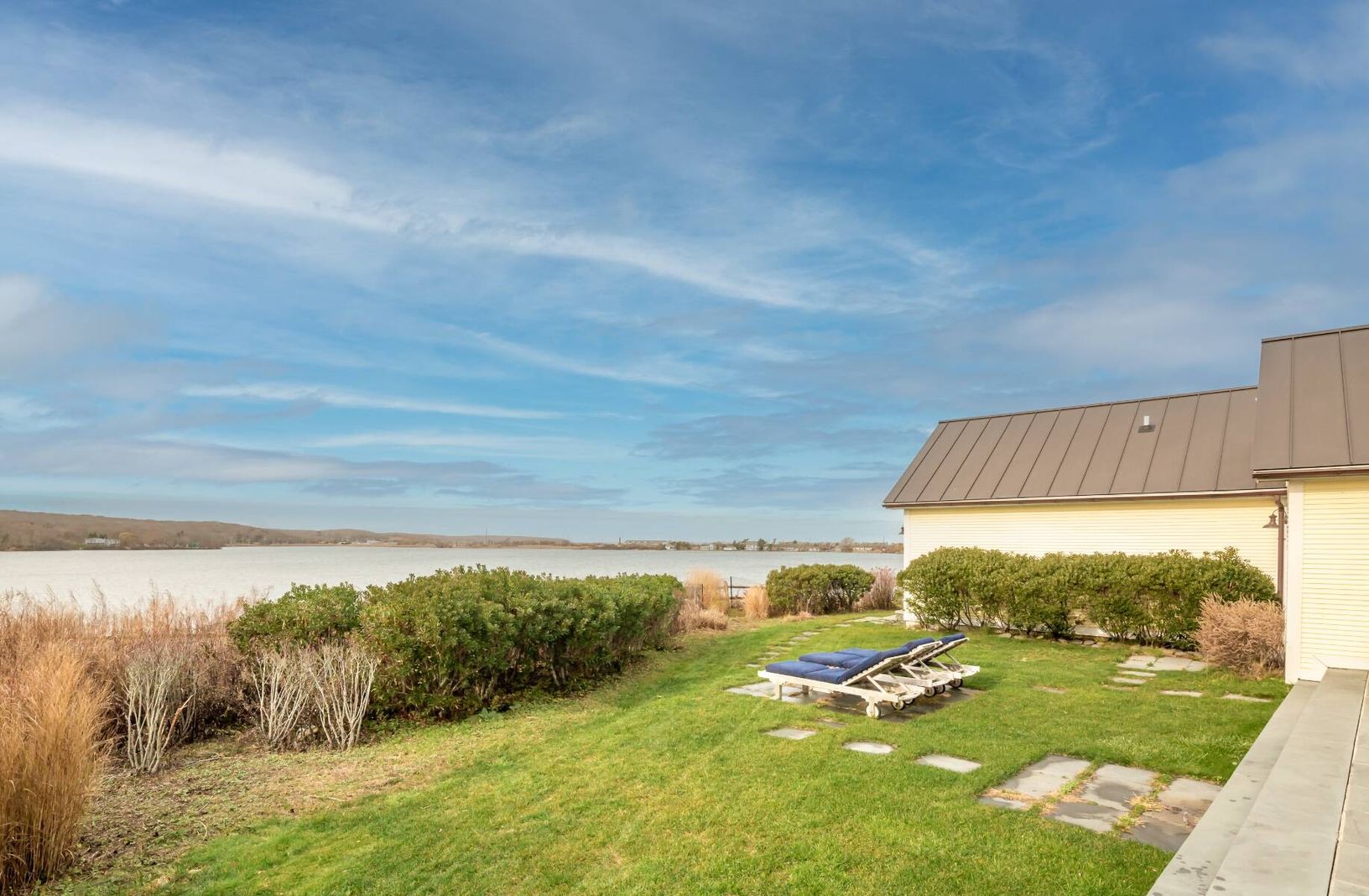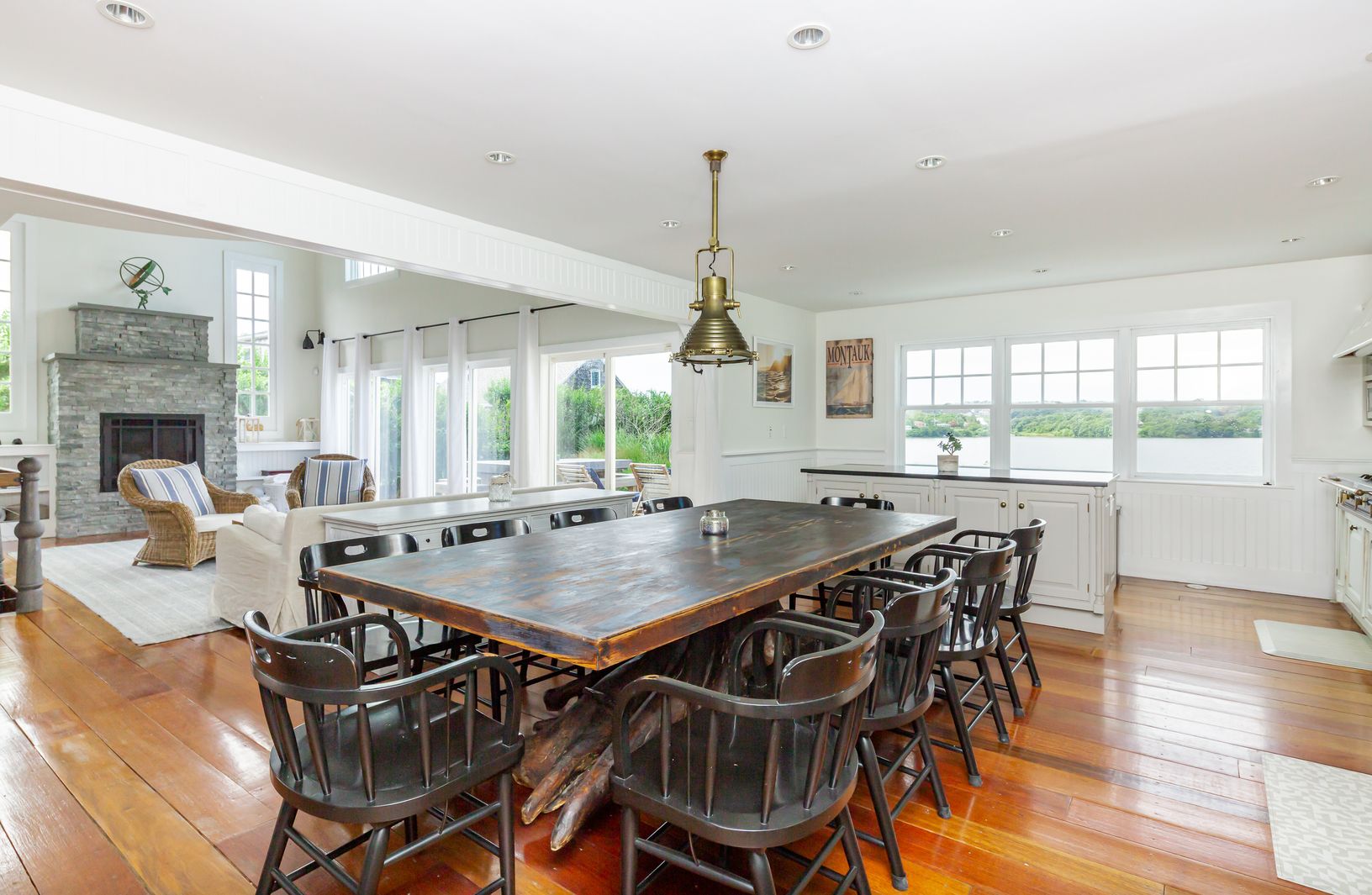 Located moments to Montauk Village and ocean beaches, enjoy expansive western facing water views across Fort Pond from this charming and light-filled waterfront Traditional. Enter through the gracious foyer that leads to an open living room with a gas fireplace and soaring ceilings, chef's kitchen, and dining area with an impressive wall of glass sliding doors and windows that frame the dramatic water views. The first floor also includes a den