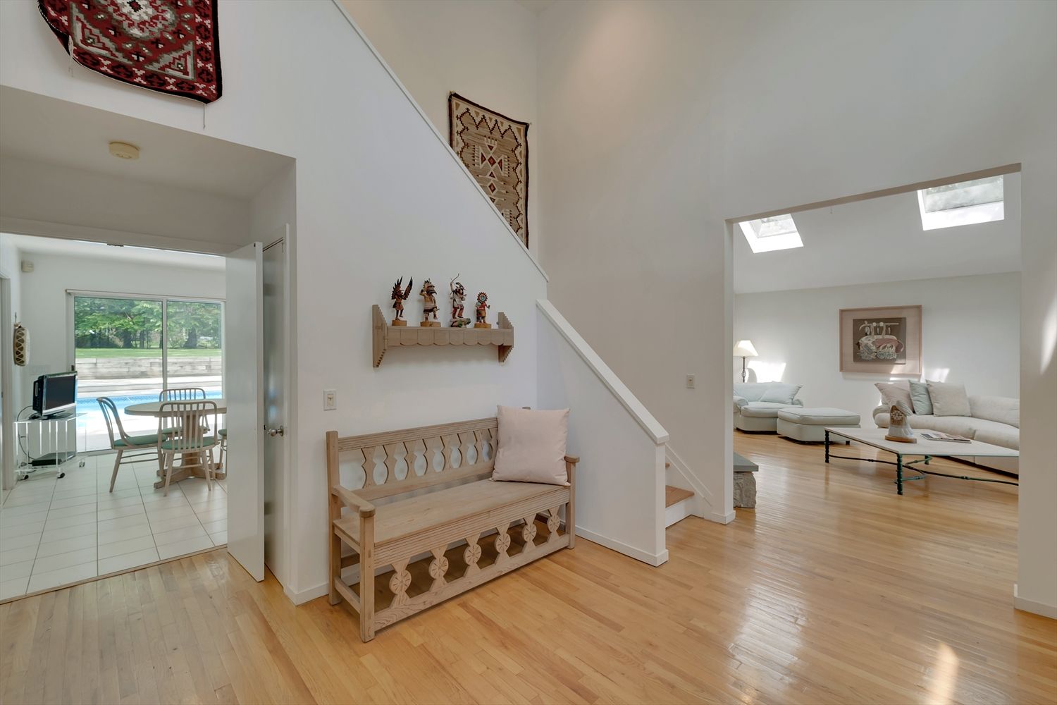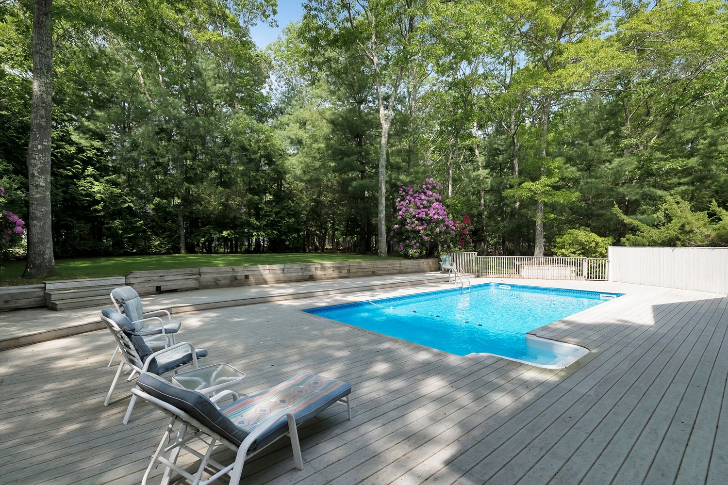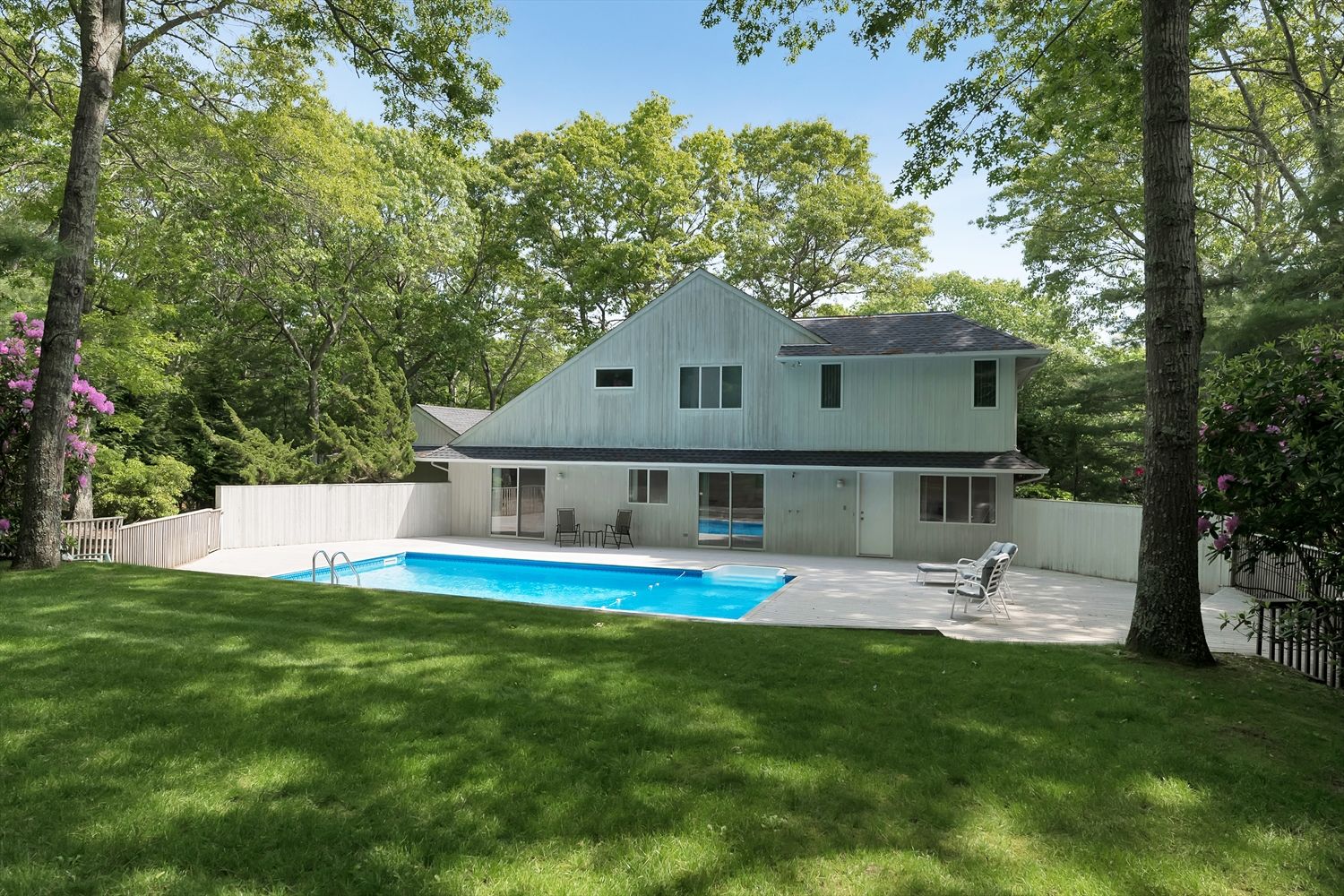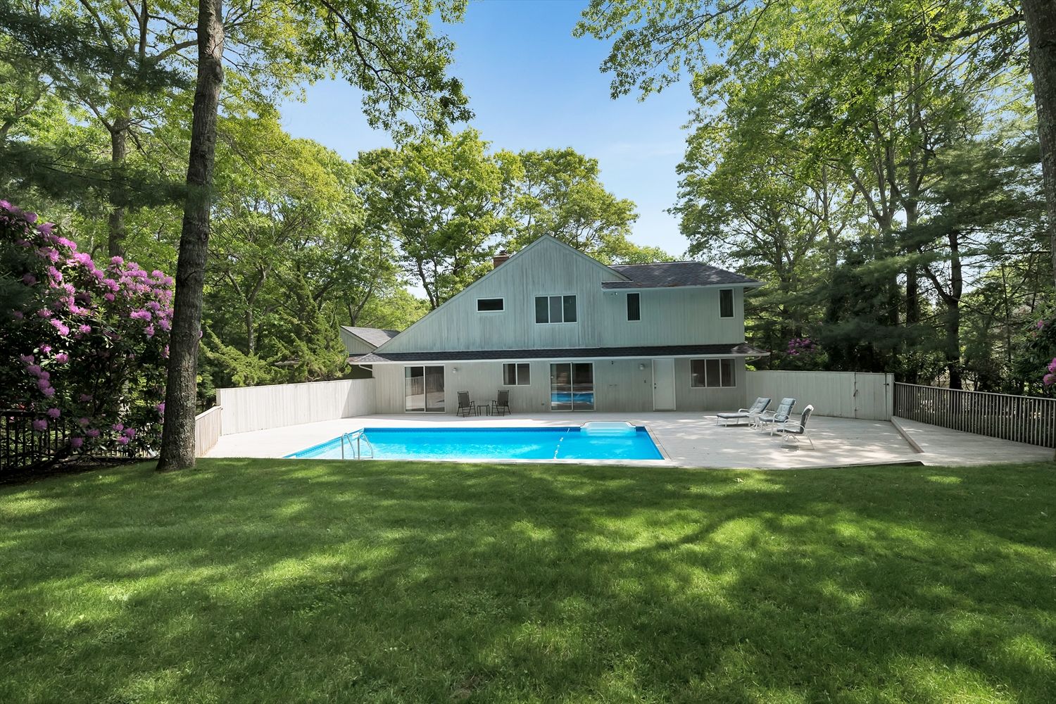 Nestled in Bridgehampton farm country, 132 Sea Farm Lane offers peace, sanctuary and great value with close proximity to town and world-class beaches. At the very end of a quiet cul-de-sac, upon entry, the gracious foyer welcomes you to the easy, carefree open floor plan. Tons of light stream inside through the living room skylights and sliders to the pool deck. Wonderful vaulted ceilings create an incredible sense of space together with the