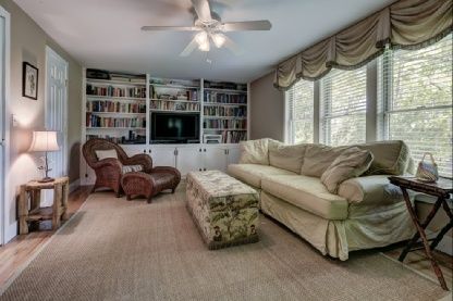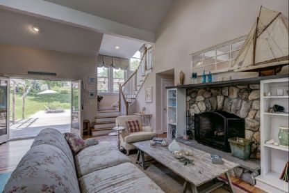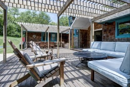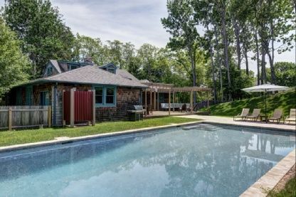 Nestled among trees with water views overlooking West Neck Bay, this charming shingled Arts And Crafts style Shelter Island home has a spacious open plan with vaulted ceilings, a lovely living room with stone fireplace and French doors opening to a very spacious deck with two pergolas for ample sitting and dining areas that overlook a gunite pool with patio. Also included are a dining room, kitchen, guest suite plus two additional bedrooms