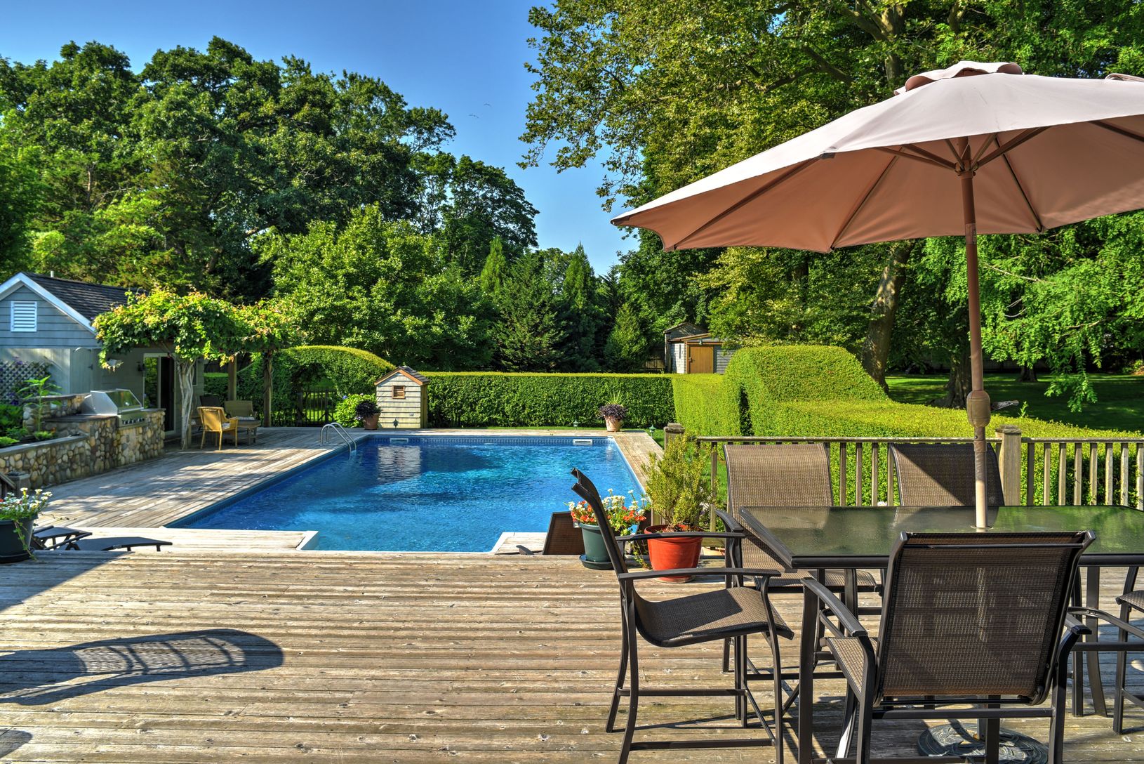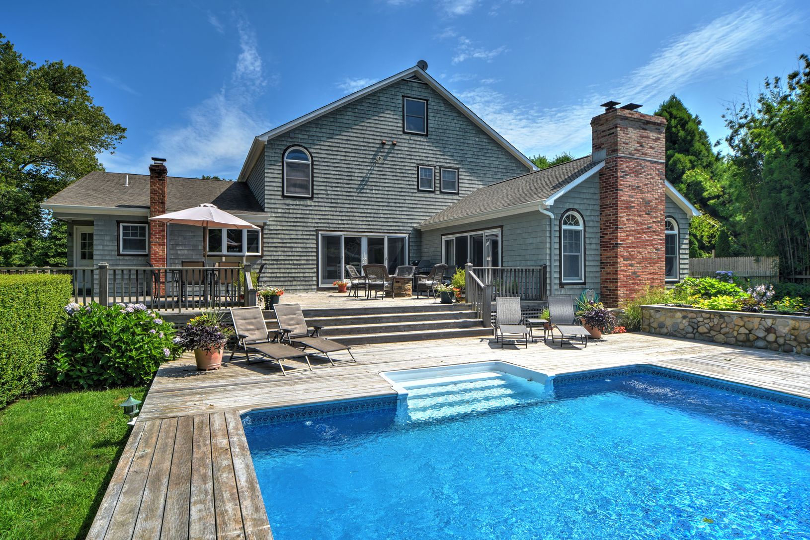 East Hampton Village fringe Traditional with 4 bedrooms, 3 full baths rooms, 3,600 sq.ft.+-, heated pool, pool house with powder room and outdoor shower. Outdoor built-in stone masonry BBQ entertaining area with herb garden. Large expansive cedar decking off the kitchen extending out to pool and pool house with pergola seating and dining areas. Two stories of living space, sited on 1.00 acre of land, full ceiling height unfinished basement, tw