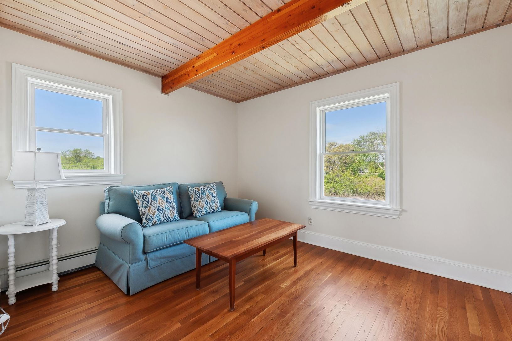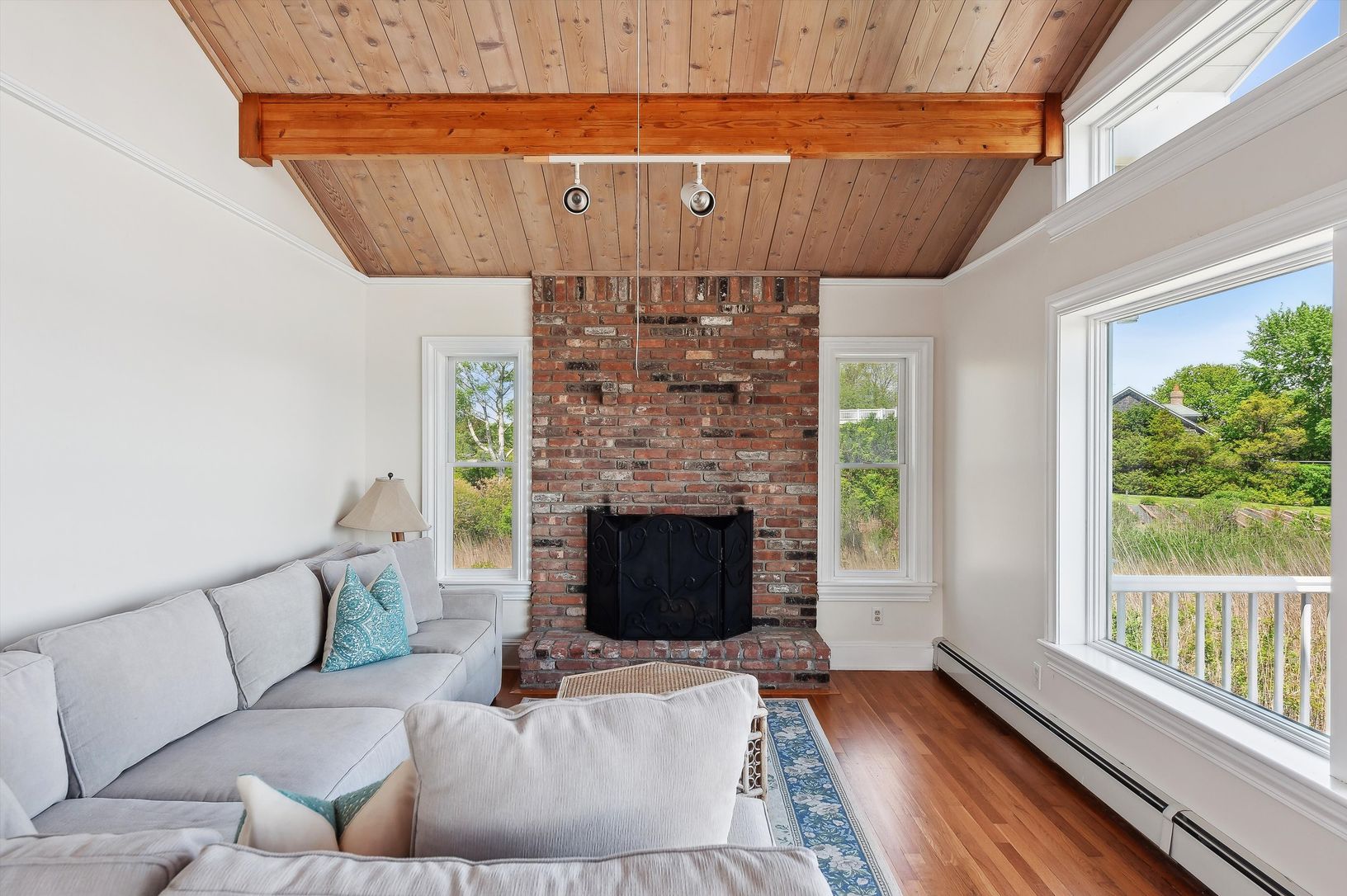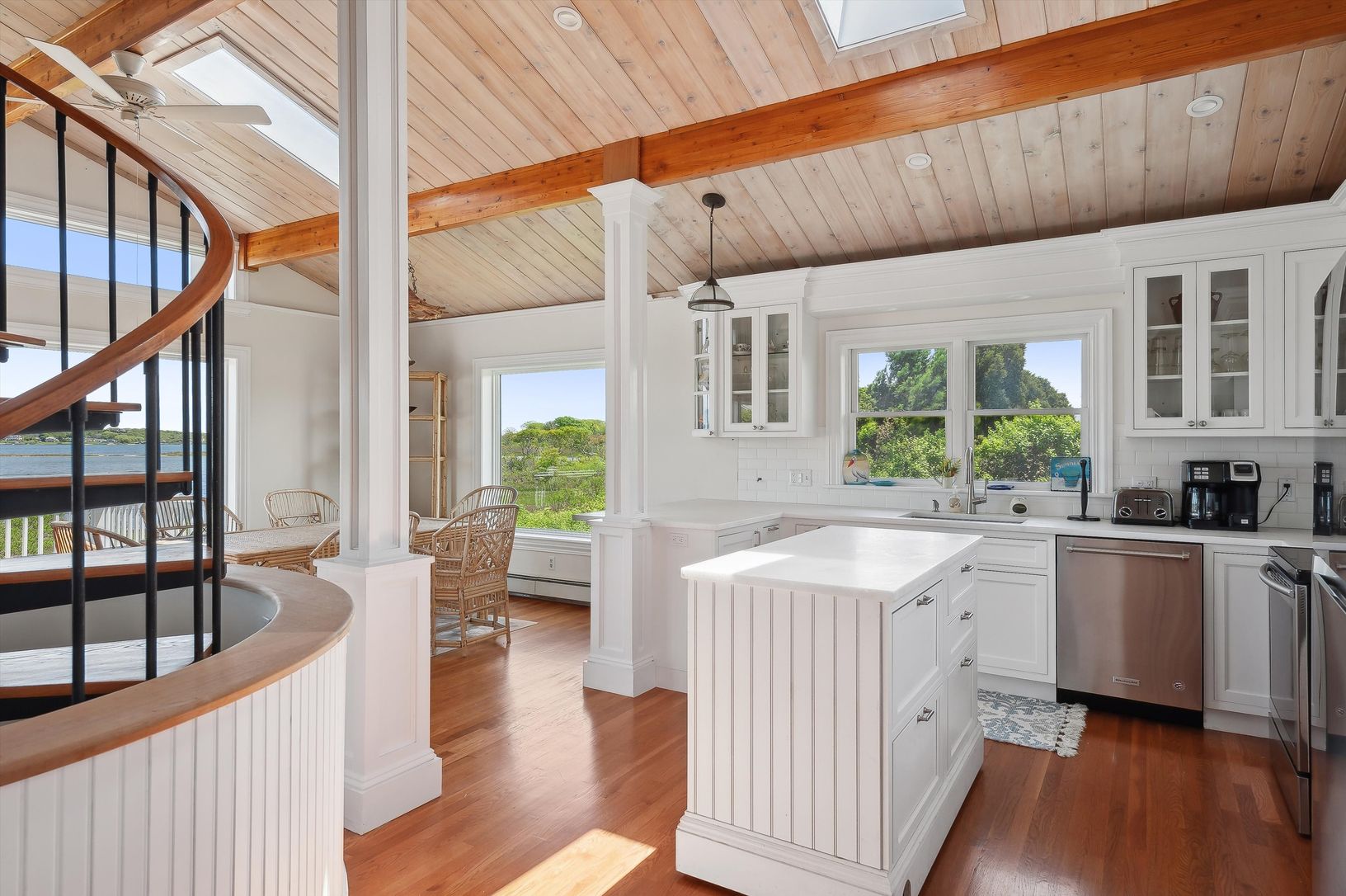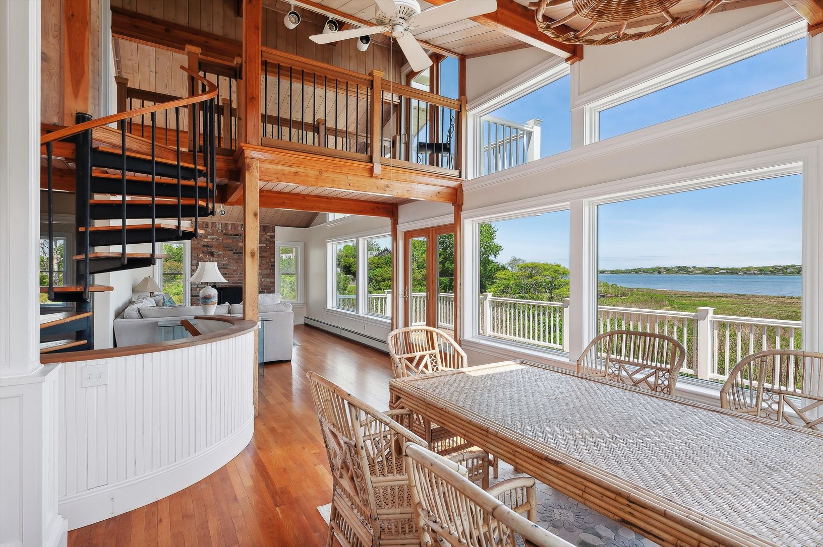 Enjoy the natural beauty of lakefront living this summer at 134 West Lake Drive in Montauk. With an elevated main floor, the expansive water views can be enjoyed from the fully equipped kitchen, dining room and great room, all of which open to a large, peaceful deck overlooking the lake, perfect for outdoor dining and relaxing all summer long. The main level also contains a full bathroom and a bonus room which would serve well as a home-office
