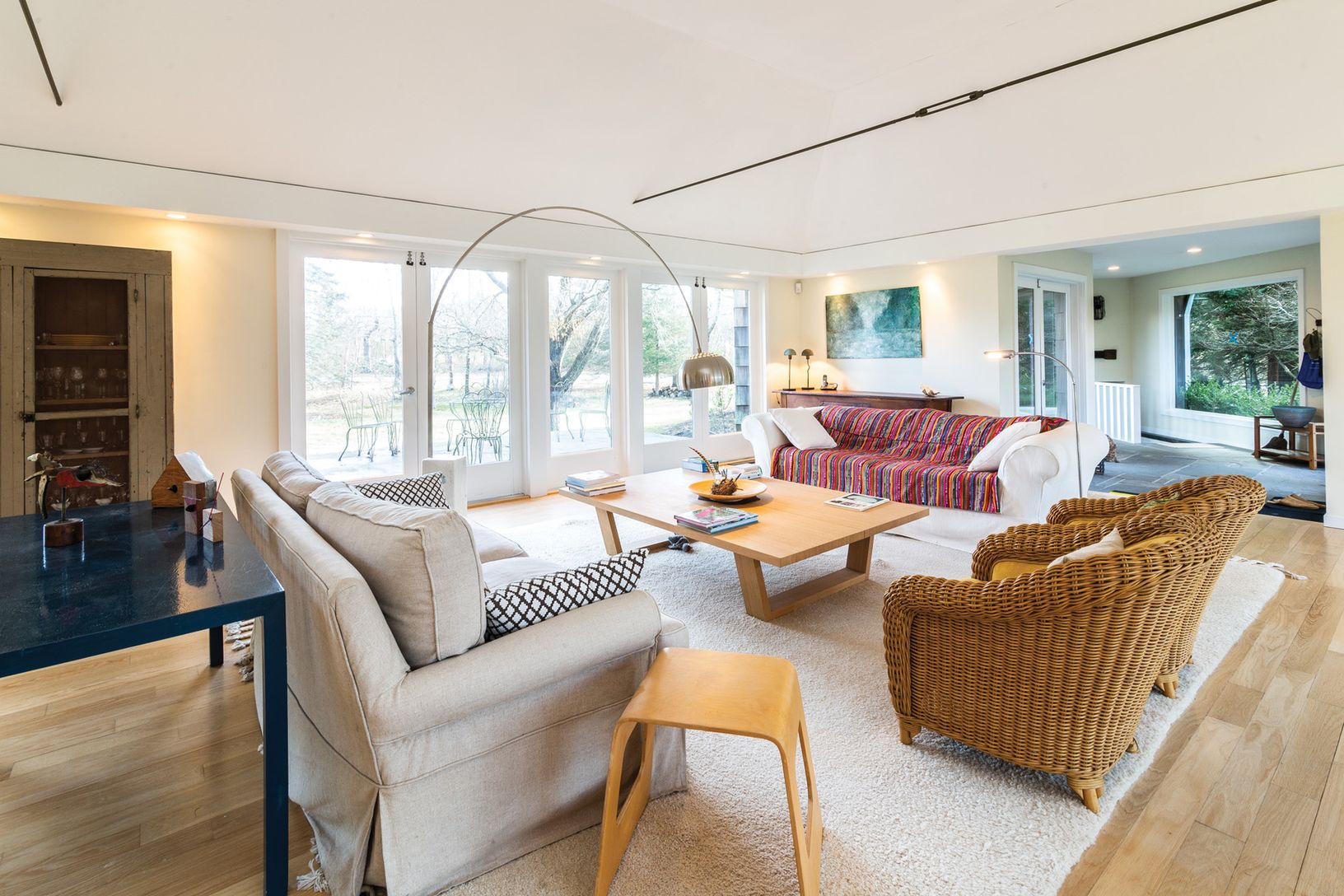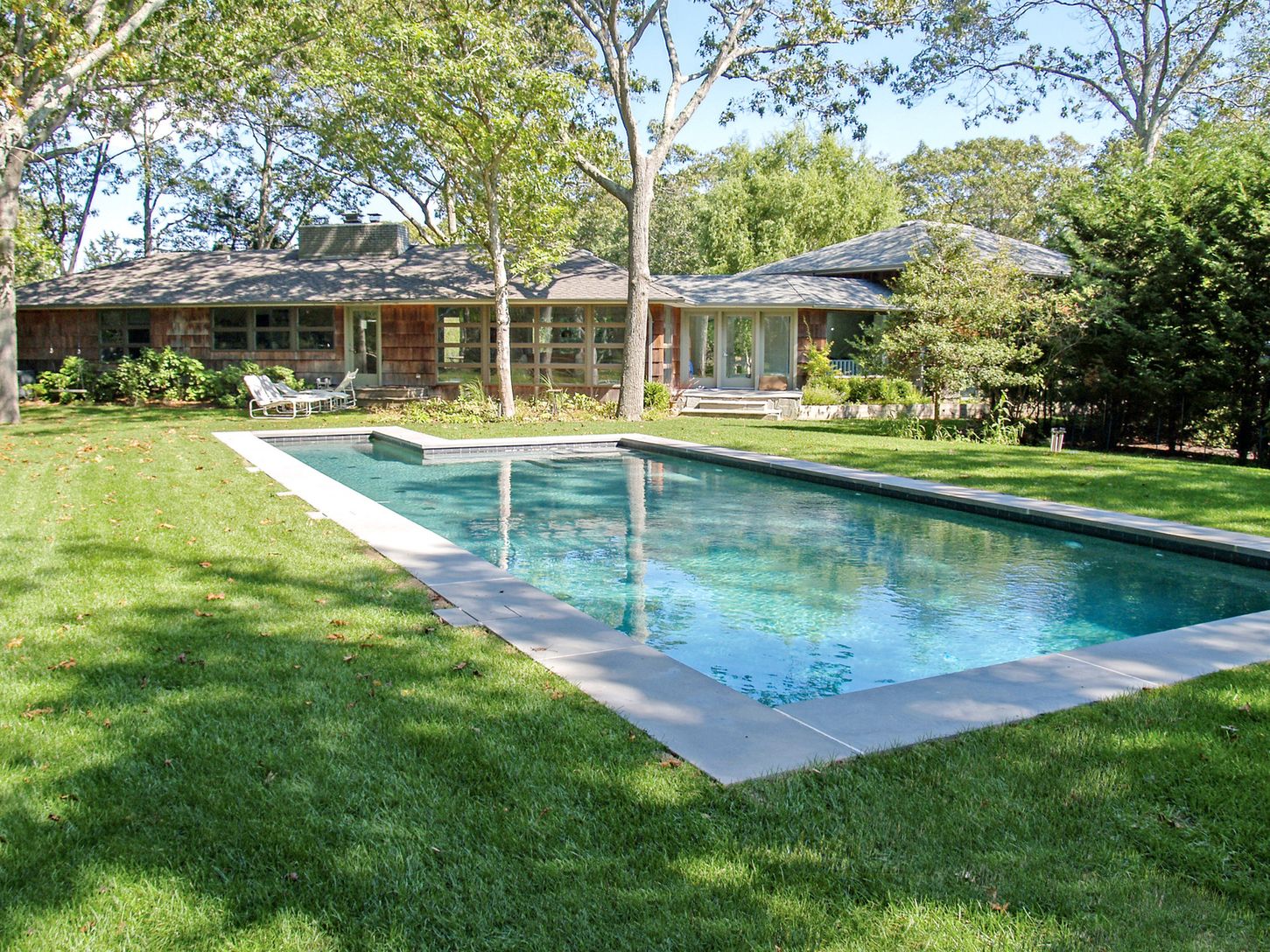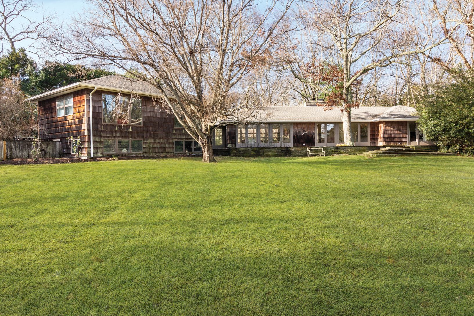 Short distance to a beautiful bay beach in Amagansett's Barnes Landing, this classic midcentury modern home on over an acre offers light-filled, loft-like open living areas. The 2,700+/- sq. ft. of living space includes four bedrooms, master bedroom with en-suite bath in one wing, three additional bedrooms, plus a den/playroom and two baths in the multi-level guest area. A stone-floored, glass-enclosed entry opens to both the front and rear la