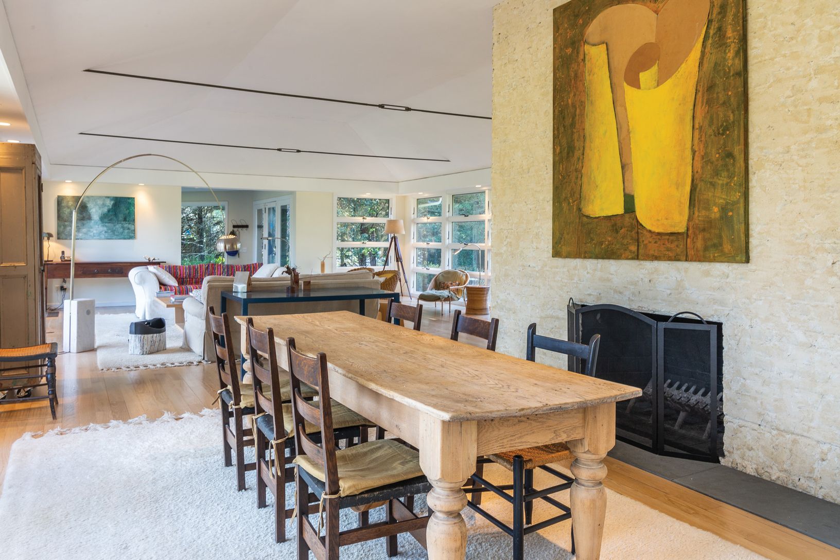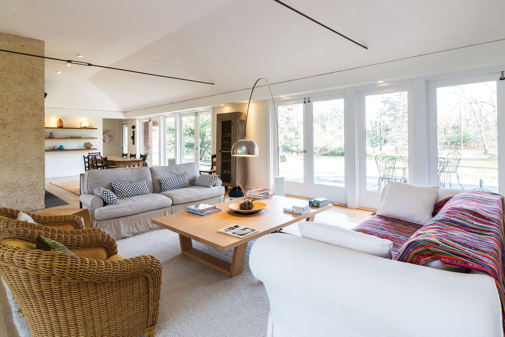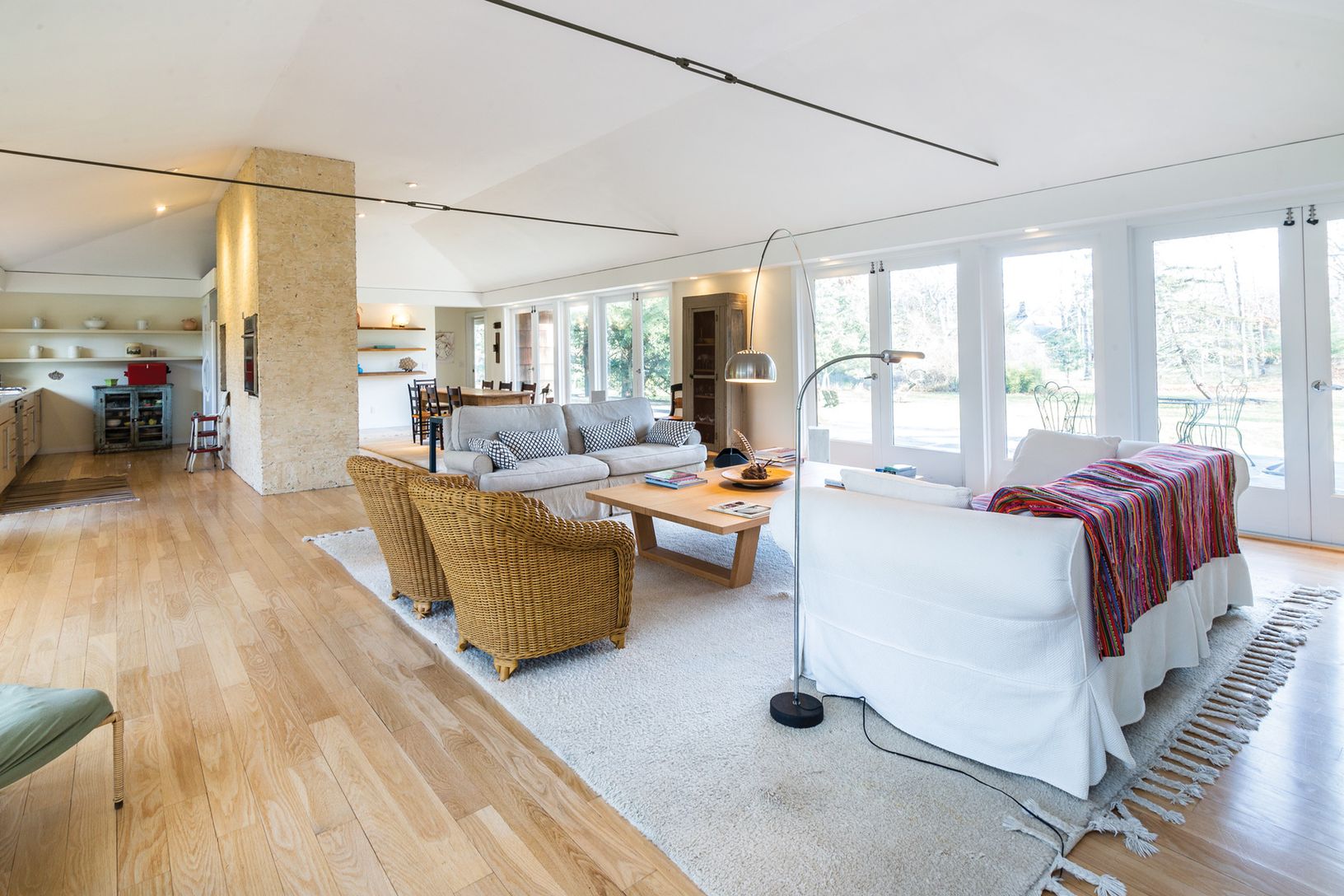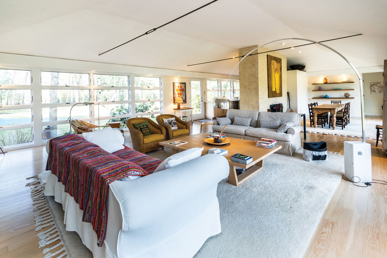 Short distance to a beautiful bay beach in Amagansett's Barnes Landing, this classic midcentury modern home on over an acre offers light-filled, loft-like open living areas. The 2,700+/- sq. ft. of living space includes four bedrooms, master bedroom with en-suite bath in one wing, three additional bedrooms, plus a den/playroom and two baths in the multi-level guest area. A stone-floored, glass-enclosed entry opens to both the front and rear la