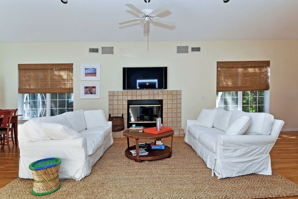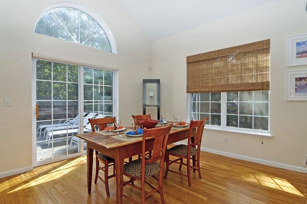 A terrific quiet street conveniently situated between Sag Harbor Village and East Hampton Village minutes from either. A true three bedroom with a large en suite master on the 1st floor and two spacious airy bedrooms with an enormous shared bath on the 2nd floor. The generous eat-in kitchen with bar overlooks the large deck and expansive land, continuing into the main great rooms with double height ceilings and living space and dining space