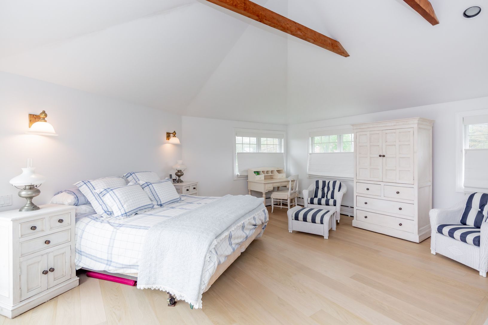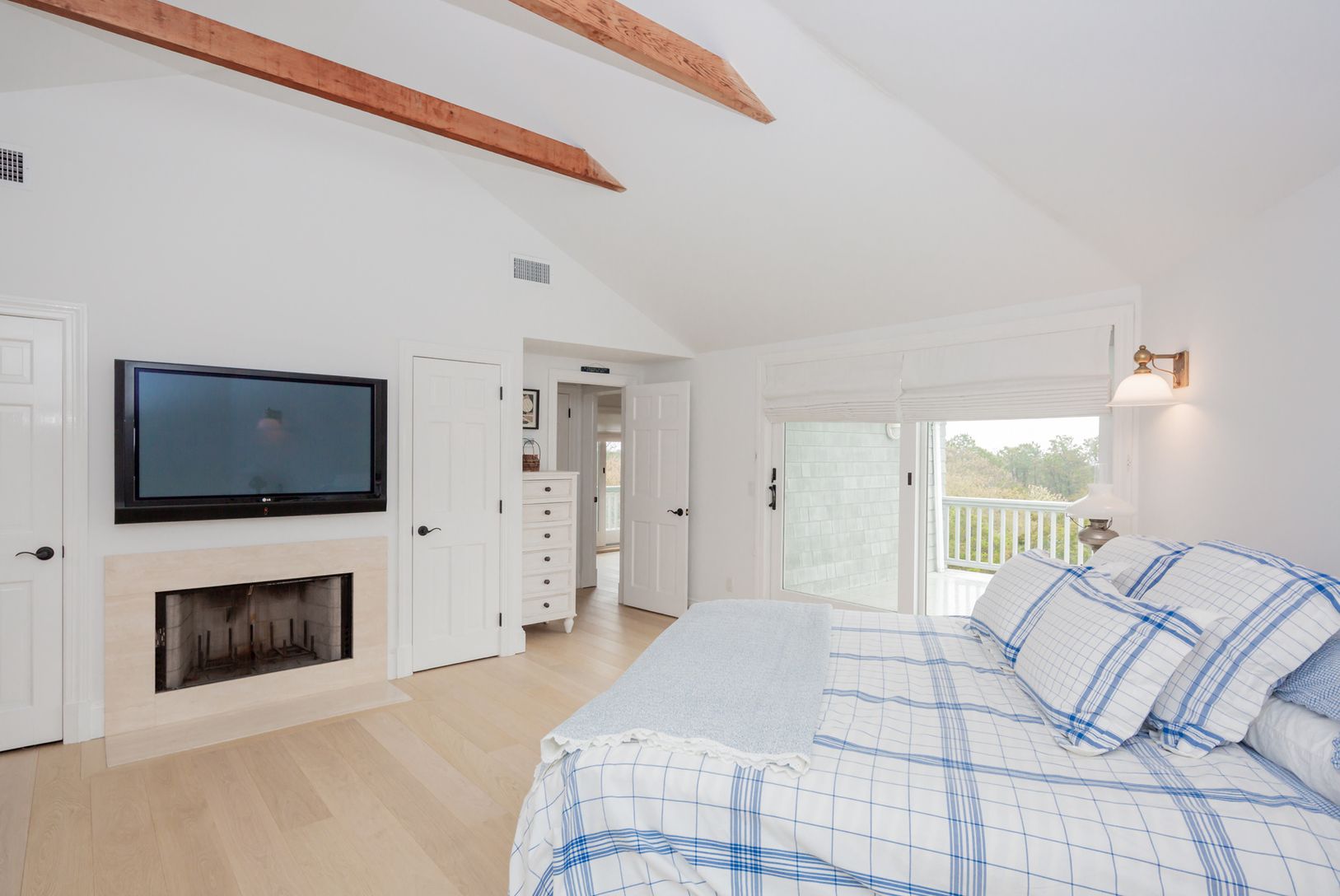 Rental Registration #: 18-532 Located on a private road with beach access, this pristine beach house offers four bedrooms and four baths. The ground floor, with its own entrance, has two bedrooms and two baths plus a sitting room, a well-appointed kitchen opening to the deck, dining area adjacent to the sun-filled living room and finally another guest bedroom and bath. The large master suite on the second floor features a fireplace, a private