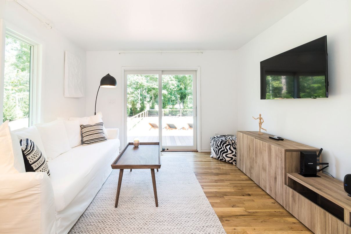 Newly renovated and completed in August 2017, and ready to move in! Located minutes from Sag Harbor, East Hampton and ocean beaches, this exceptional, sleek contemporary 3,200+/- sq. ft. home with four bedrooms, three full baths and two bonus rooms sits on 1.9 acres of impeccably manicured landscape, with a heated saltwater pool, fire pit, mahogany decking, barbecue grill and teak patio furnishings. Light-filled open living areas feature high