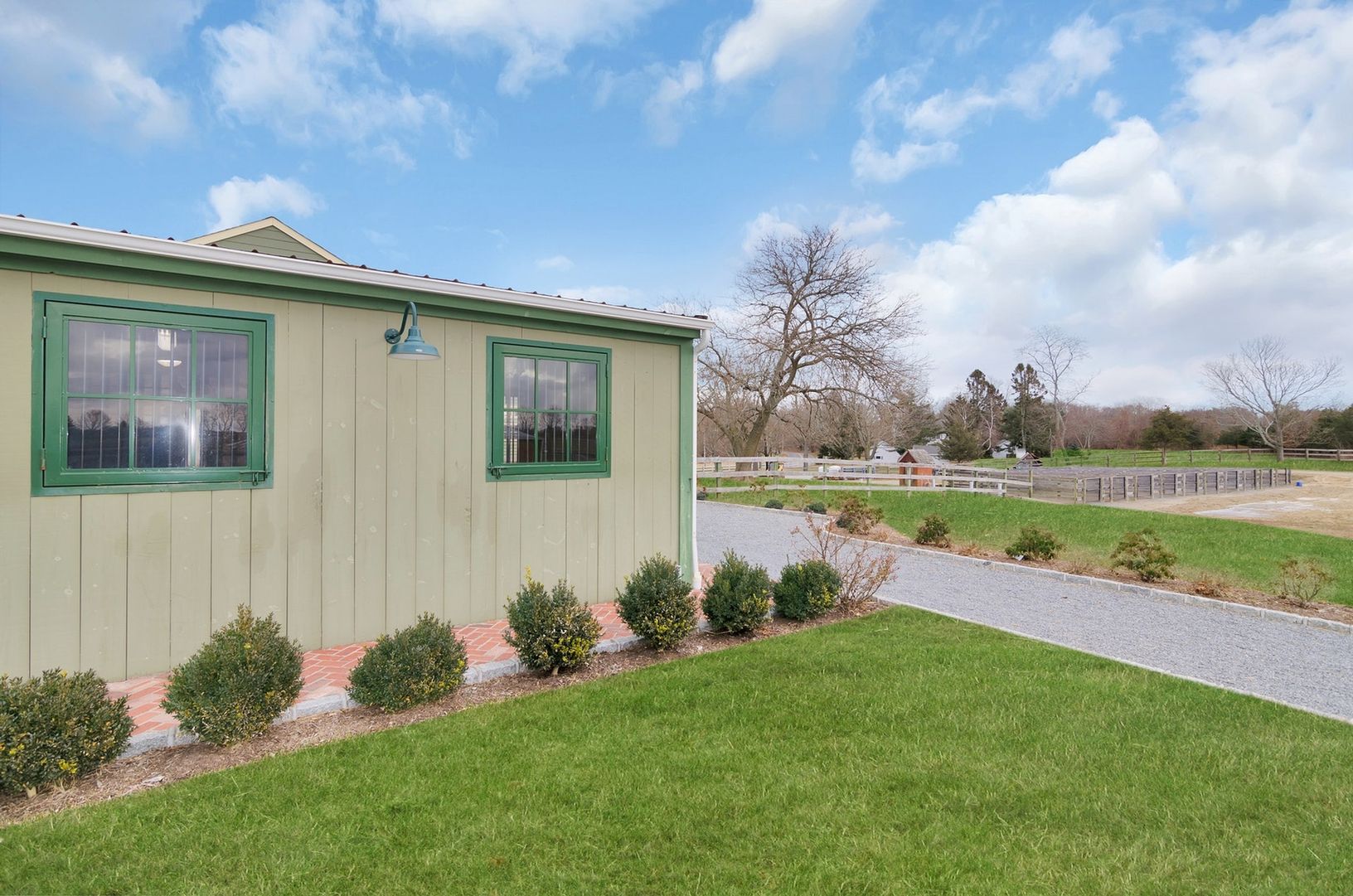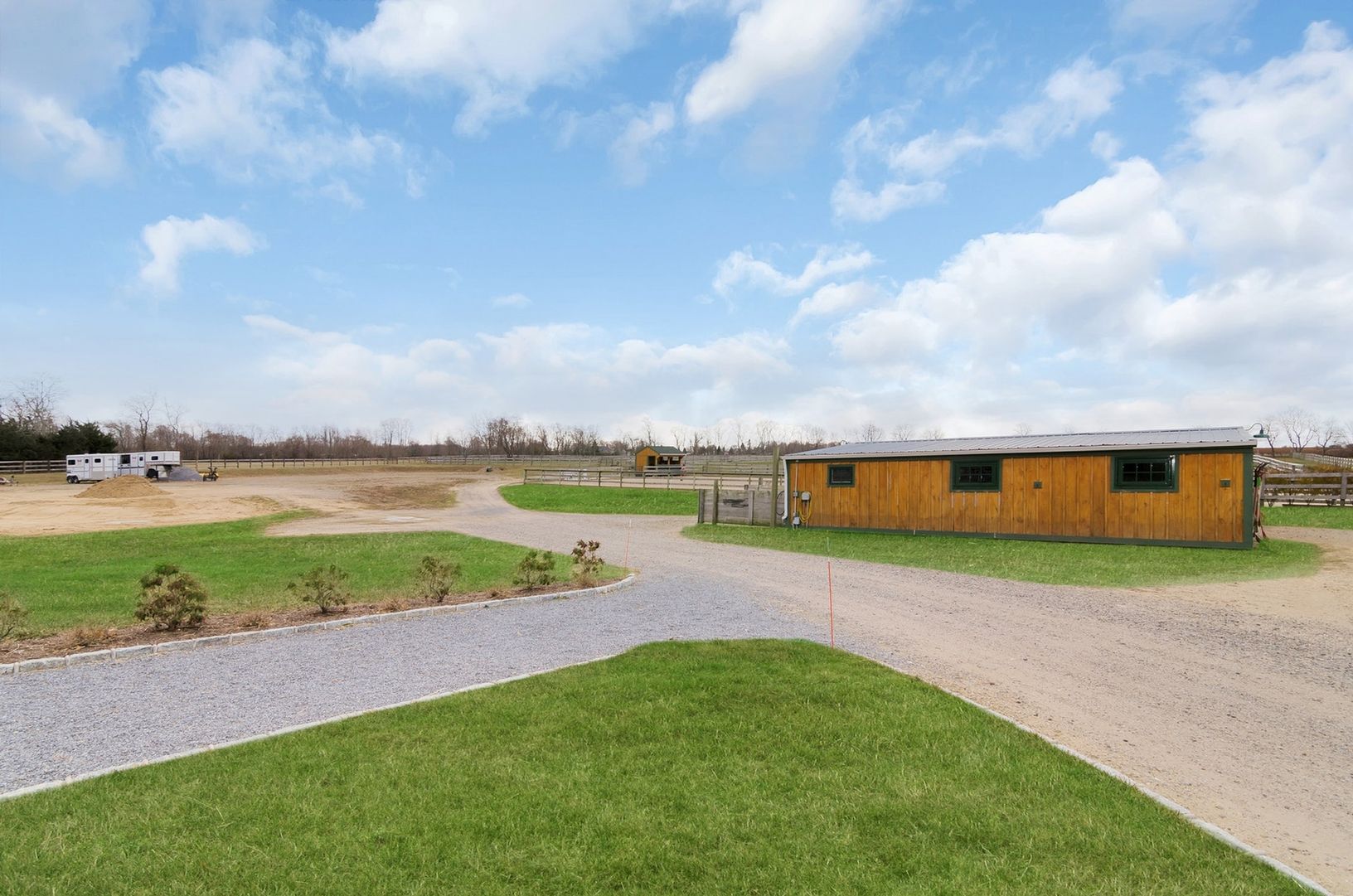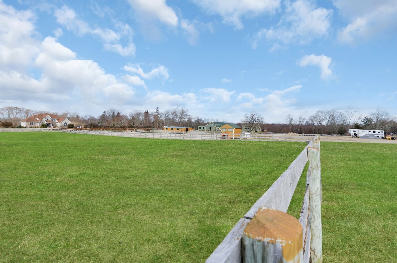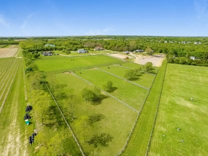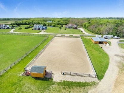 Enjoy forever vineyard views and sunsets from this serene, 10-acre horse farm in bucolic Southold. The property boasts a farmhouse, 2 barns with a total of 8 stalls, irrigated 100' by 200' riding arena, 5 irrigated paddocks, and ample storage space.