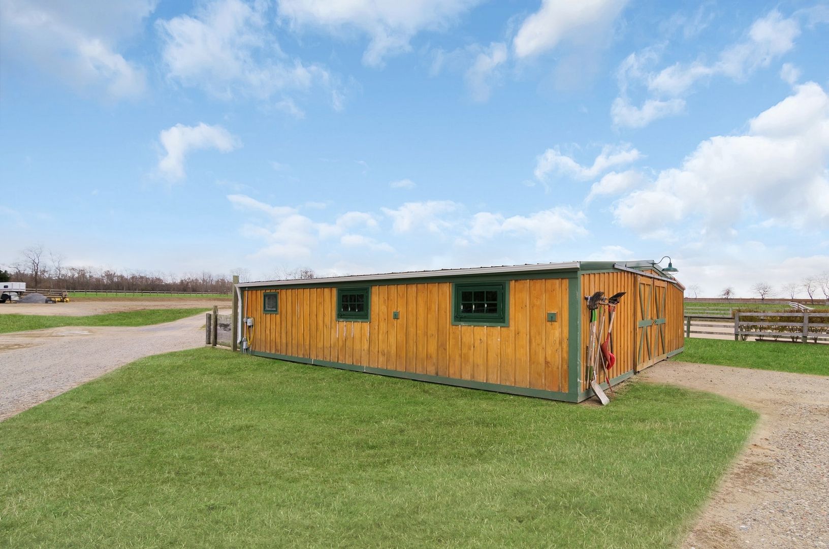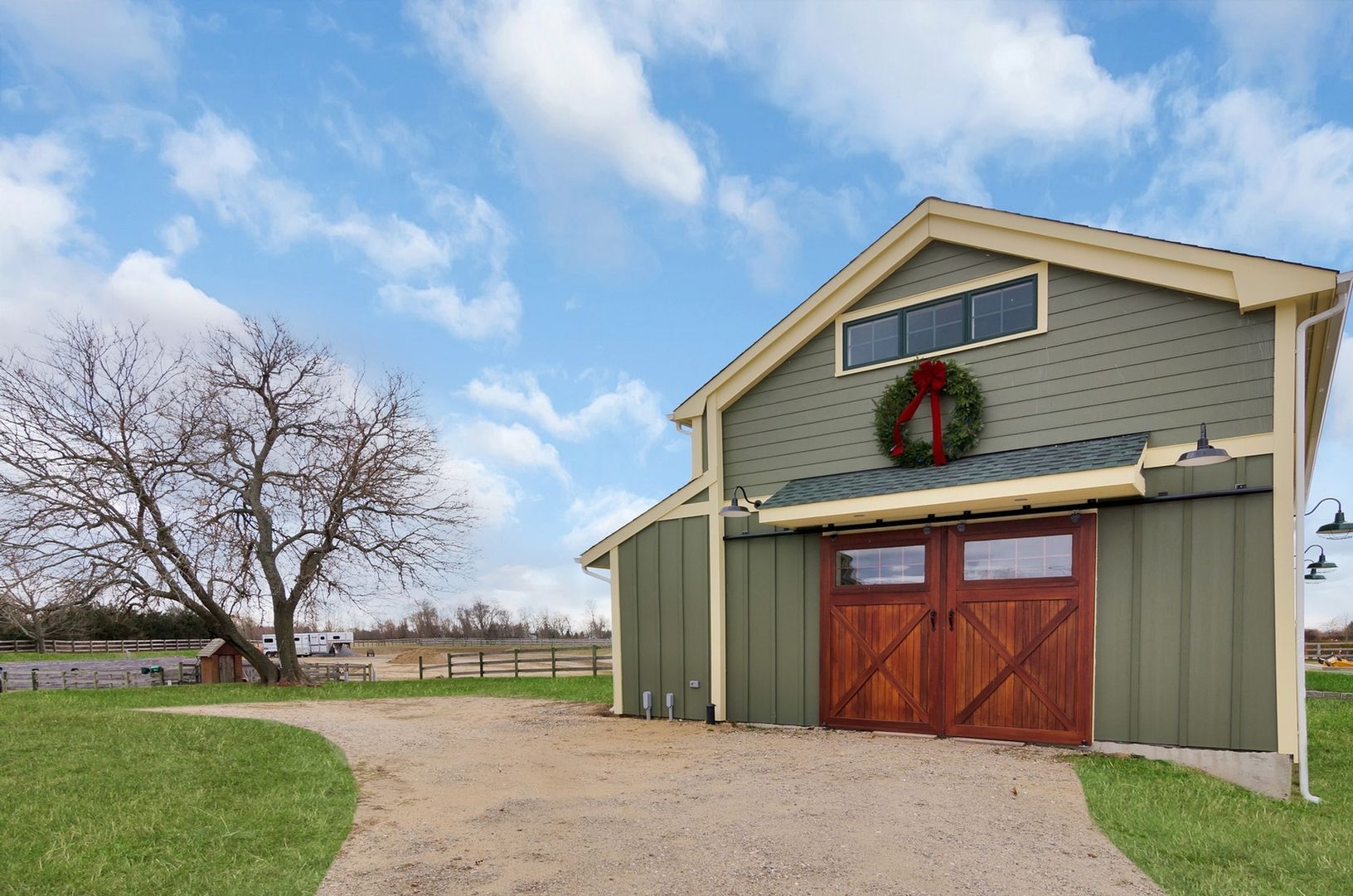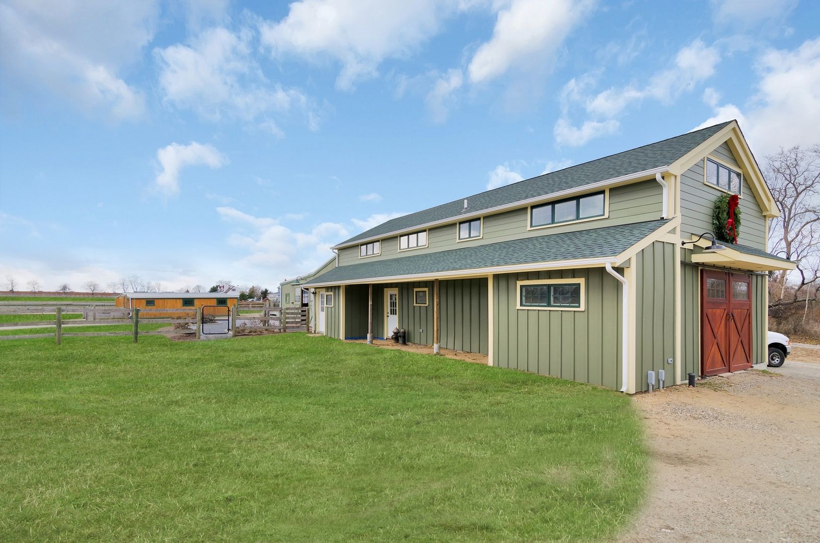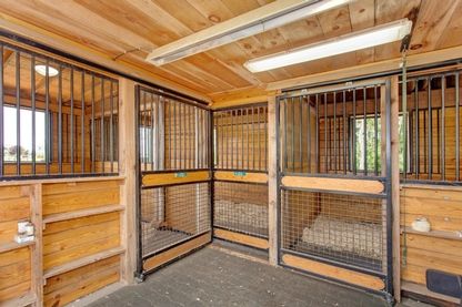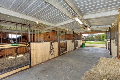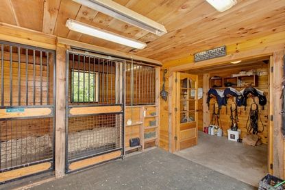 The two barns include one center aisle barn with five 12' by 12' stalls, the other barn with three stalls, which is attached to a large, fully enclosed garage space.