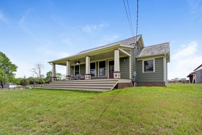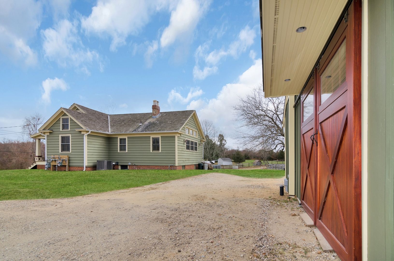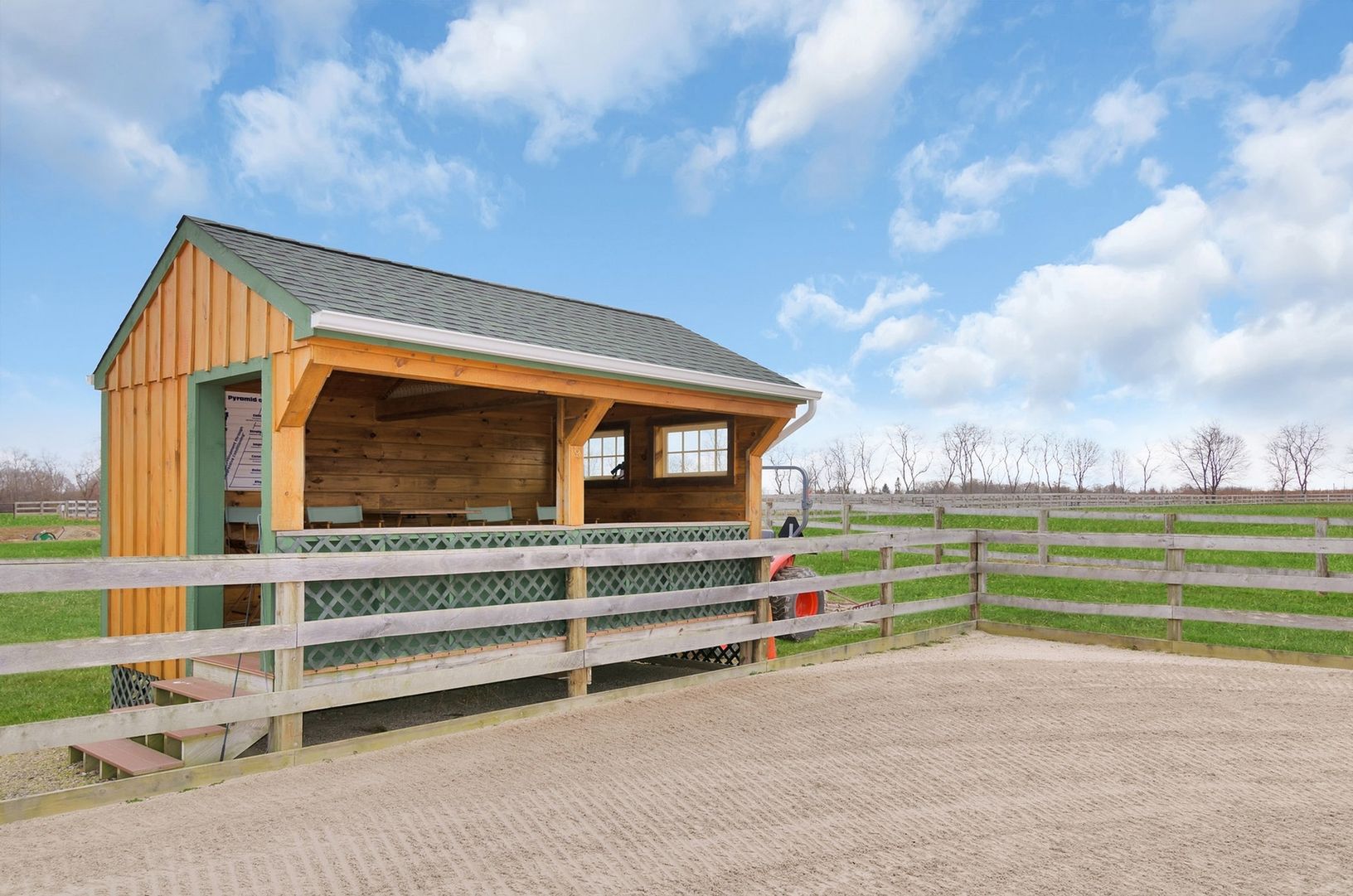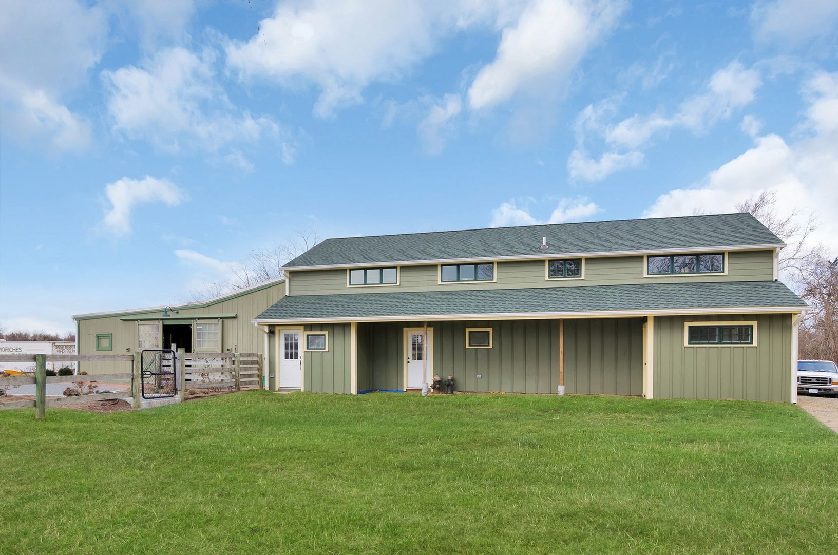The two barns include one center aisle barn with five 12' by 12' stalls, the other barn with three stalls, which is attached to a large, fully enclosed garage space.