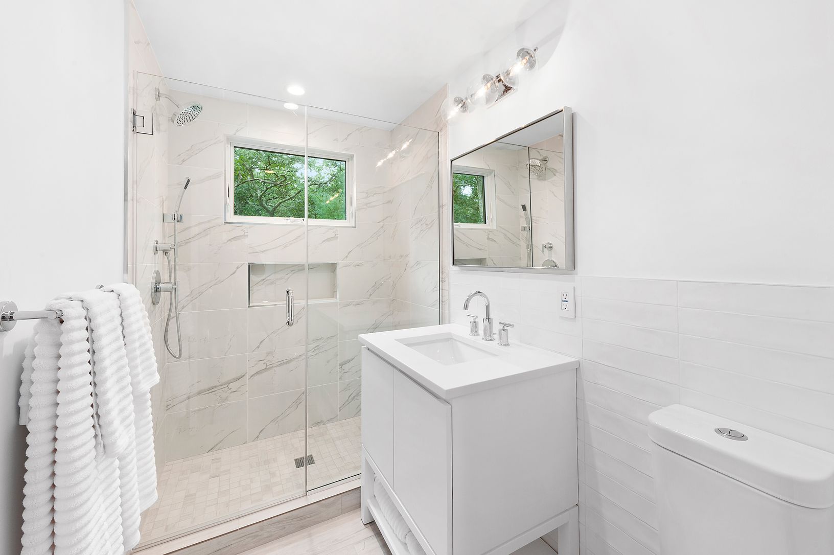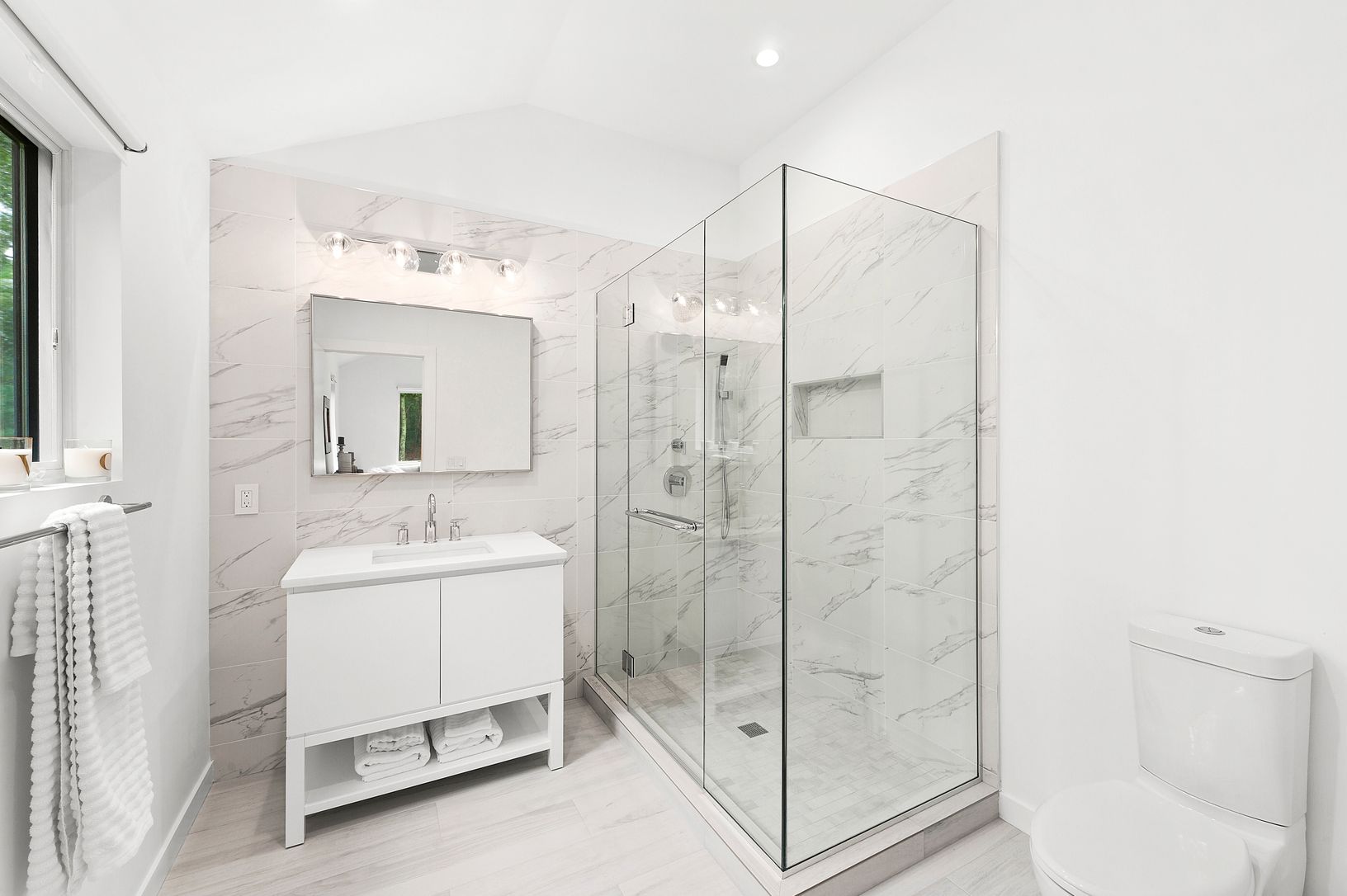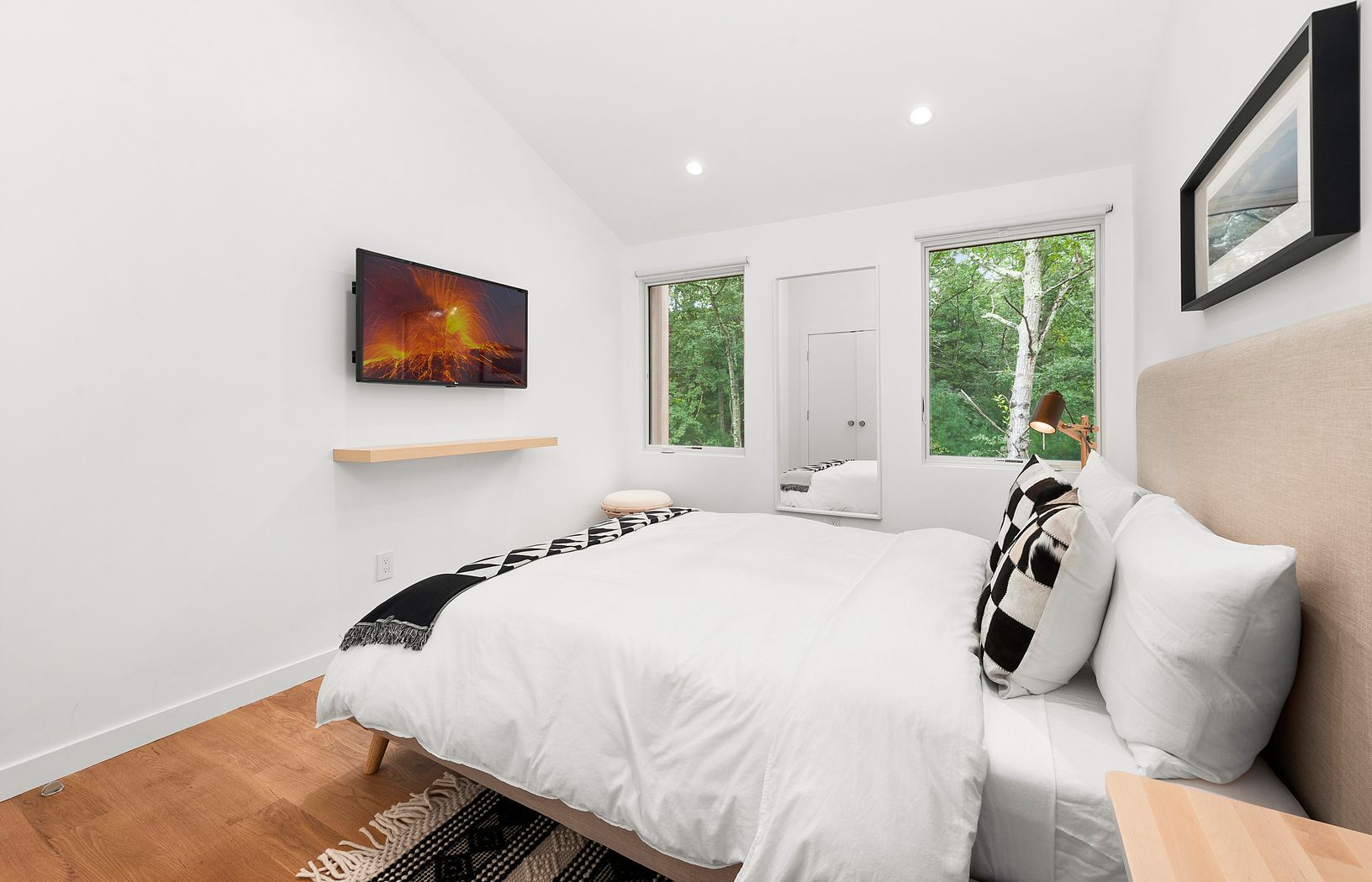 Enjoy this newly and completely renovated four bedroom four bath home on two acres. Chic interiors with white walls and beautiful wood floors are flooded with natural light from abundant windows, glass doors and multiple skylights. Open concept living areas flow among the living room with fireplace, dining area and eat-in kitchen with counter seating, stainless steel appliances and glass doors to a deck overlooking the heated pool in the priva