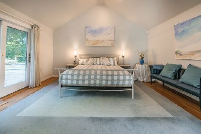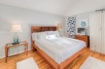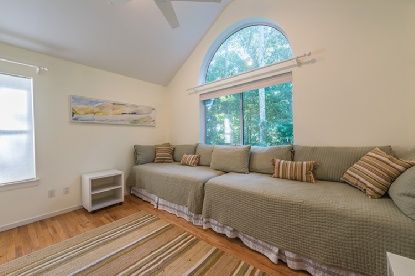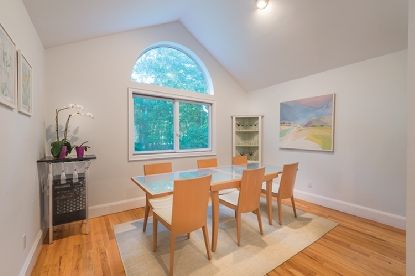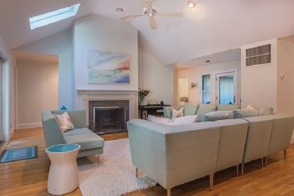Cathedral ceilings make all the difference in this beachy, beautifully landscaped home. New gourmet kitchen and dining room are open to a spacious living room with fireplace. Great entertaining spaces, with generous mahogany decking accessed through French doors from the living room, master bedroom, and den/fourth bedroom. There are two additional bedrooms on the main floor, and a fifth and sixth bedroom on the lower level. The lower level