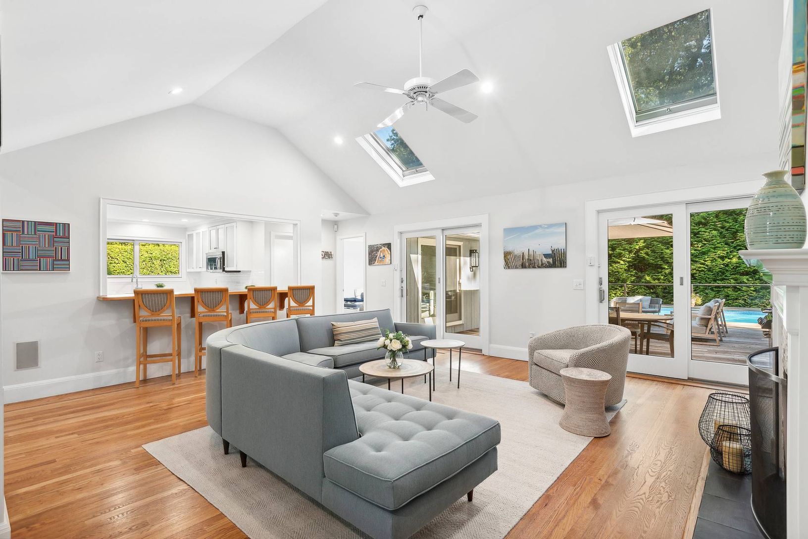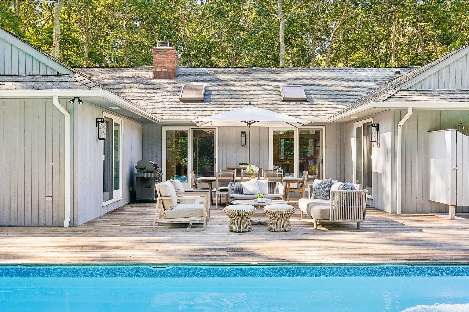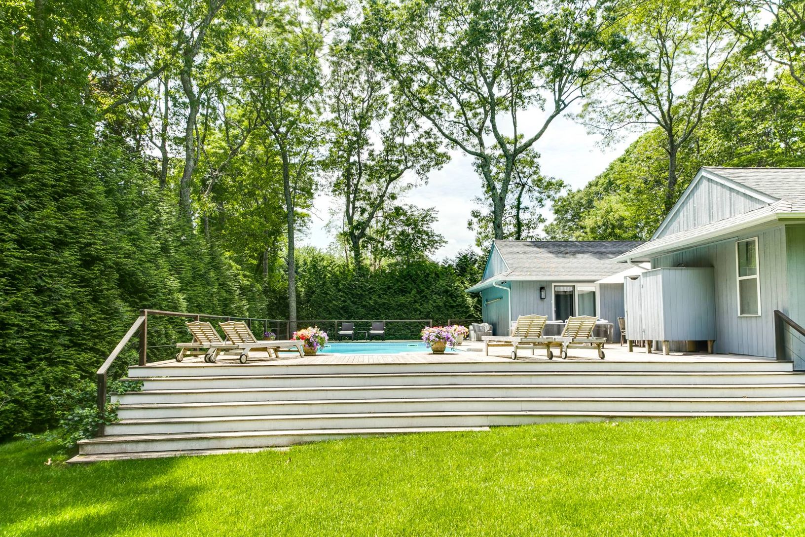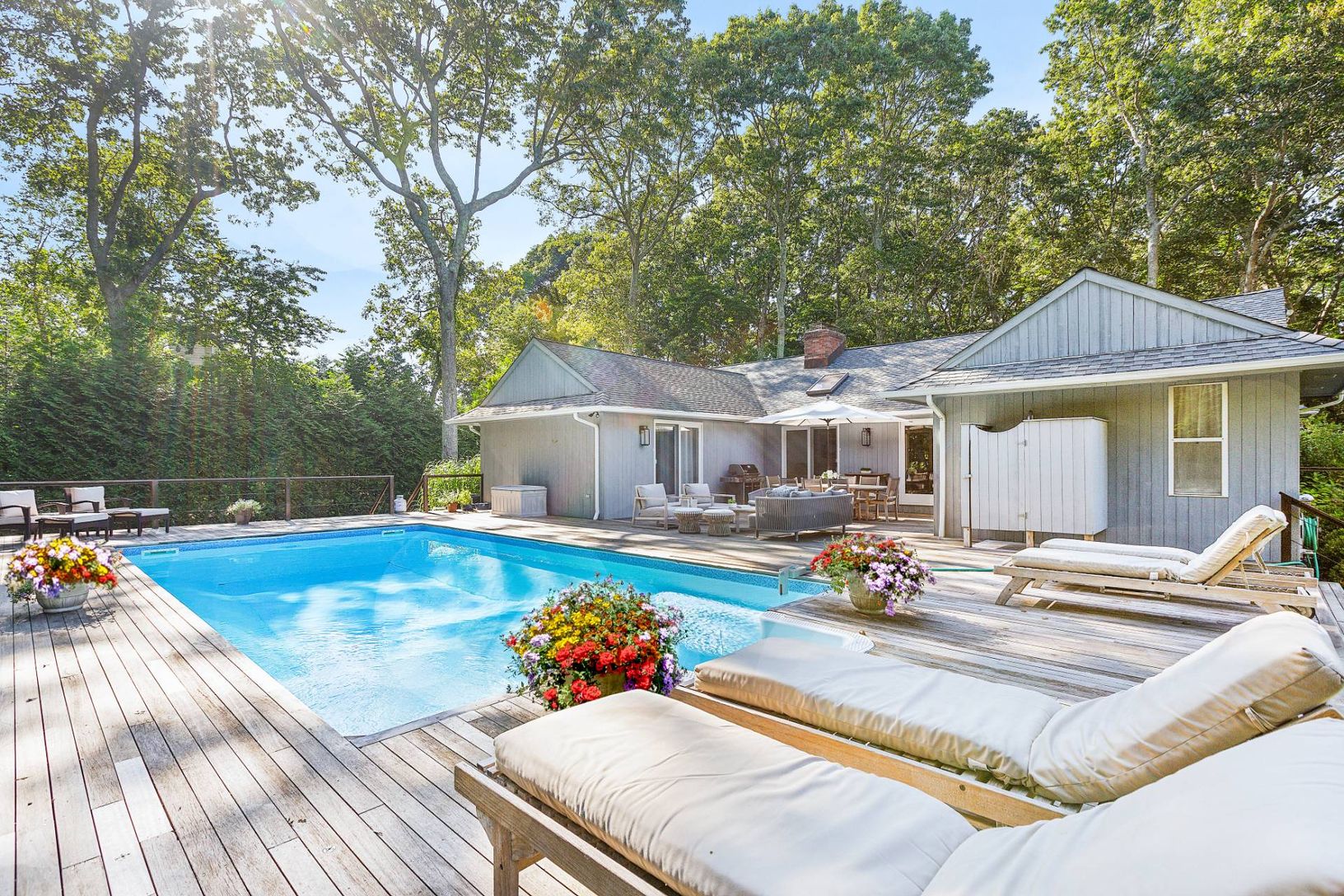Nestled on a flag lot just off a cul-de-sac, this exquisite single-story contemporary with a heated pool blends elegance with modern comfort, just moments from the vibrant Village of Bridgehampton. Commanding 6 bedrooms and 4 baths, this home is complemented with access to community tennis courts just moments away. The spacious living room boasts a wood-burning fireplace, 2 skylights that bathe the room in natural light and is accentuated by a