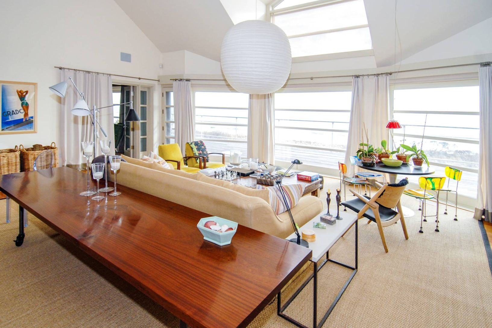 Previously published in Elle Decor magazine, this elegantly decorated, contemporary home in the village of Sagaponack sits directly on the Atlantic Ocean. Complete with soaring ceilings, this home offers six bedrooms and six baths, a media room, a den/office, bar and a gym as well as a heated pool and spa, all sited on 2.3+/- very private acres.
