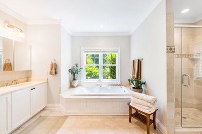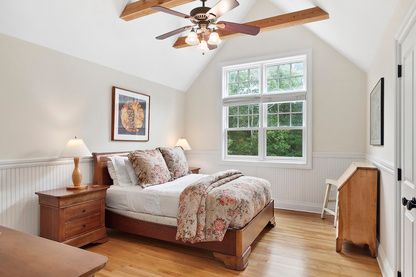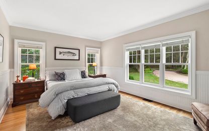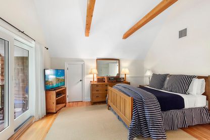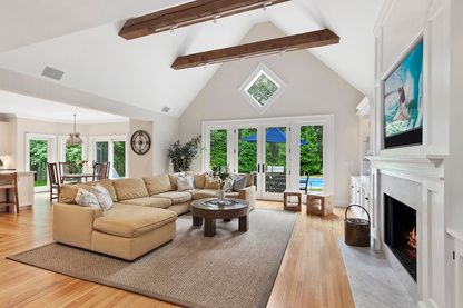Conveniently located between East Hampton and Sag Harbor, this 5,000 square foot post modern has everything!. There are five bedrooms and four and a half baths. The living room has a double height beamed ceiling, a wood burning fireplace and French doors that look out to the well-landscaped garden and heated pool. The kitchen has top quality stainless steel appliances, including a Viking gas range, custom cabinets, and granite counters. Ther
