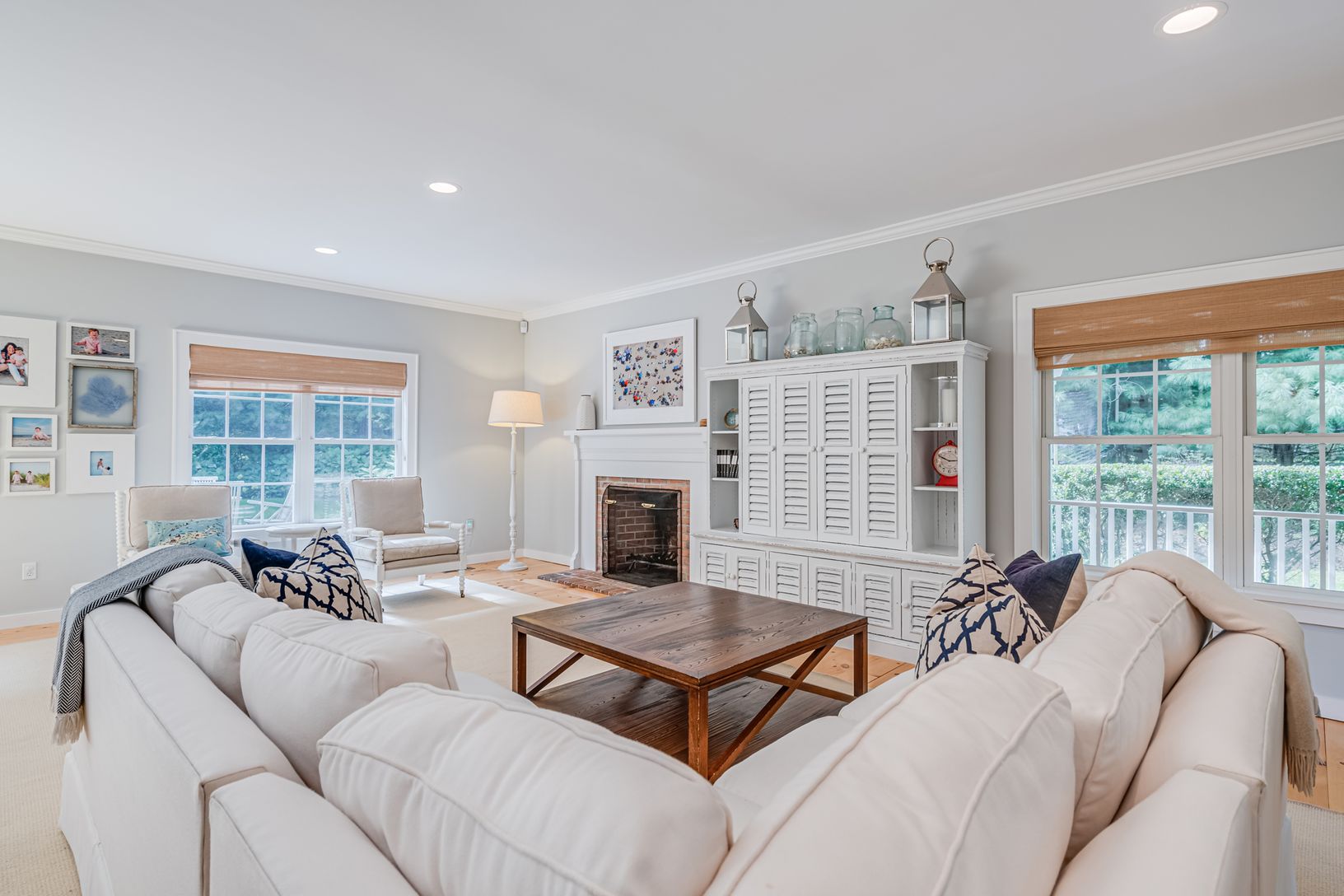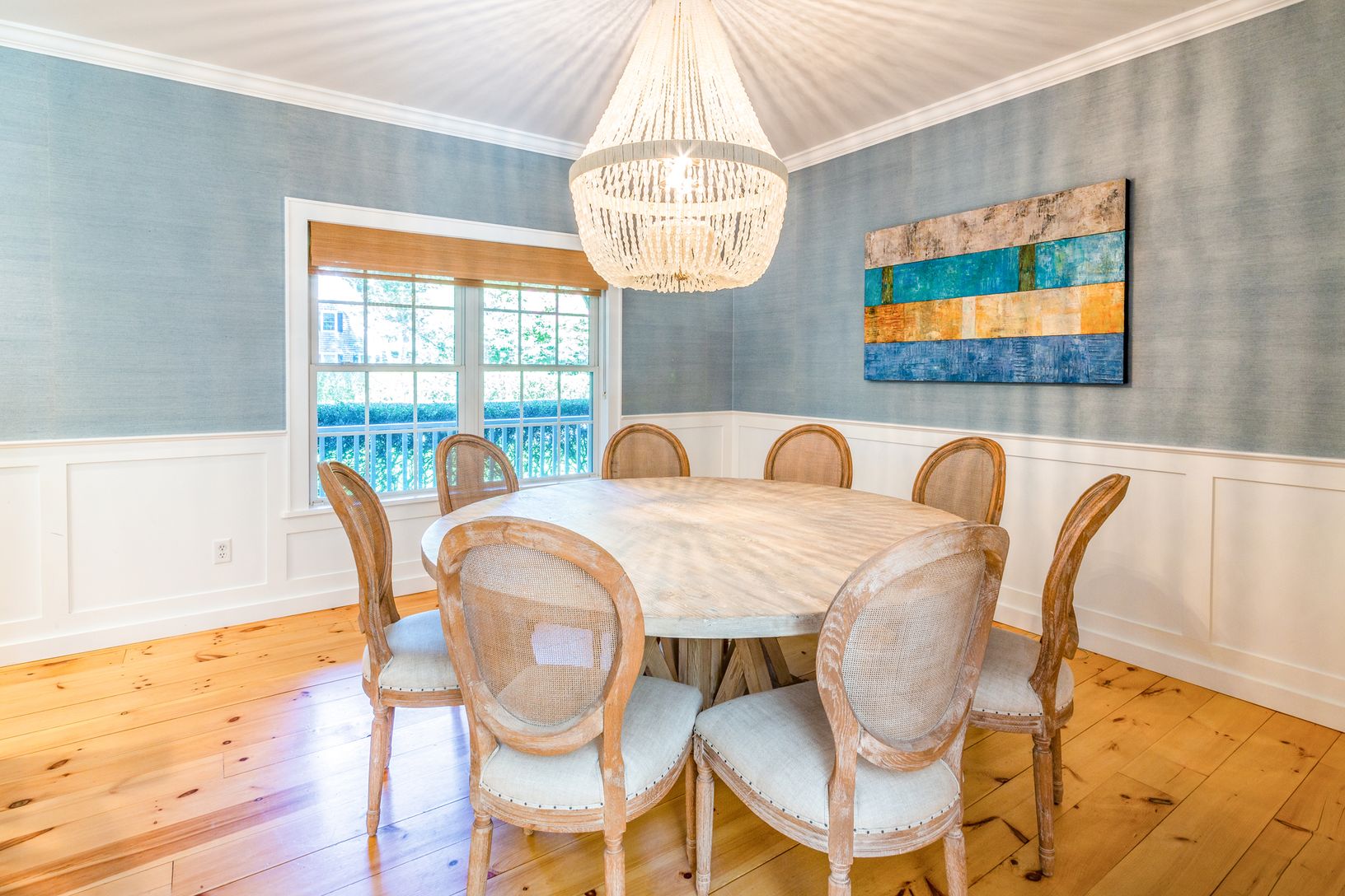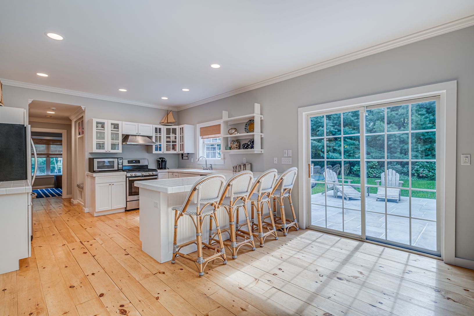 Bright and inviting two-story traditional home in Bridgehampton has four spacious bedrooms and four baths on 0.57+/- acre. A wraparound porch welcomes you to this crisp and clean, well maintained home. Open first floor living areas include a living room with fireplace, eat-in kitchen with stainless steel appliances and counter seating; there is also a formal dining room. Sliding glass doors open to a large bluestone rear patio. A first floor b