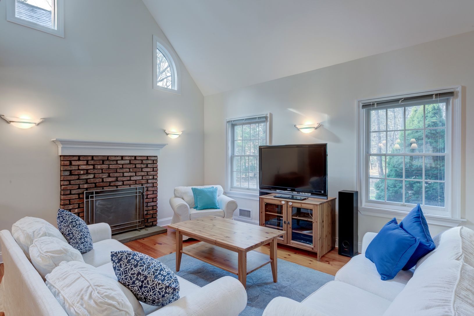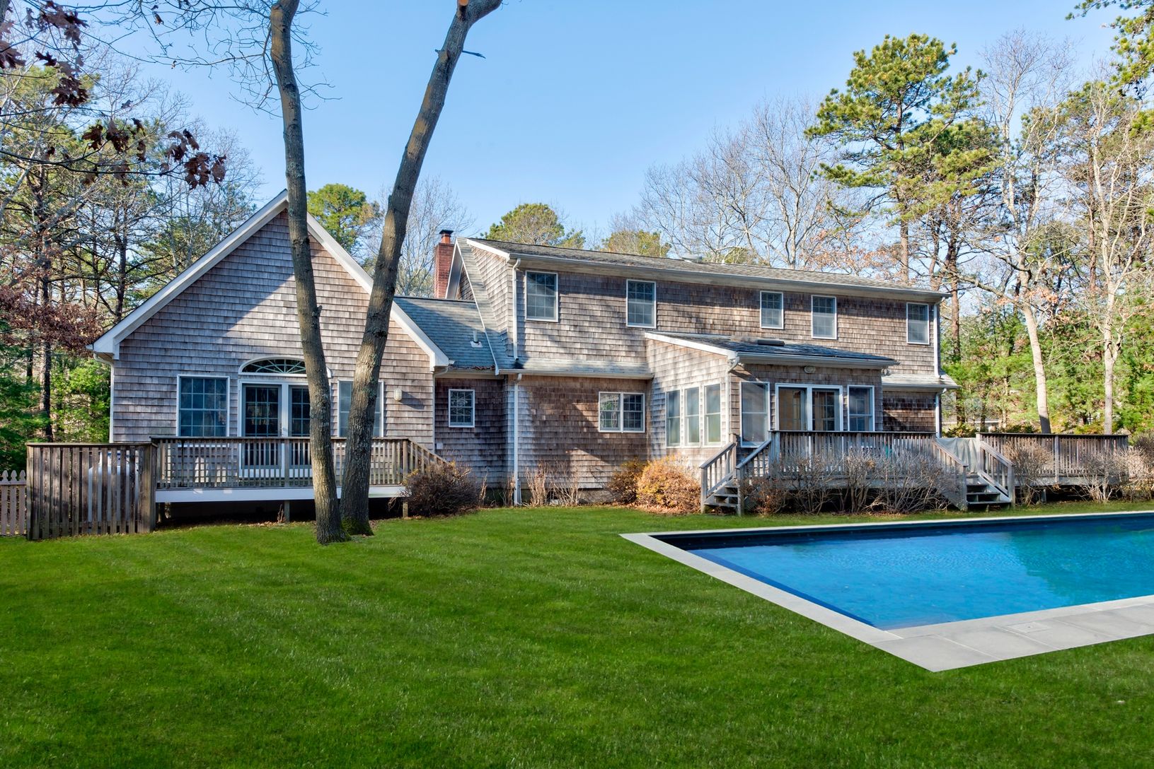 This beautiful traditional house offers open living room, kitchen and sun-drenched dining room. There are French doors leading to large deck overlooking the pool. The house has every amenity and is perfect for entertaining a house full of family and guests. The master bedroom with private balcony is on one side of the house with two guestrooms and bath on the other side and two more guest rooms and a bath upstairs offering privacy for all a