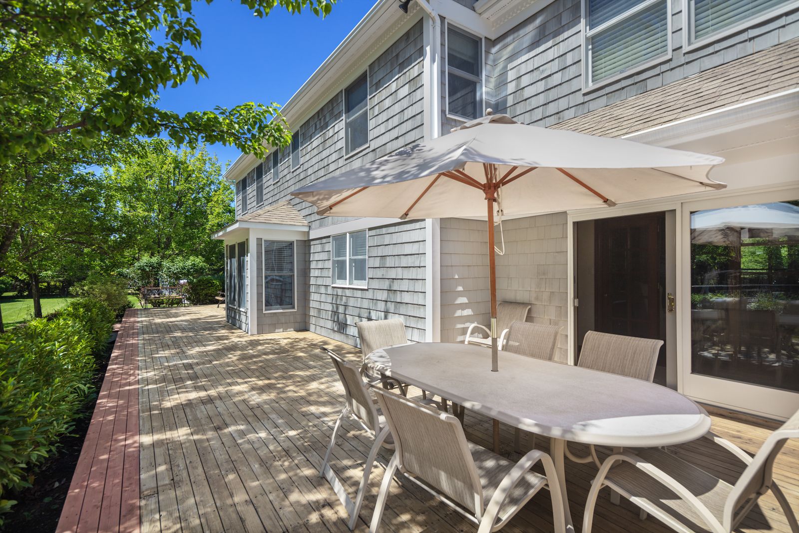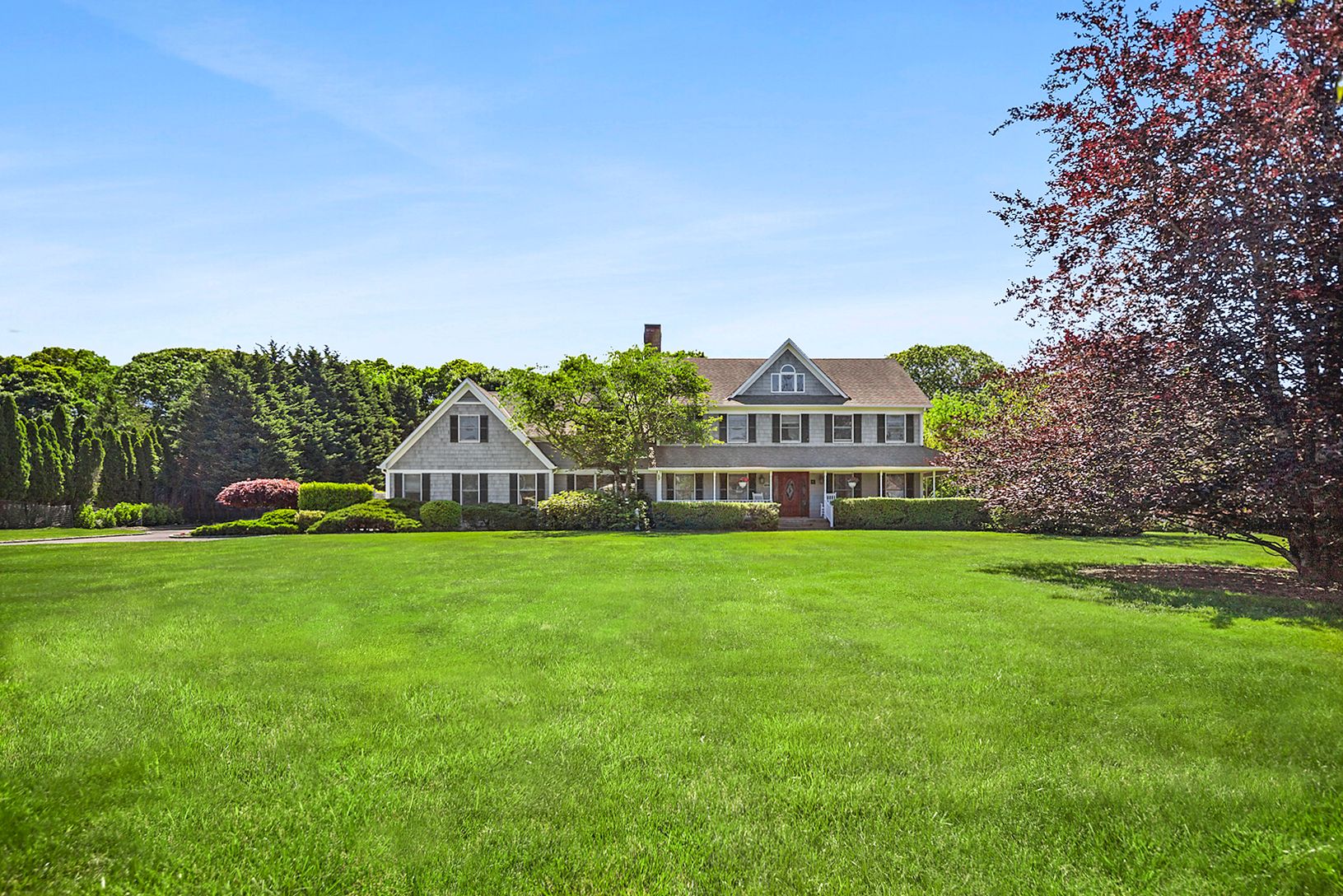 Set on 1.5 acres south of the highway, this updated, traditional Hamptons home offers significant indoor and outdoor space amidst beautiful landscaping and sprawling green lawn. The charming rocking chair porch welcomes you inside, where the entry foyer opens into a formal dining room and home office. The sizable eat-in kitchen offers a large center island, breakfast nook, and adjacent den with fireplace. A formal living room with fireplace