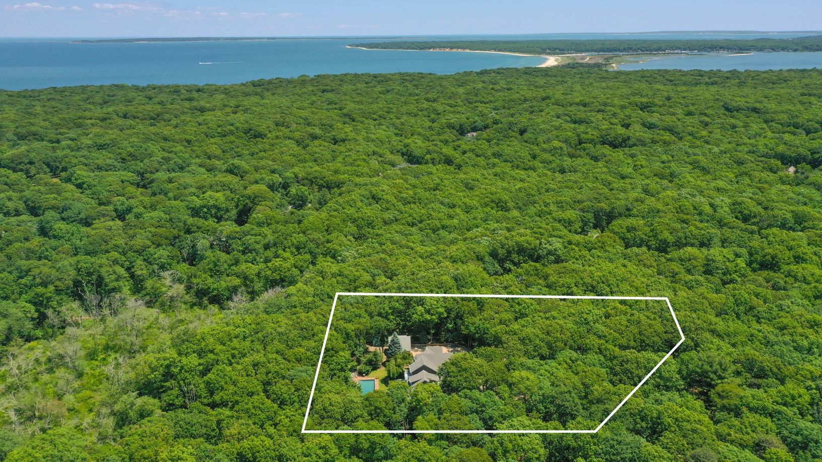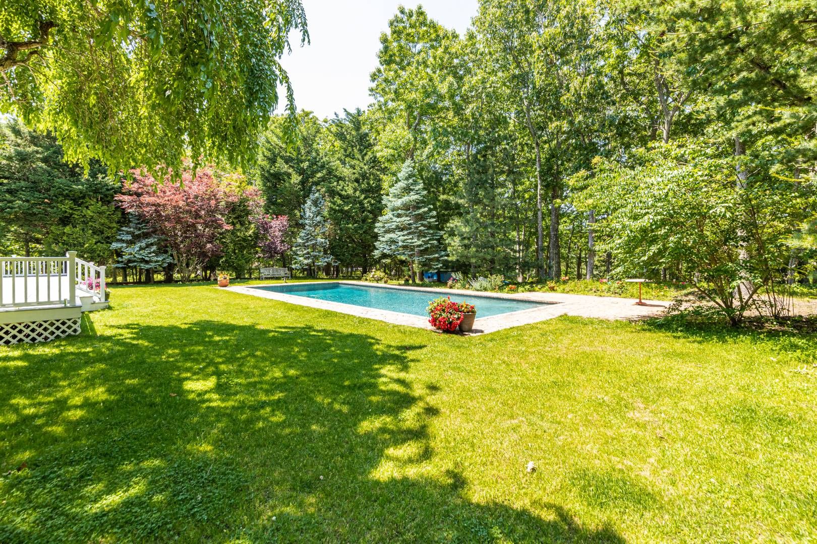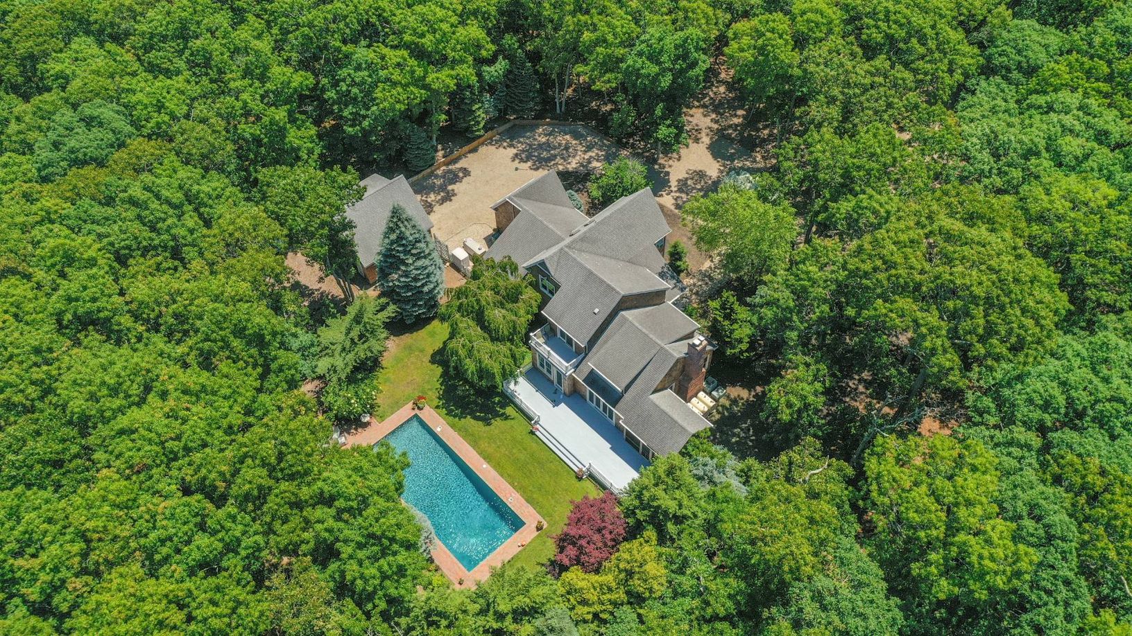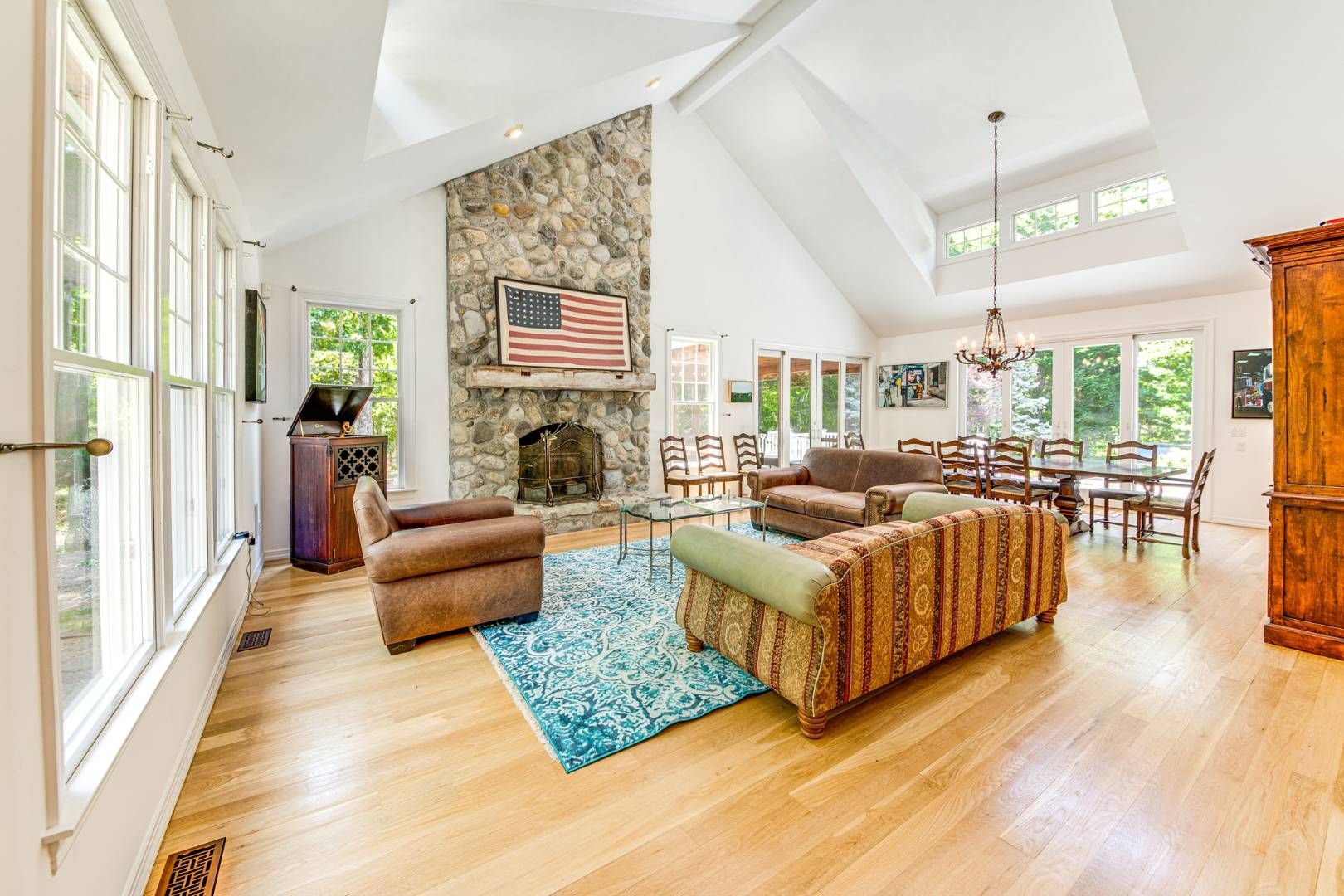 On a quiet cul-de-sac in East Hampton's Northwest Woods this impeccably maintained home sits on 1.7 acres and abuts a 25 acre reserve for ultimate peace and privacy. The newly renovated 4490+/- sq. ft. custom built home is bright and spacious, offering 4 bedrooms and 5.5 baths. Enter into a light-filled, open concept great room with double height cathedral ceiling and a floor to ceiling fieldstone fireplace, which flows onto a delightful scree