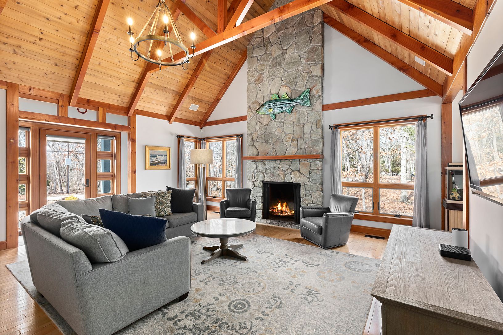New to the market in a Southampton Waterfront community with neighborhood marina and boat docks 100 yards from your front door. Quality craftsman post and beam style with all-natural wood flooring and beams throughout, or paint white for a truly modern style. 5 bed, 3.5 ba, 3500+/- sq ft of finished space with vaulted ceilings throughout. Easy living with first floor primary bedroom suite plus 2 additional bedrooms all on first floor. Open ki