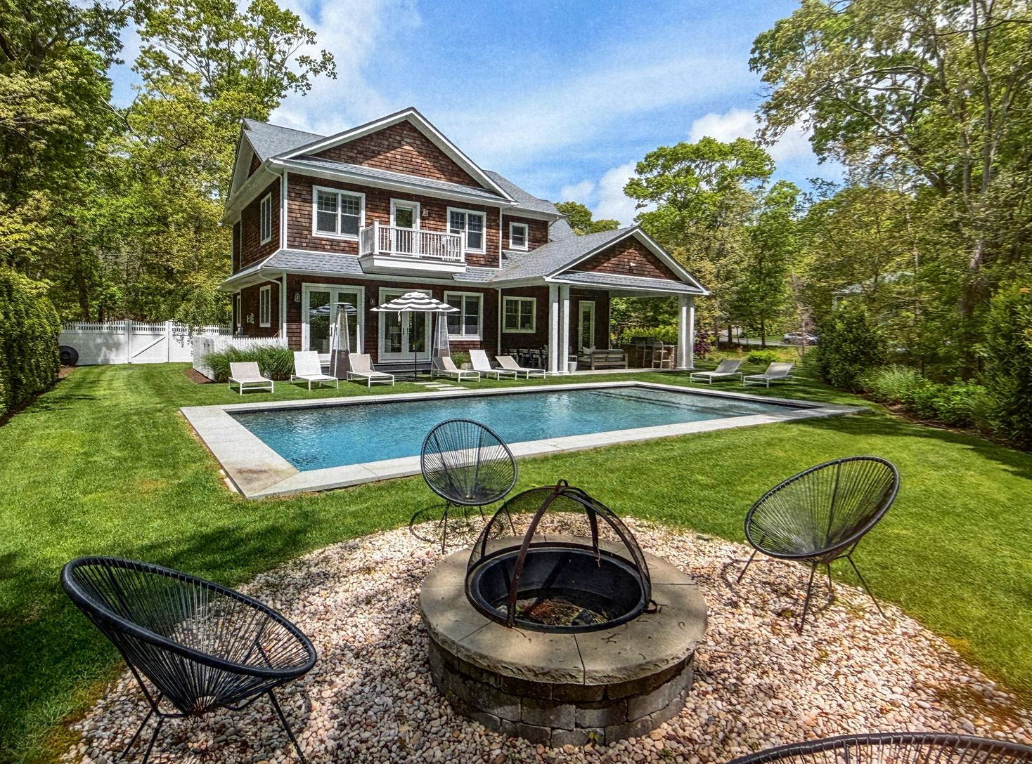 Soak up the summer in this elegantly furnished Sag Harbor Home on beautiful grounds with tons of upgraded finishes inside and out! Four bedroom 2-story home with 3 full bathrooms and 2 half baths and fully finished man-cave basement with full sports bar, game room, workout room, and movie room. High Ceilings throughout, wide plank white oak lt grey floors, open kitchen with top of the line appliances. Walk outside through the french doors o