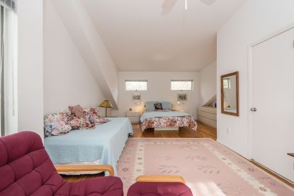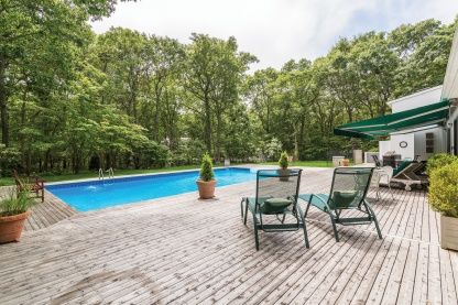 Well maintained contemporary located in East Hampton Village Fringe at the end of a quiet cul-de-sac street on a 1+ acre parcel. The home features a cathedral ceilinged living room / dining room area, a ground level master bedroom, heated pool, and an attached one-car garage. Master bathroom has been beautifully renovated and the kitchen features stainless steel appliances. Gardens are lushly landscaped. Fifth bedroom is actually a sitting ro