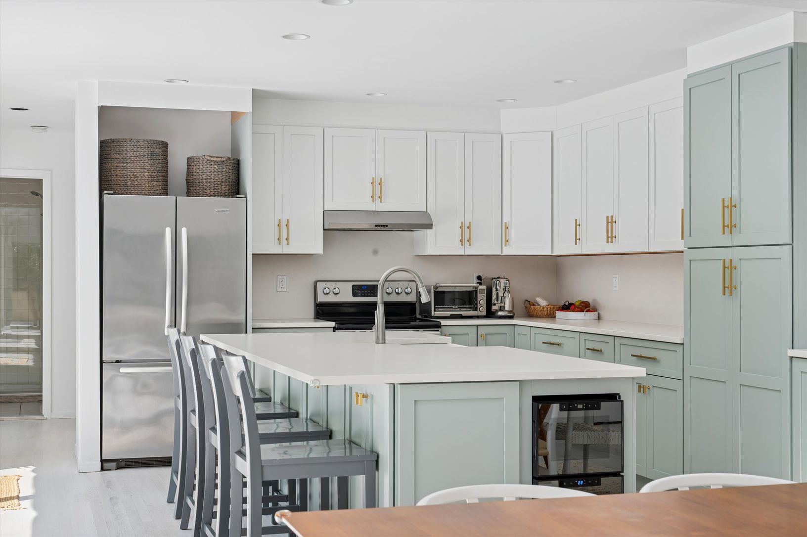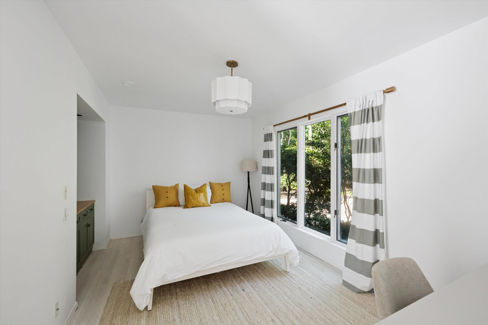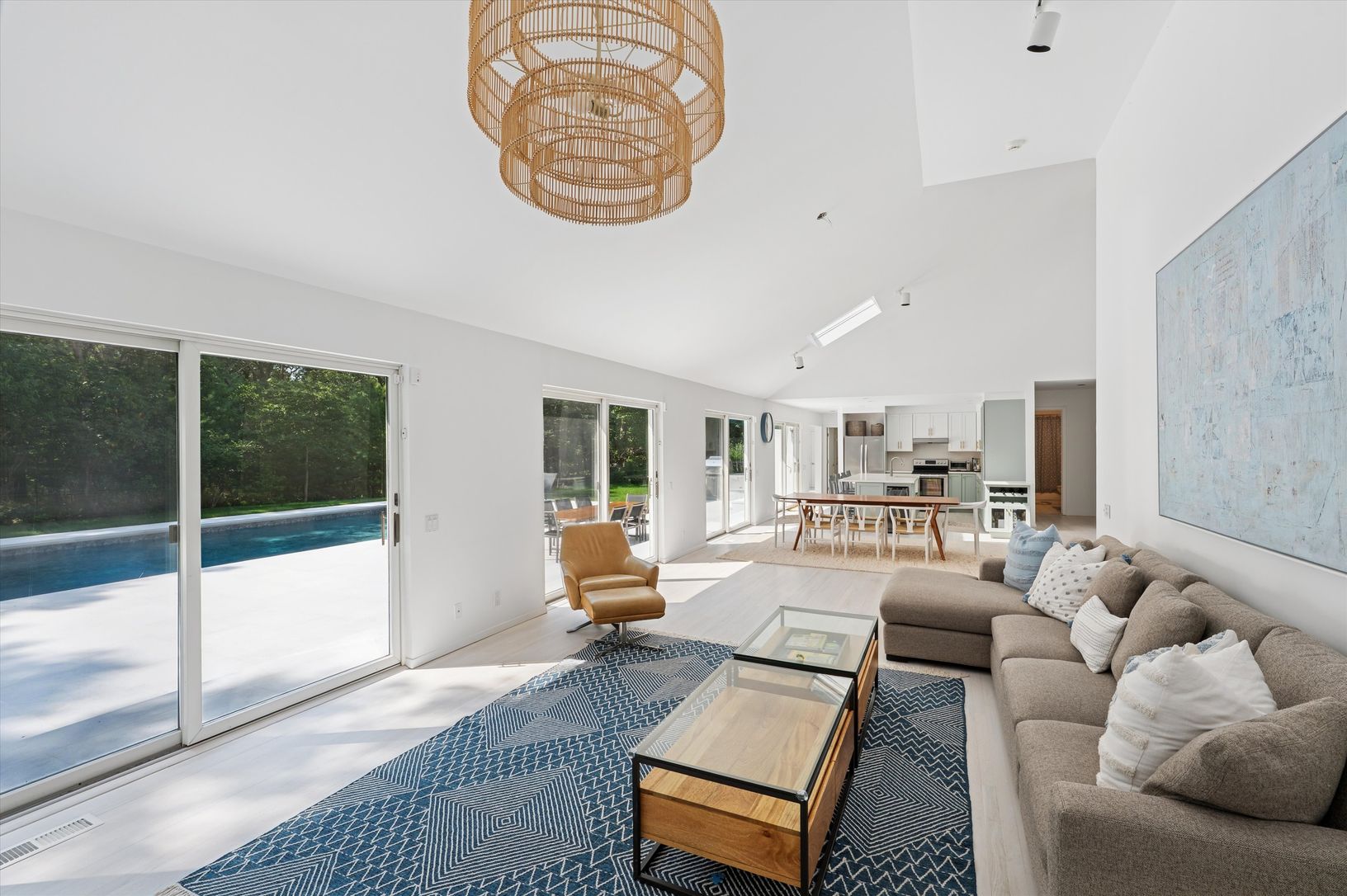 This beautifully renovated and thoughtfully decorated five-bedroom home is located at the end of a quiet cul-de-sac, just minutes from East Hampton Village and within easy reach of Sag Harbor, Wainscott, and the ocean beaches. Set on over an acre, the home offers a bright, airy layout with cathedral ceilings and a seamless flow between the kitchen, dining, and living areas. Glass sliding doors along the back of the house create a smooth connec