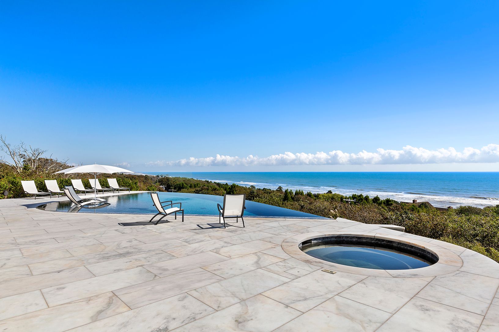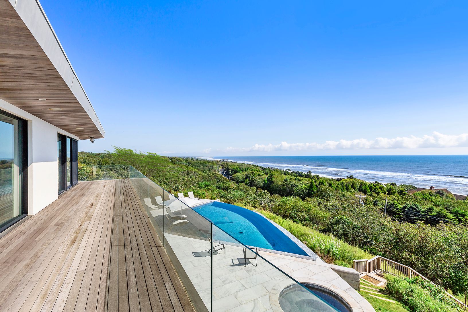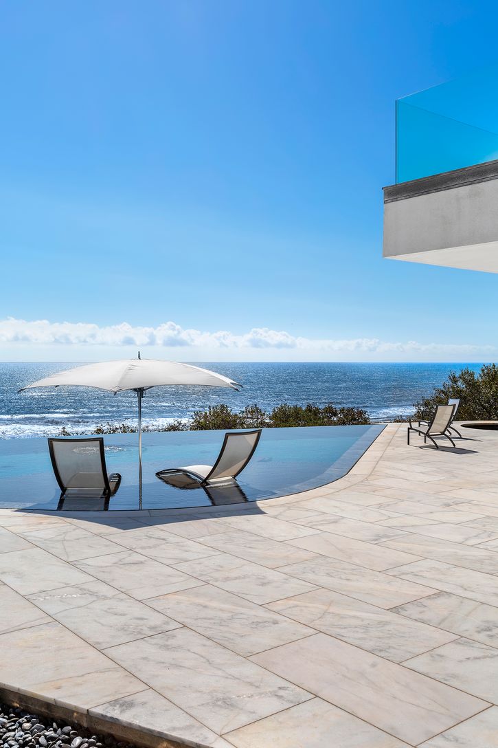 Available Beginning September 15th 2021. Spectacular new home with breathtaking views of the Atlantic from the moment you enter. This magnificent modern masterpiece is built high up, with walls of glass throughout offering panoramic water views from nearly every room. The 7,300+/- sq. ft. layout features five en-suite bedrooms with ocean views, an additional guest room, and two powder rooms. The main living room has a dual-sided fireplace adja