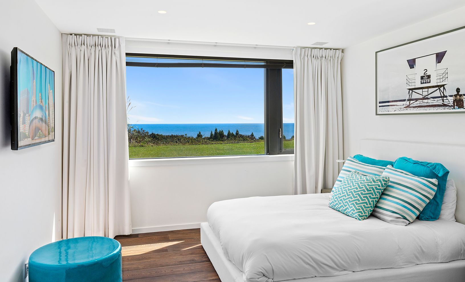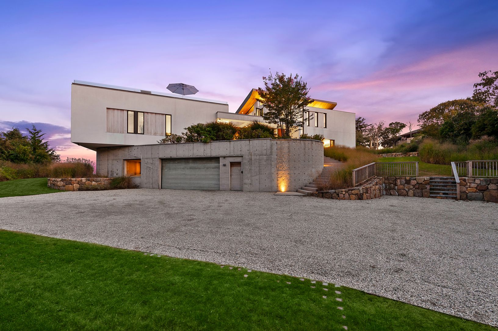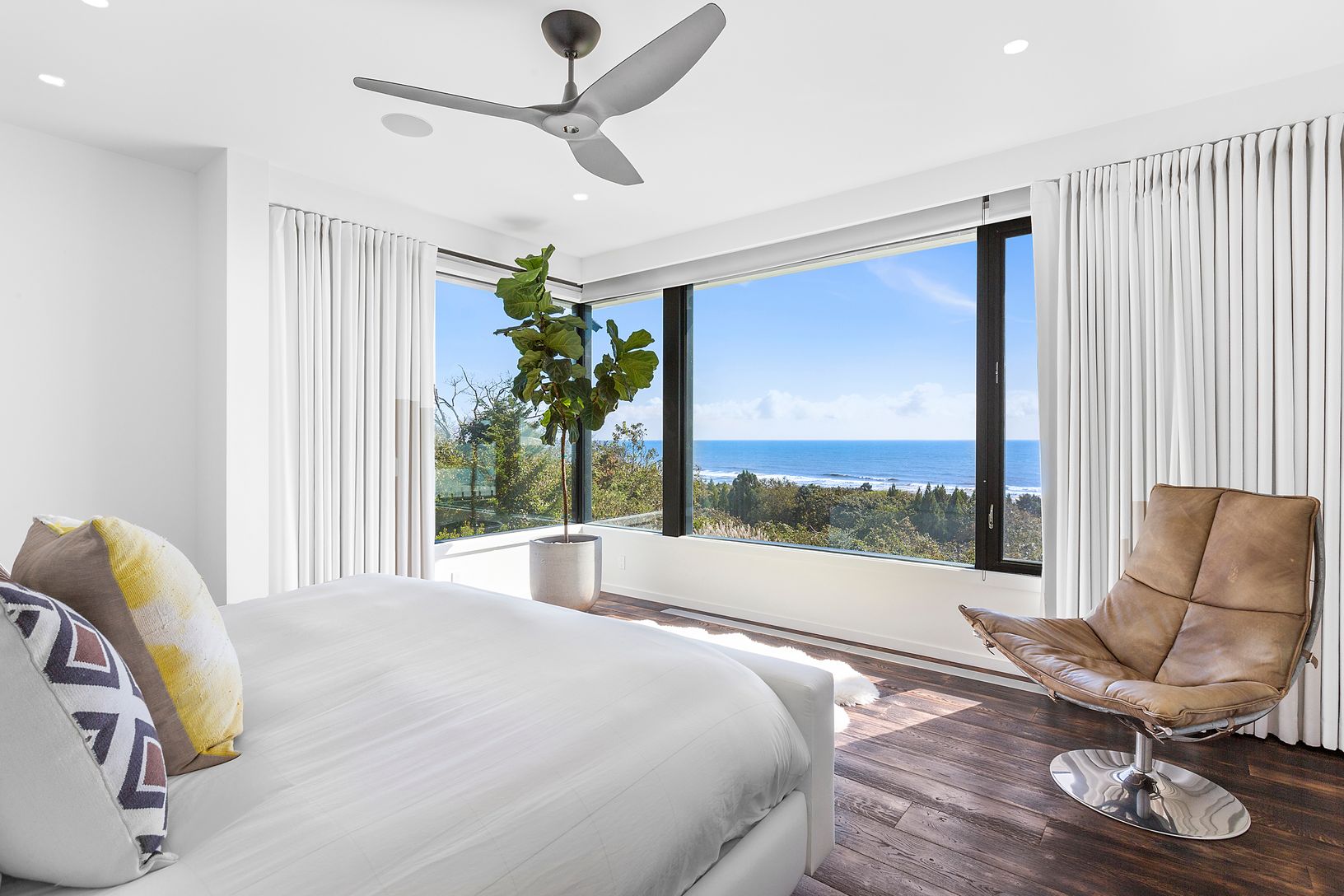 Available Beginning September 15th 2021. Spectacular new home with breathtaking views of the Atlantic from the moment you enter. This magnificent modern masterpiece is built high up, with walls of glass throughout offering panoramic water views from nearly every room. The 7,300+/- sq. ft. layout features five en-suite bedrooms with ocean views, an additional guest room, and two powder rooms. The main living room has a dual-sided fireplace adja