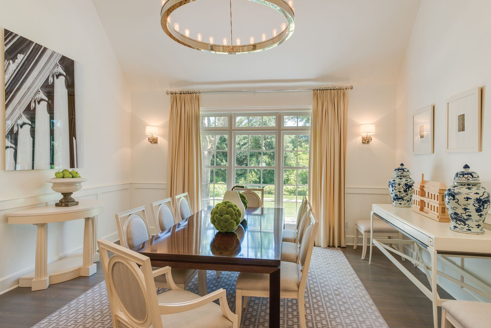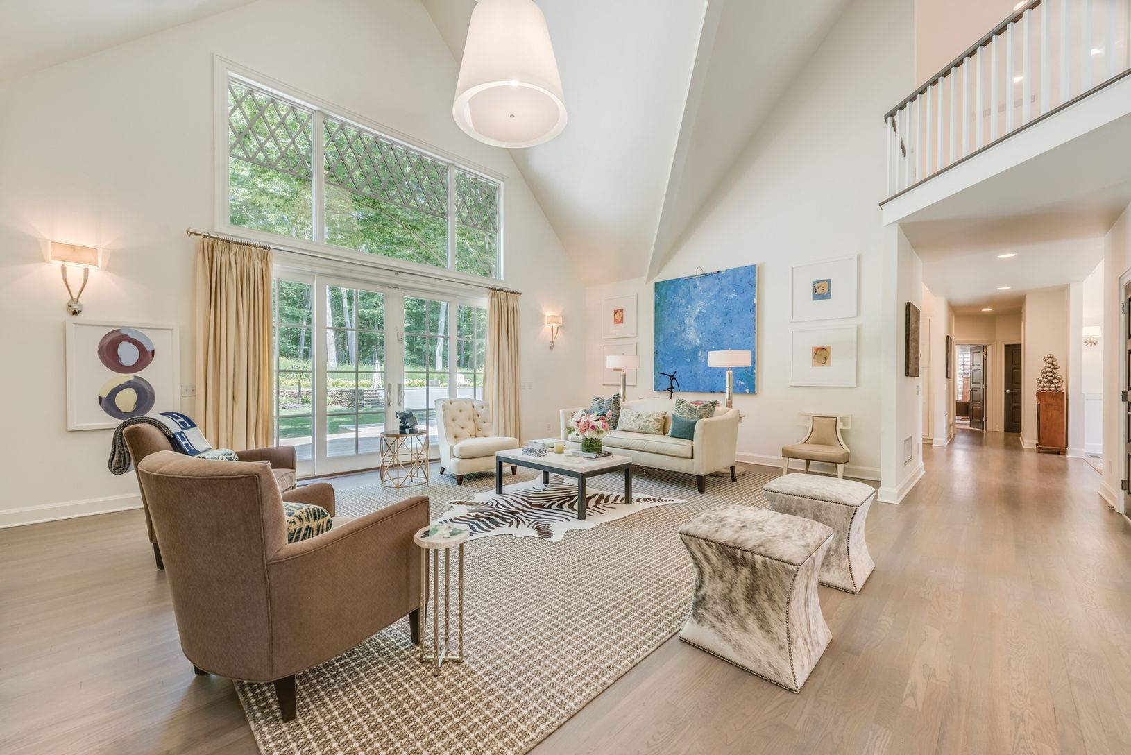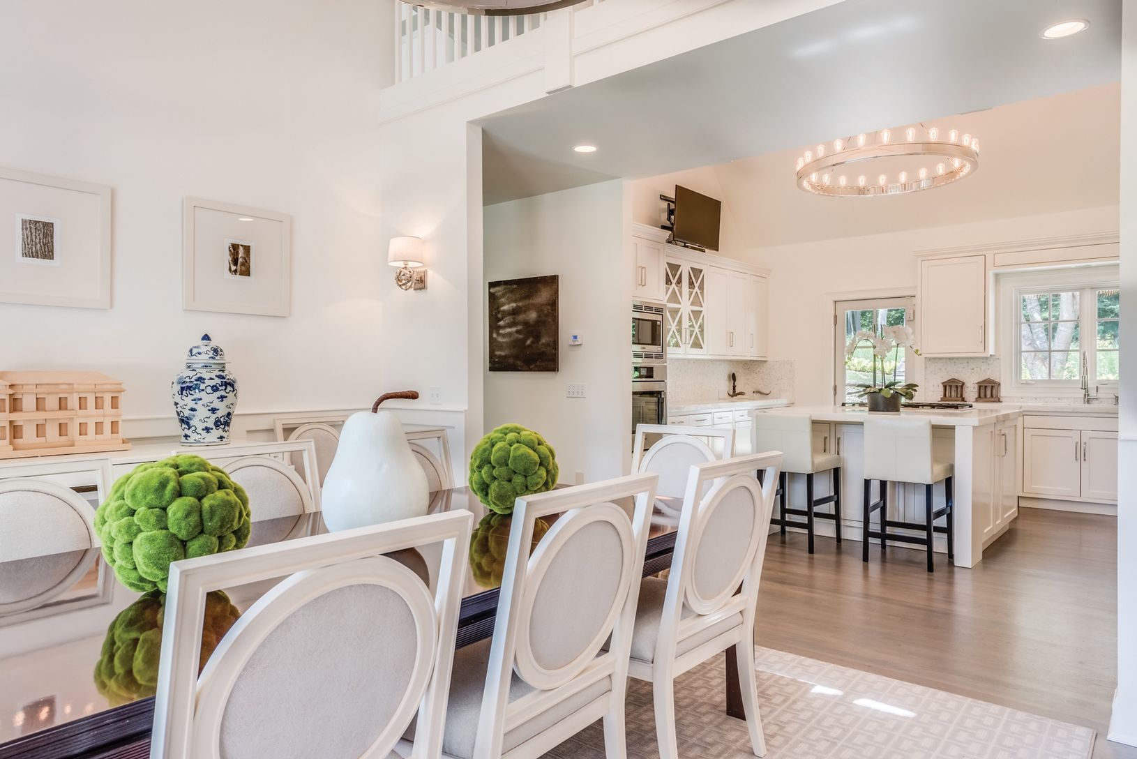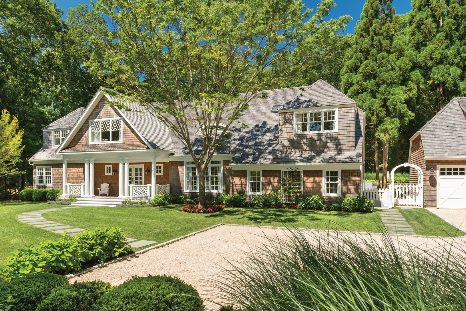 Moments to East Hampton Village and tucked away on a bucolic lane and adjacent to 45 acres of reserve, this gated five bedroom and six bath 4,650+/- sq. ft. residence is newly finished to perfection. Enter the light-filled foyer with views through the grand two-story living room with a large hearth to the lush gardens and award-winning pool animated with sparkling jets beyond. To the left down a hall is the master suite with fireplace, double