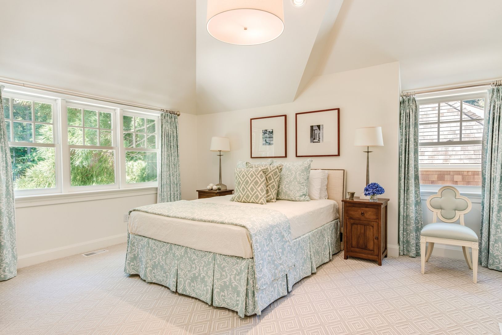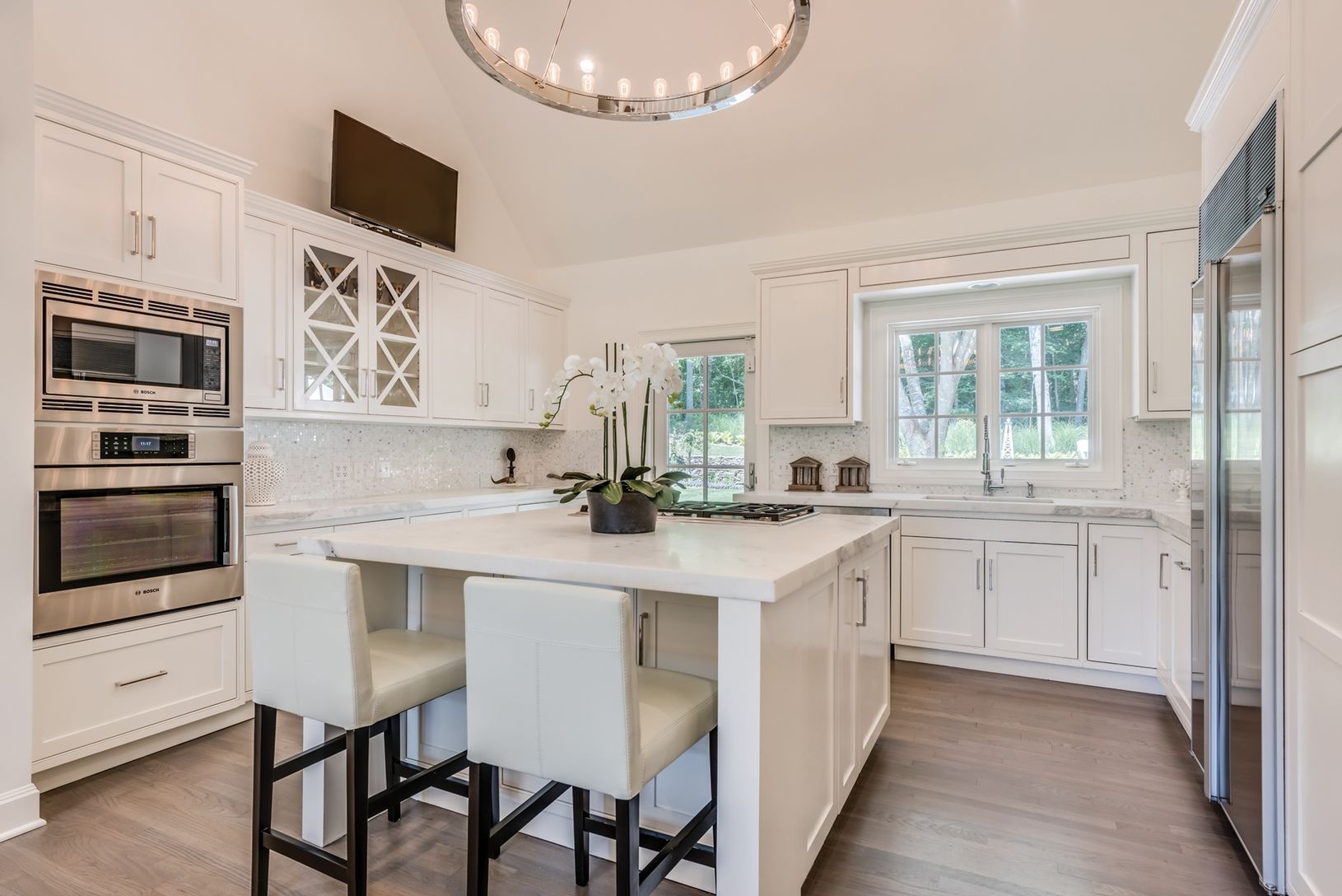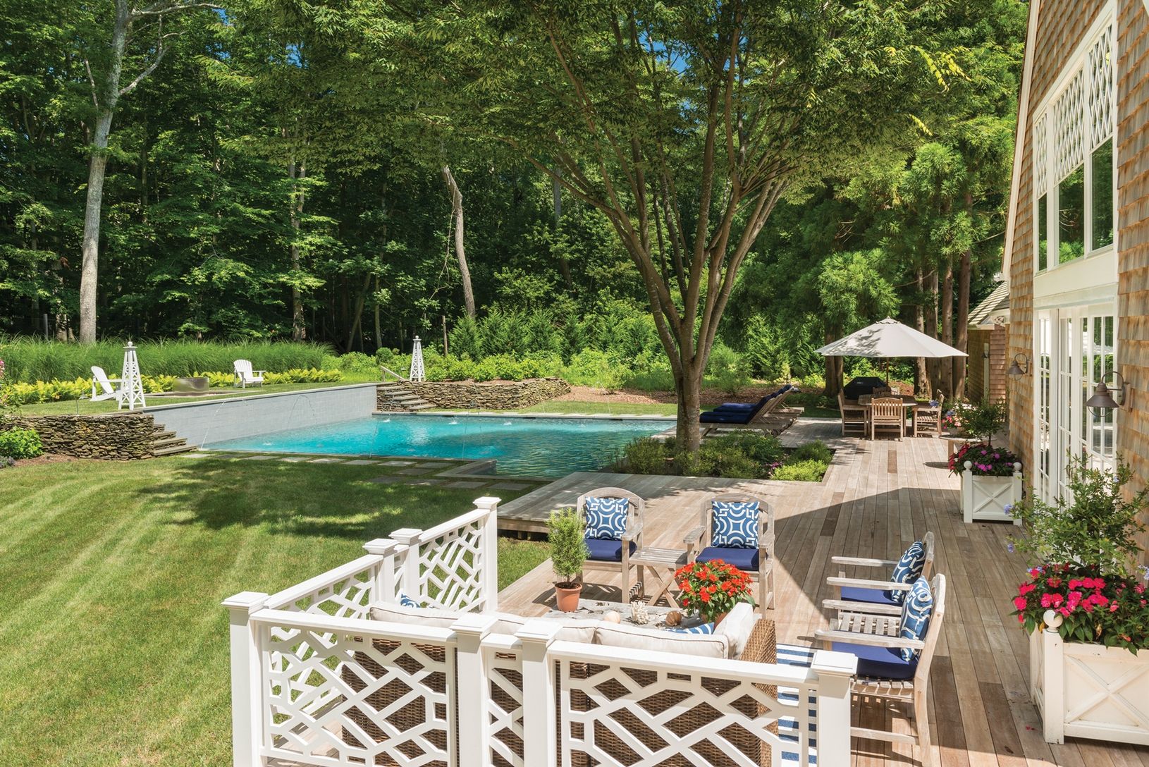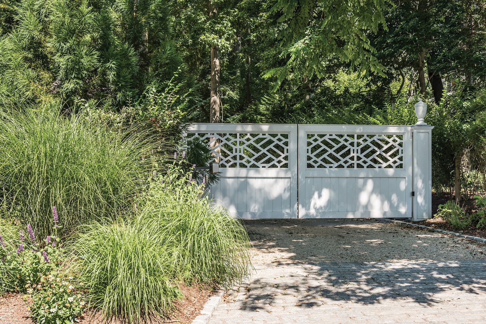 Moments to East Hampton Village and tucked away on a bucolic lane and adjacent to 45 acres of reserve, this gated five bedroom and six bath 4,650+/- sq. ft. residence is newly finished to perfection. Enter the light-filled foyer with views through the grand two-story living room with a large hearth to the lush gardens and award-winning pool animated with sparkling jets beyond. To the left down a hall is the master suite with fireplace, double