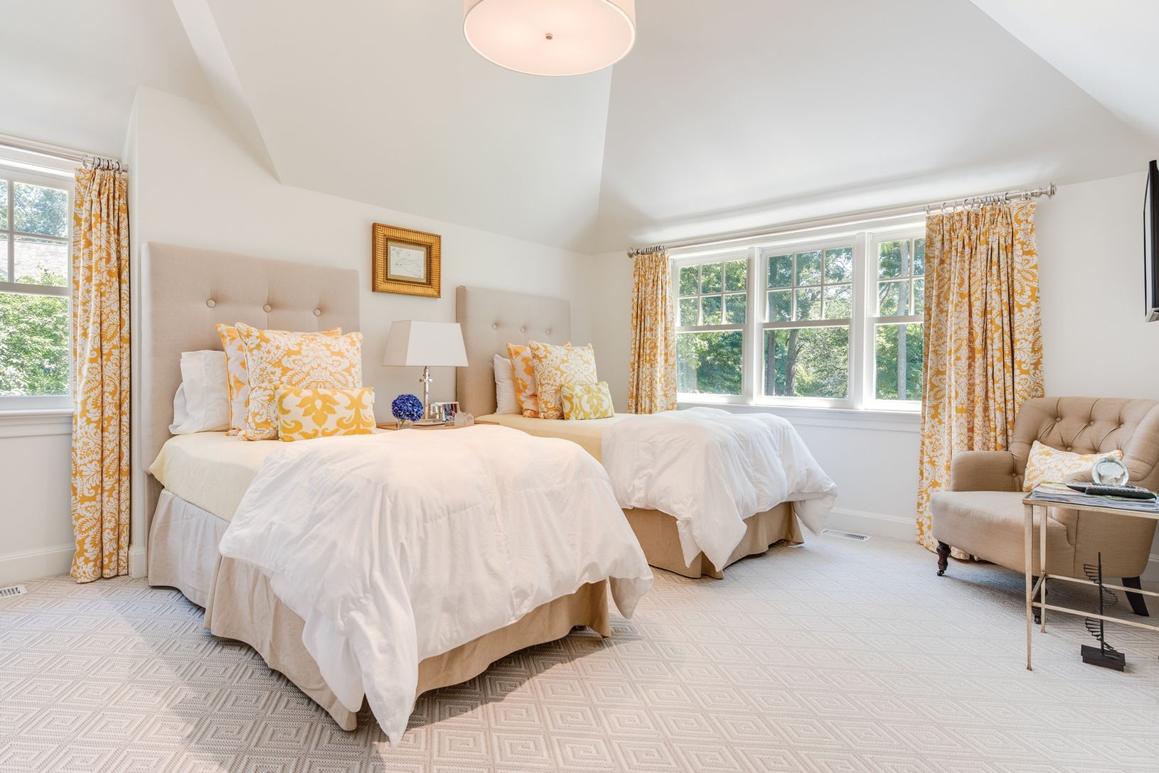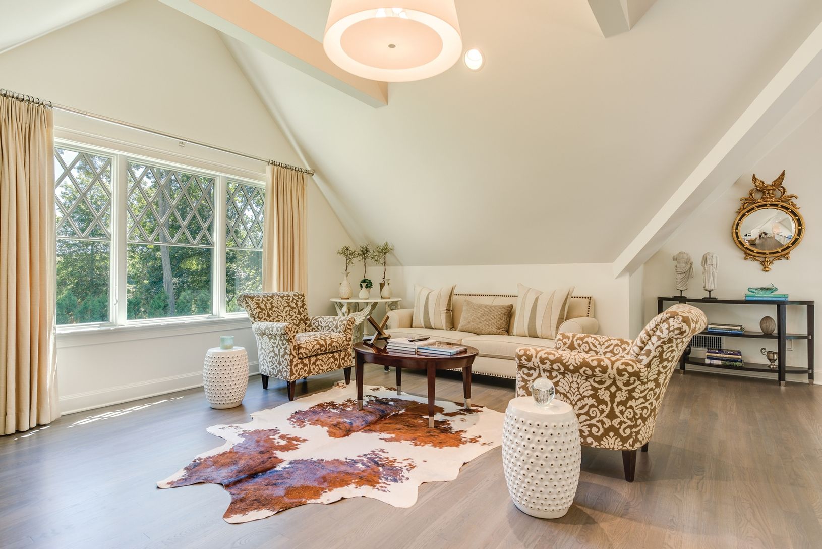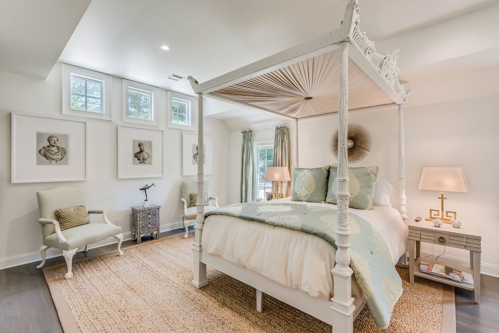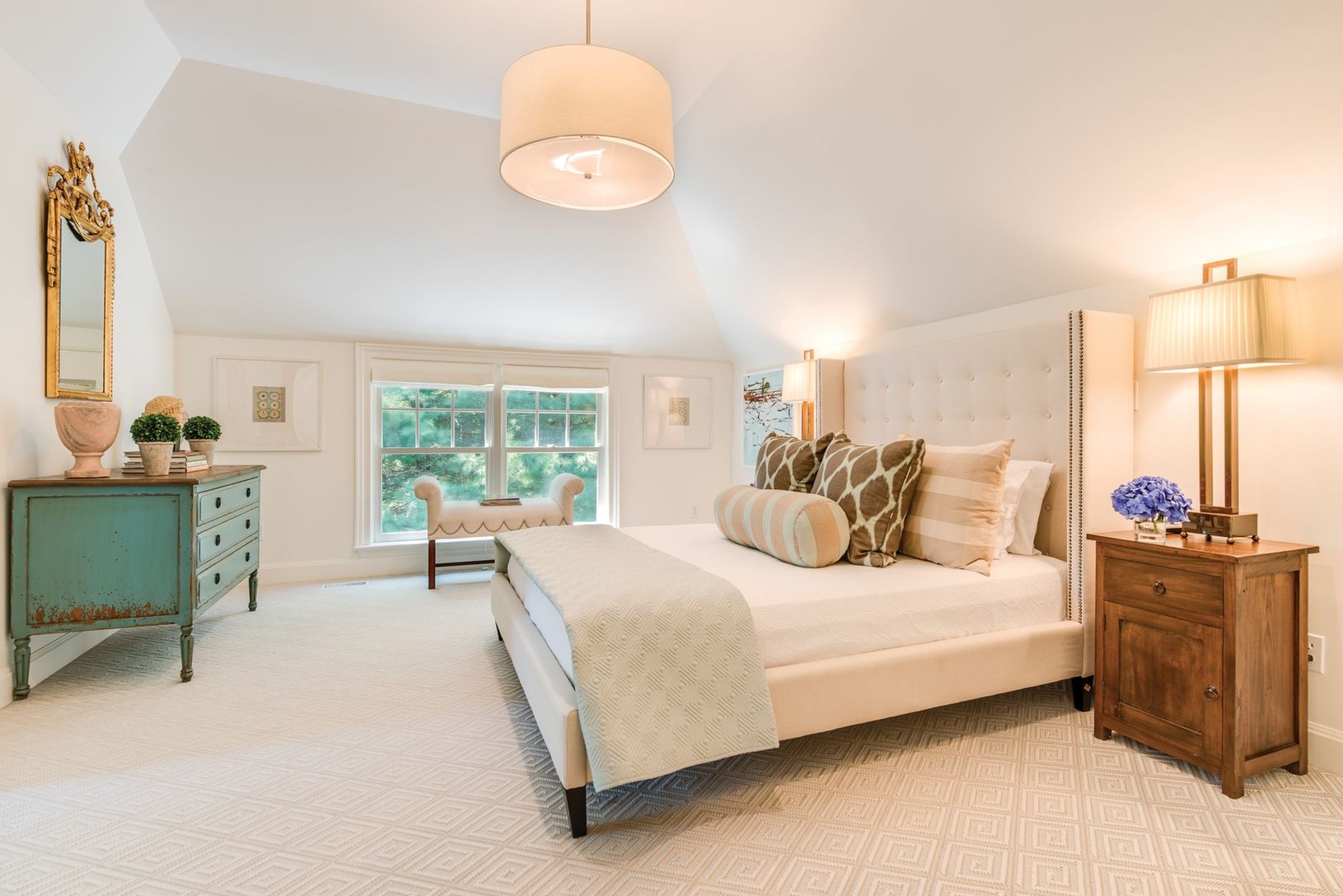 Moments to East Hampton Village and tucked away on a bucolic lane and adjacent to 45 acres of reserve, this gated five bedroom and six bath 4,650+/- sq. ft. residence is newly finished to perfection. Enter the light-filled foyer with views through the grand two-story living room with a large hearth to the lush gardens and award-winning pool animated with sparkling jets beyond. To the left down a hall is the master suite with fireplace, double