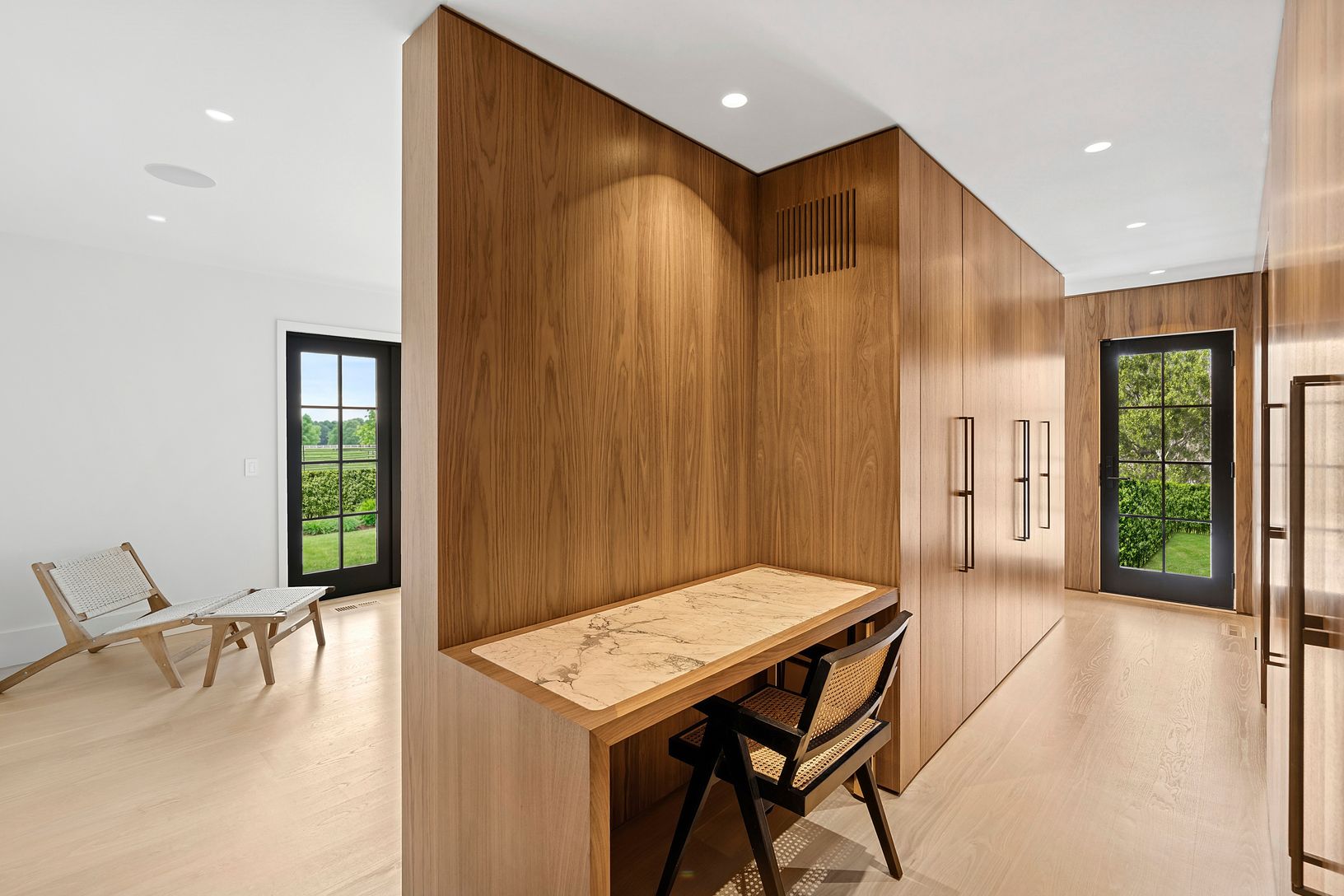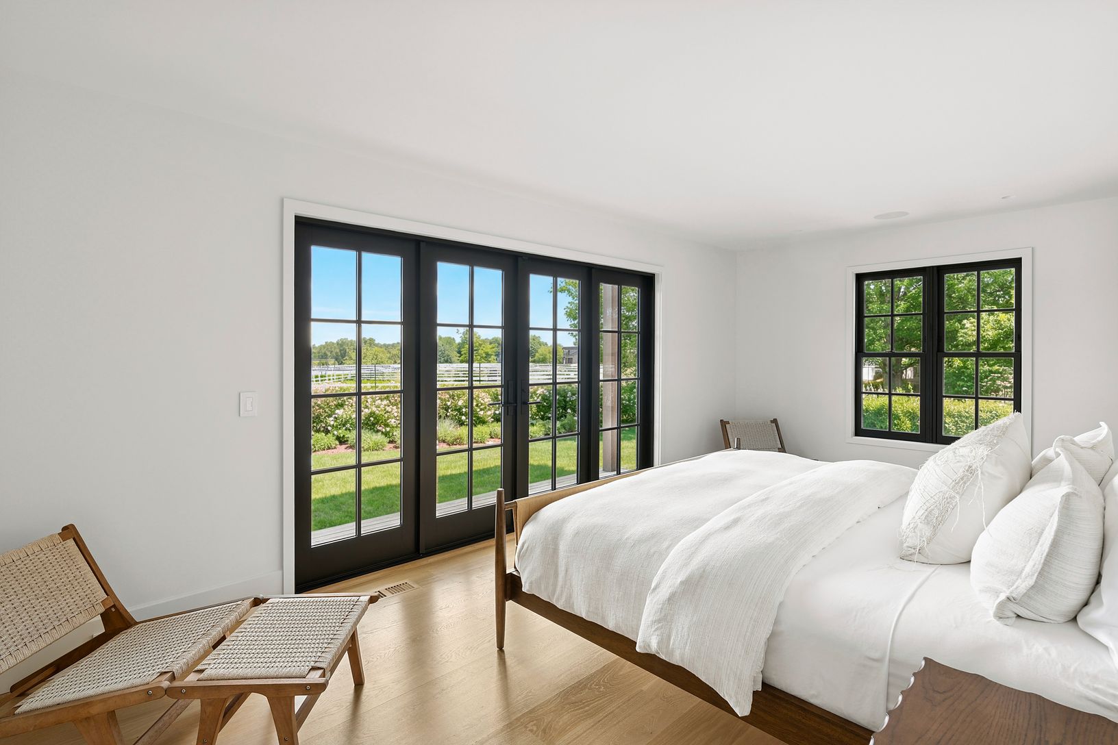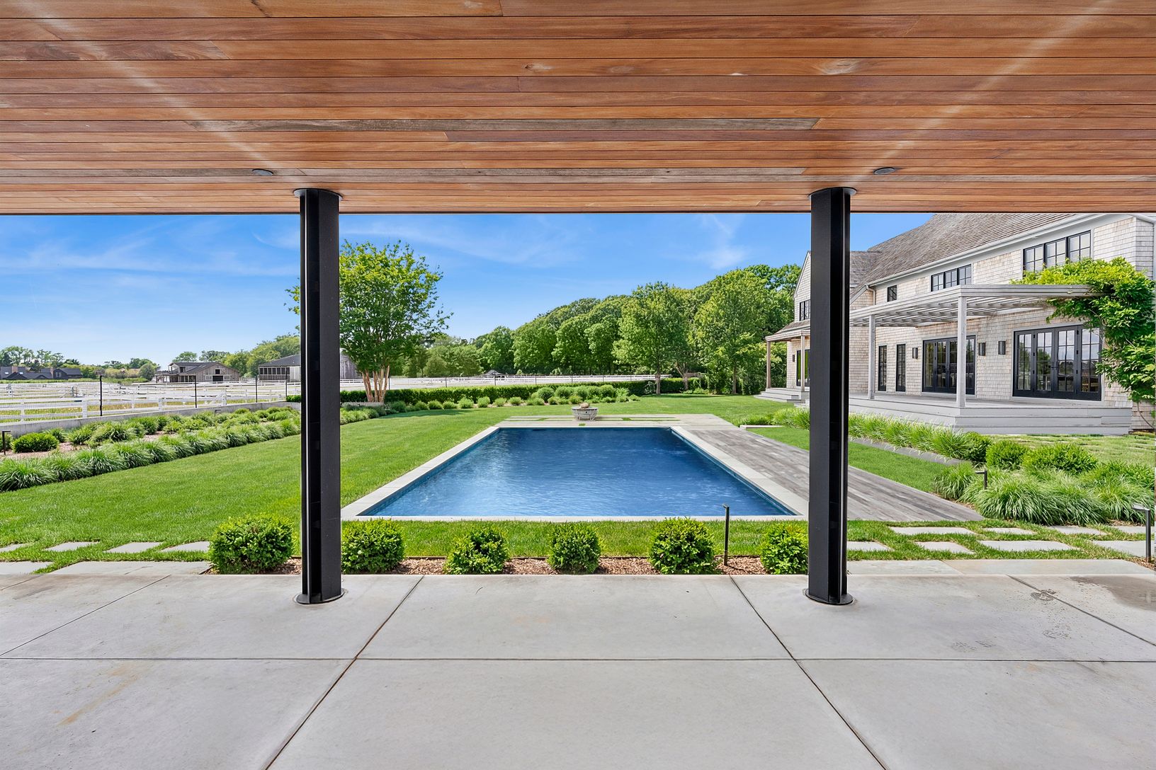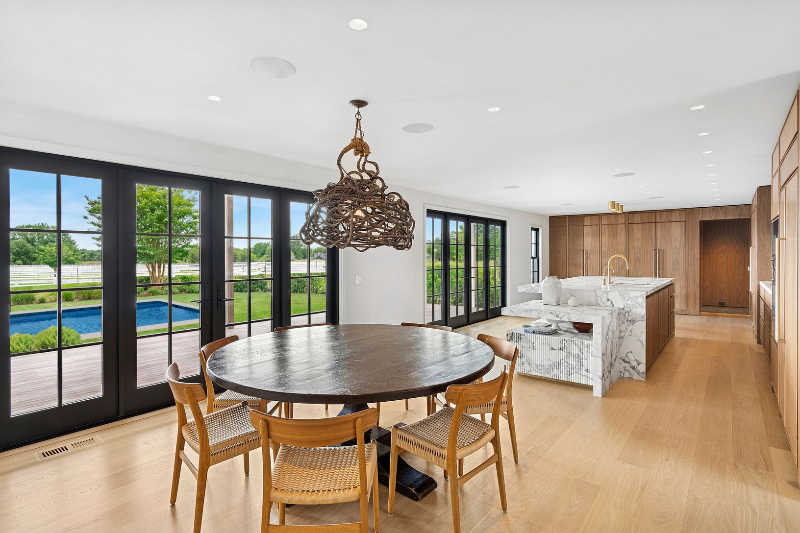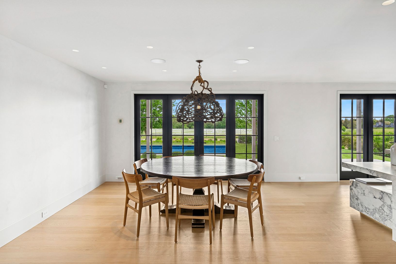 Overlooking 14 acres of agricultural reserve and open horse farm, this newly completed farmhouse delivers a rare summer offering in one of Wainscott's most coveted south-of-the-highway settings. Thoughtfully designed and impeccably executed, the home showcases exceptional craftsmanship and elevated finishes at every turn. A dramatic double-height foyer with limewash walls sets the tone, leading to a gracious living room with gas fireplace, sun