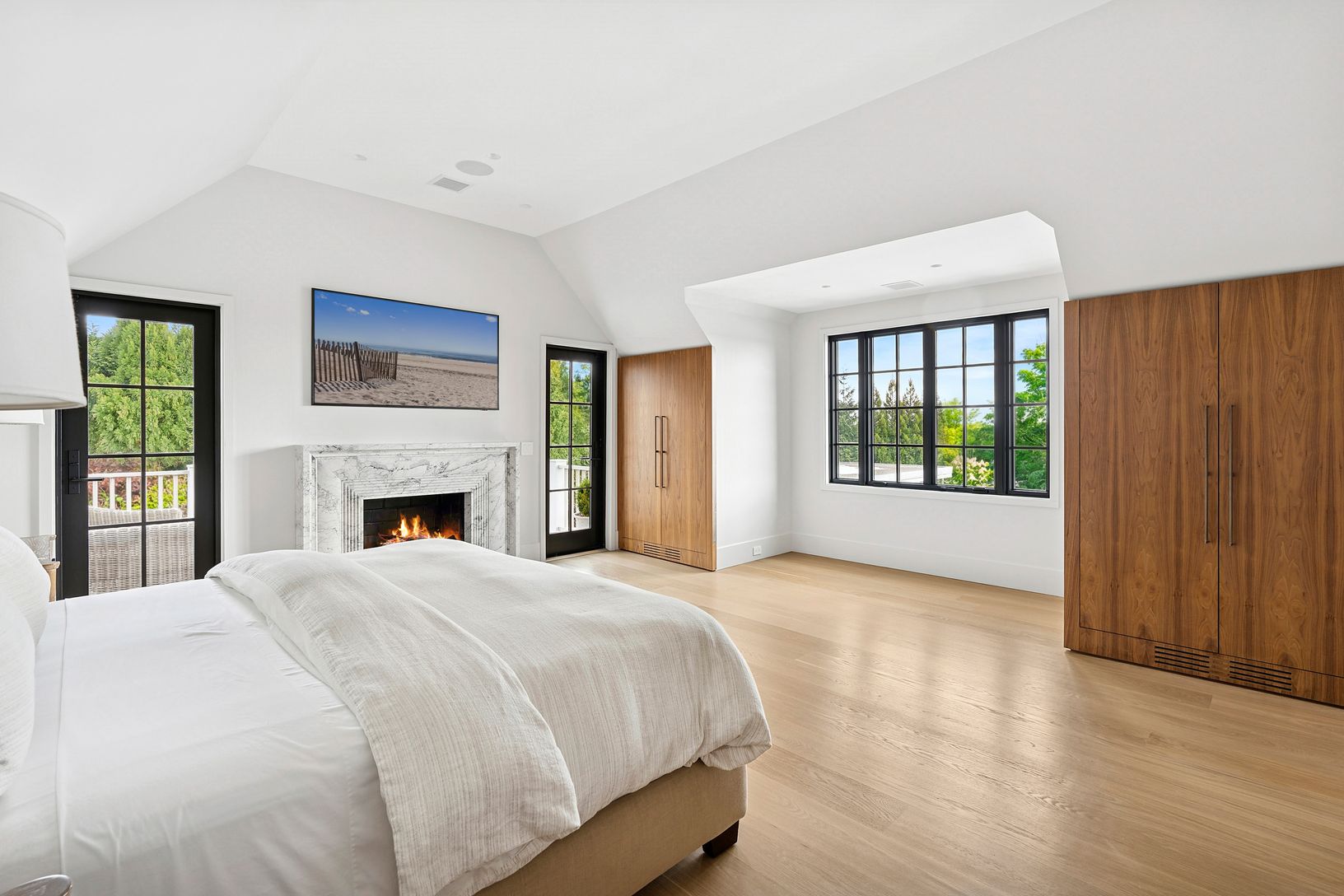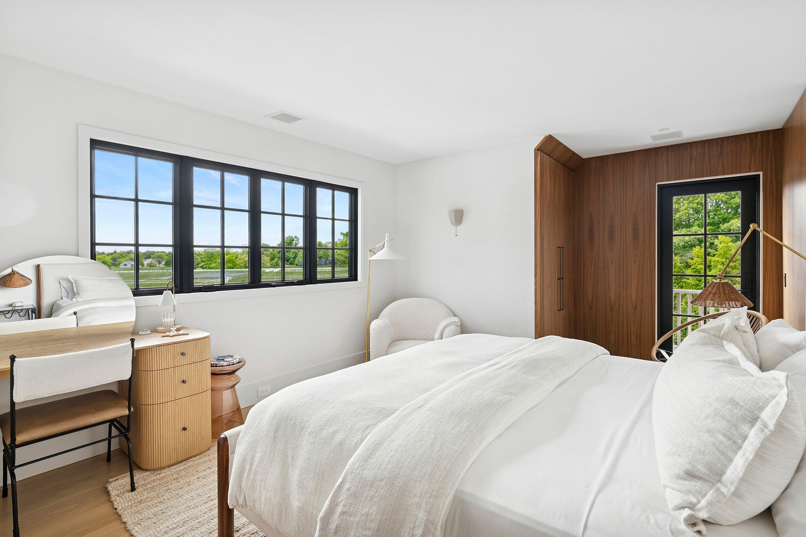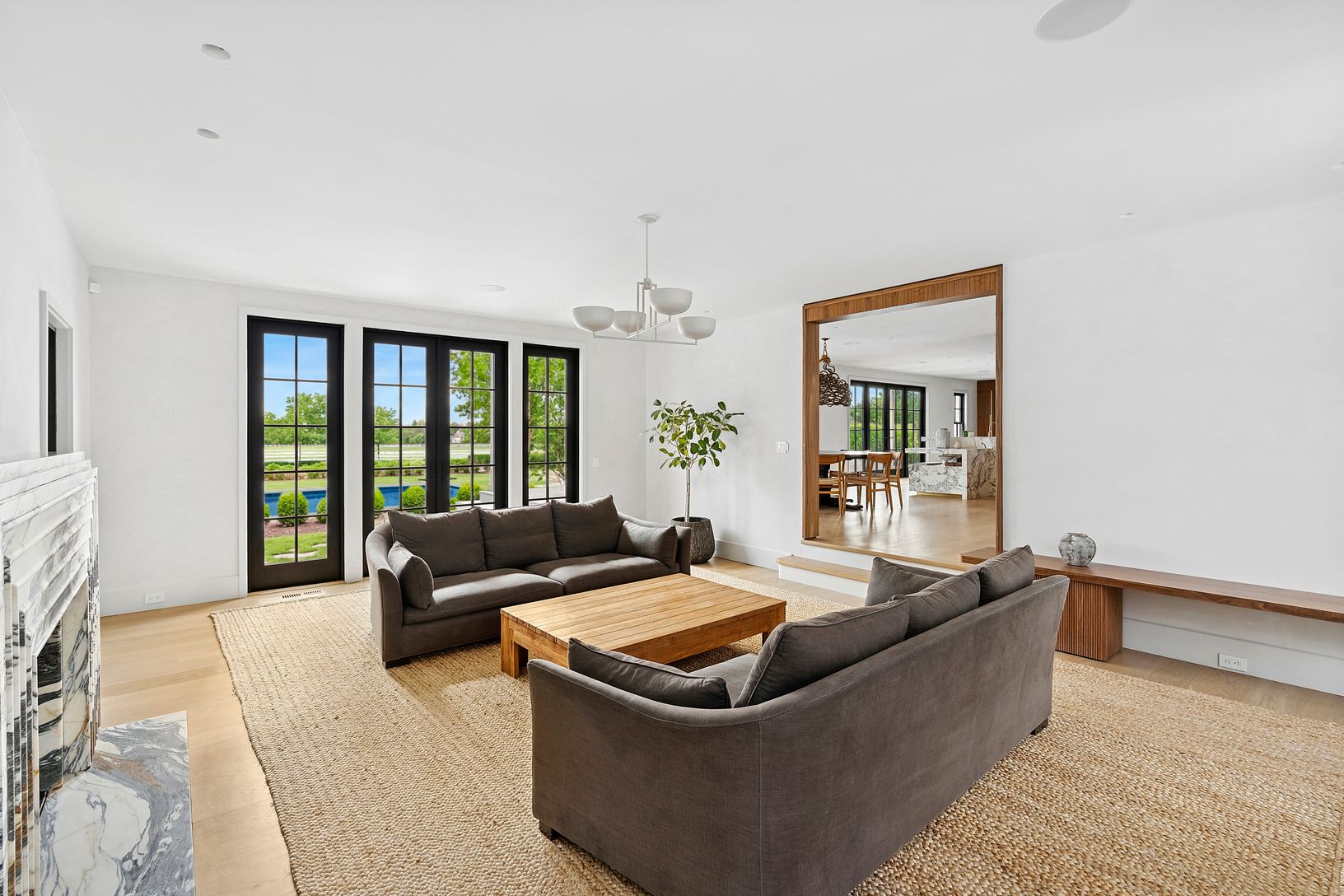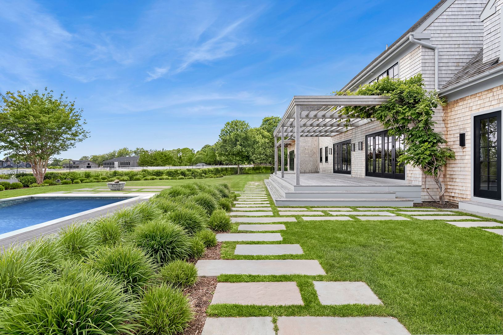 Overlooking 14 acres of agricultural reserve and open horse farm, this newly completed farmhouse delivers a rare summer offering in one of Wainscott's most coveted south-of-the-highway settings. Thoughtfully designed and impeccably executed, the home showcases exceptional craftsmanship and elevated finishes at every turn. A dramatic double-height foyer with limewash walls sets the tone, leading to a gracious living room with gas fireplace, sun