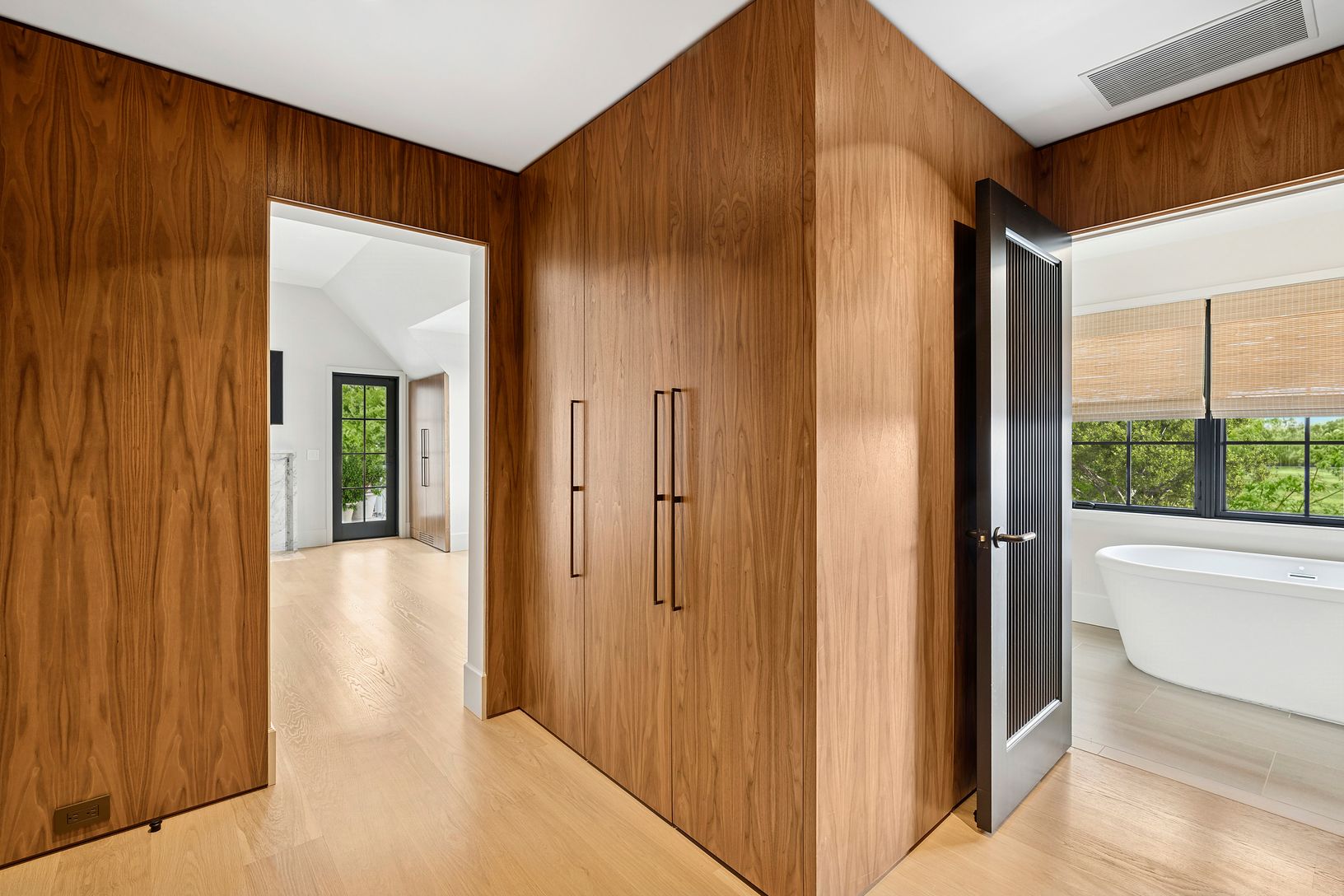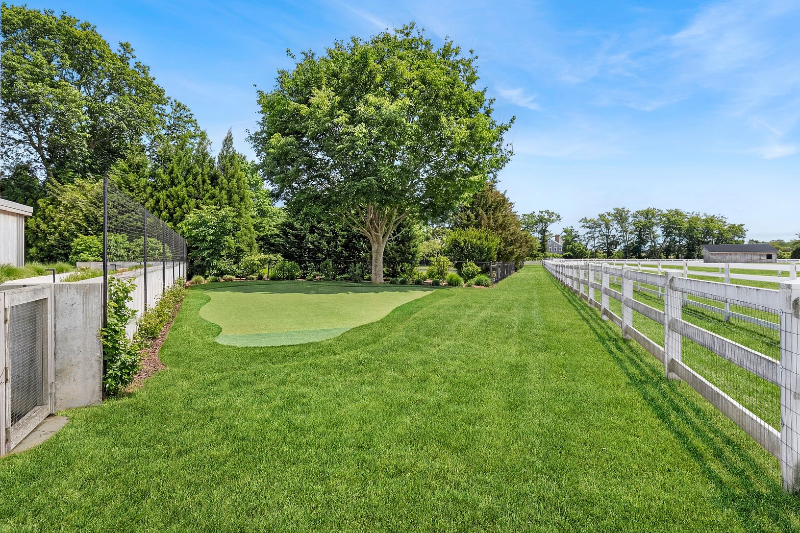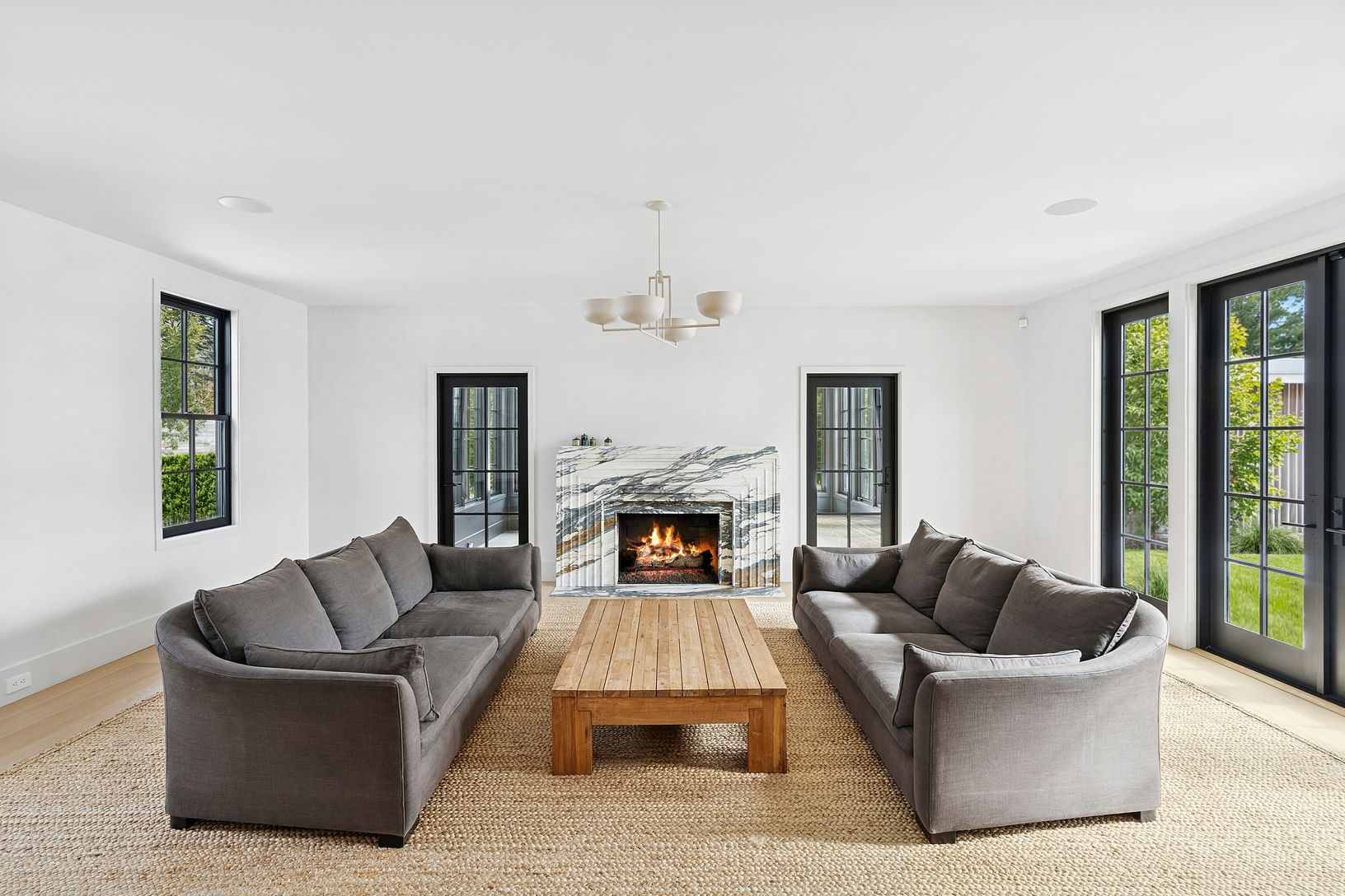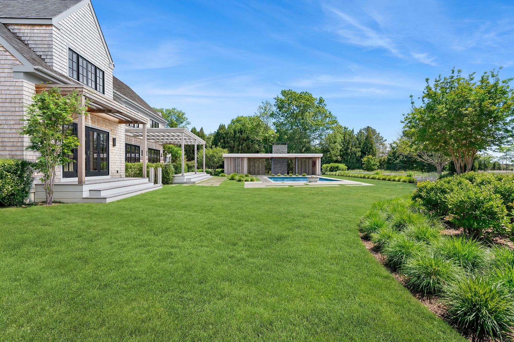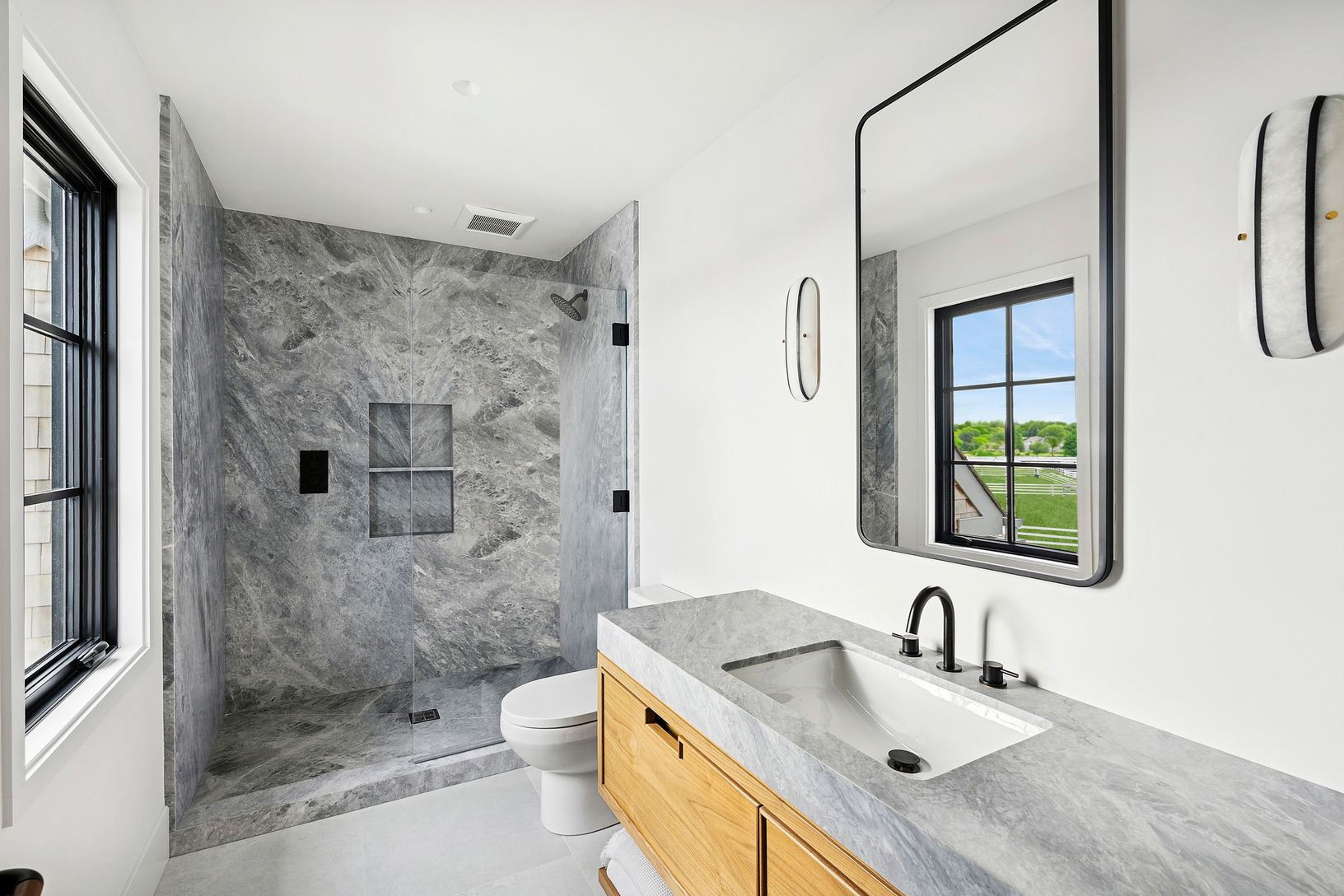 Overlooking 14 acres of agricultural reserve and open horse farm, this newly completed farmhouse delivers a rare summer offering in one of Wainscott's most coveted south-of-the-highway settings. Thoughtfully designed and impeccably executed, the home showcases exceptional craftsmanship and elevated finishes at every turn. A dramatic double-height foyer with limewash walls sets the tone, leading to a gracious living room with gas fireplace, sun